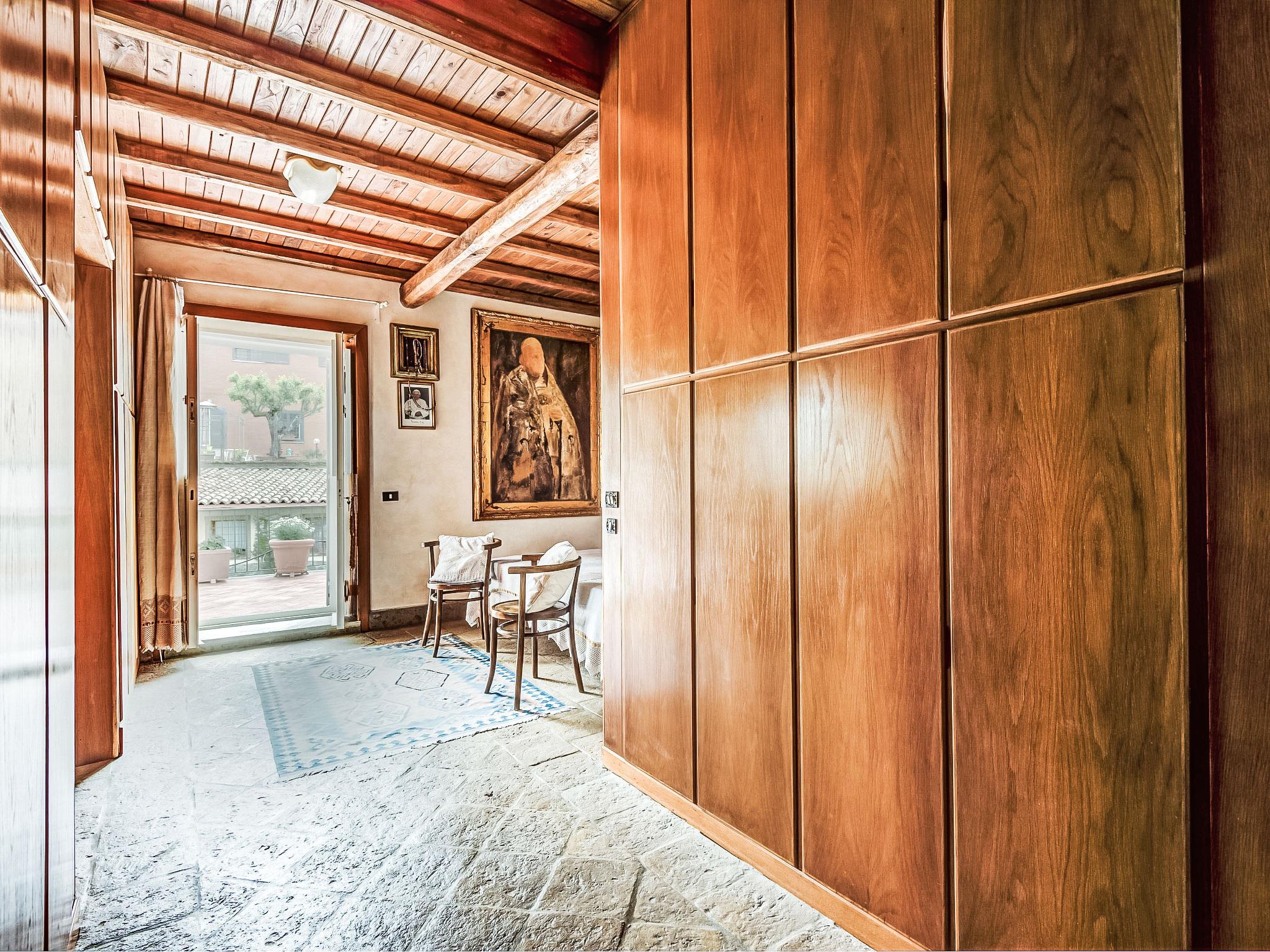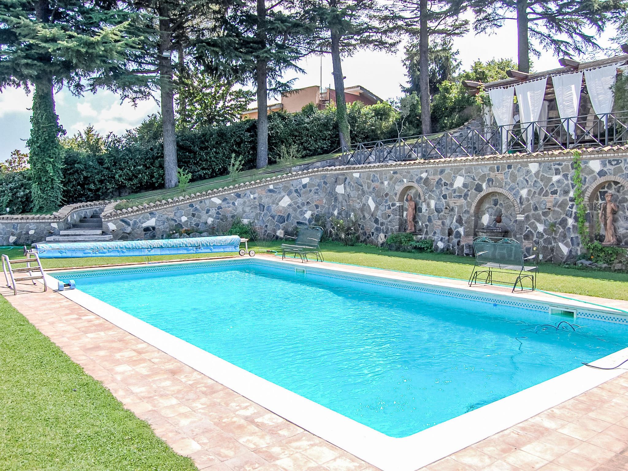 Beautiful villa "Vista da Rocca di Papa", 750 m a.s.l., 3 storeys, detached. Property composed of main house and outbuilding, in the resort 600 m from the centre of Rocca Di Papa, in a quiet, sunny, elevated position residential area (villas), 25 km from the sea. Private: large garden 4'000 m2 (fenced) with lawn and flowers, pond, swimming pool (12 x 6 m, depth 110 - 220 cm, seasonal availability: 01.May. - 15.Oct.) with salt water and shutter cover. WC in the pool area, pool house, patio, arbour (10 m2), terrace, garden furniture, barbecue, parking (for 3 cars) at the house. Grocery 600 m, supermarket 800 m, restaurant 700 m, bar 300 m, bus stop 100 m. Nearby attractions: Roma 30 km, Castel Gandolfo 8 km, Frascati 10 km, Anzio 40 km, Lido di Ostia 40 km, Rainbow magic Land 30 km. Well-known lakes can easily be reached: Lago di Albano 8 km, Lago di Nemi 11 km. Please note: car recommended. Groups of teenagers on request only. The owner does not accept any youth groups. The owner lives on the same property. Access to the pool and the private garden from the balcony and across a footbrige over a small residential street.