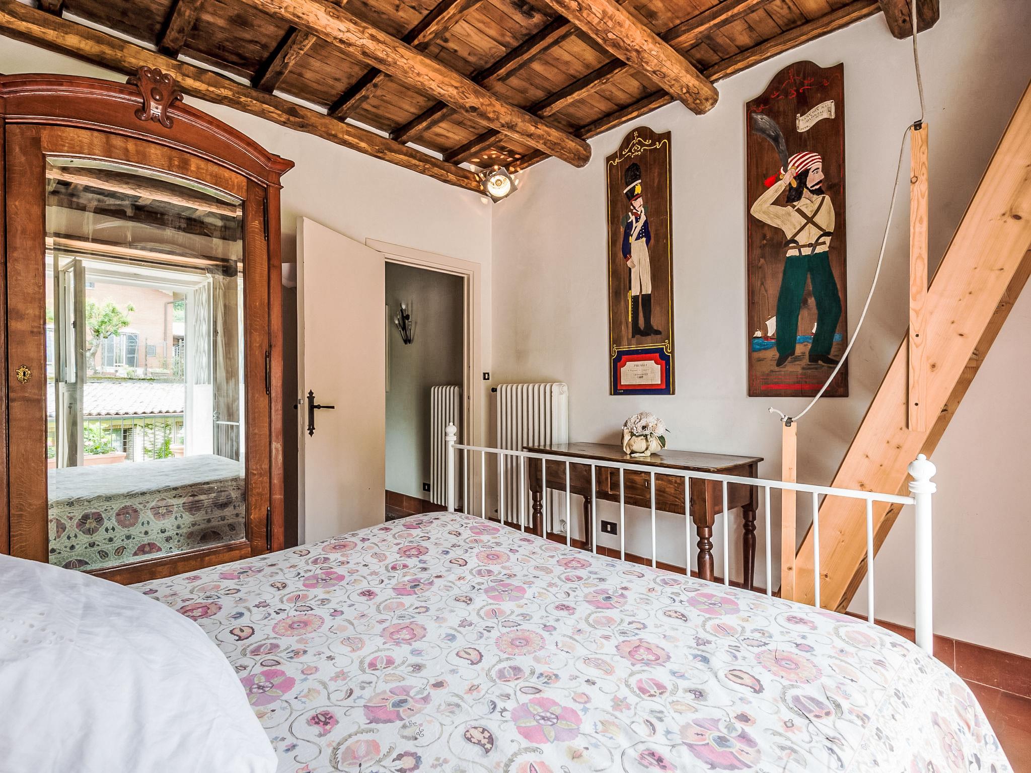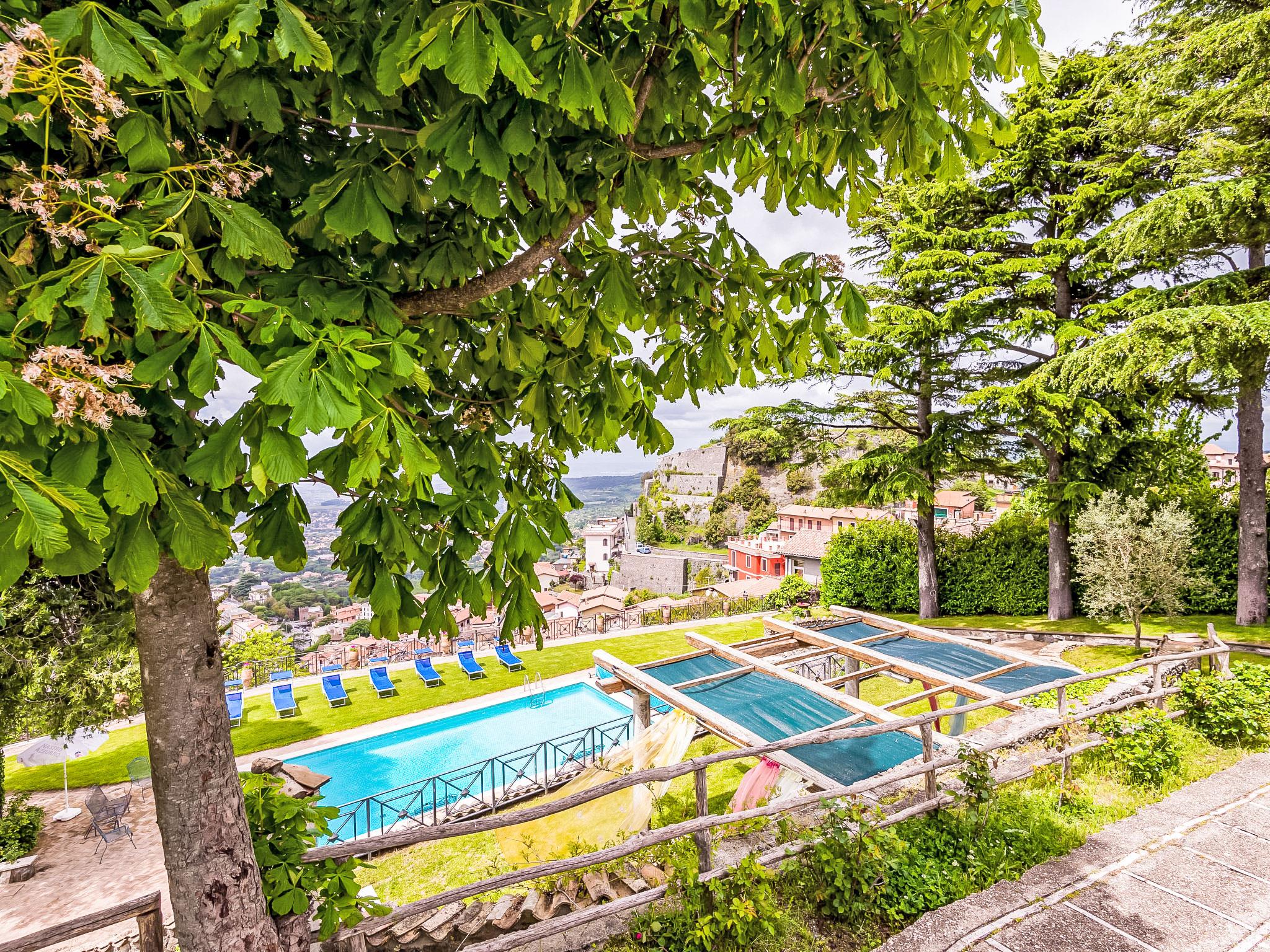 Beautiful villa "Vista da Rocca di Papa", 750 m a.s.l., 3 storeys, detached. Property composed of main house and outbuilding, in the resort 600 m from the centre of Rocca Di Papa, in a quiet, sunny, elevated position residential area (villas), 25 km from the sea. Private: large garden 4'000 m2 (fenced) with lawn and flowers, pond, swimming pool (12 x 6 m, depth 110 - 220 cm, seasonal availability: 01.May. - 15.Oct.) with salt water and shutter cover. WC in the pool area, pool house, patio, arbour (10 m2), terrace, garden furniture, barbecue, parking (for 3 cars) at the house. Grocery 600 m, supermarket 800 m, restaurant 700 m, bar 300 m, bus stop 100 m. Nearby attractions: Roma 30 km, Castel Gandolfo 8 km, Frascati 10 km, Anzio 40 km, Lido di Ostia 40 km, Rainbow magic Land 30 km. Well-known lakes can easily be reached: Lago di Albano 8 km, Lago di Nemi 11 km. Please note: car recommended. Groups of teenagers on request only. The owner does not accept any youth groups. The owner lives on the same property. Access to the pool and the private garden from the balcony and across a footbrige over a small residential street.