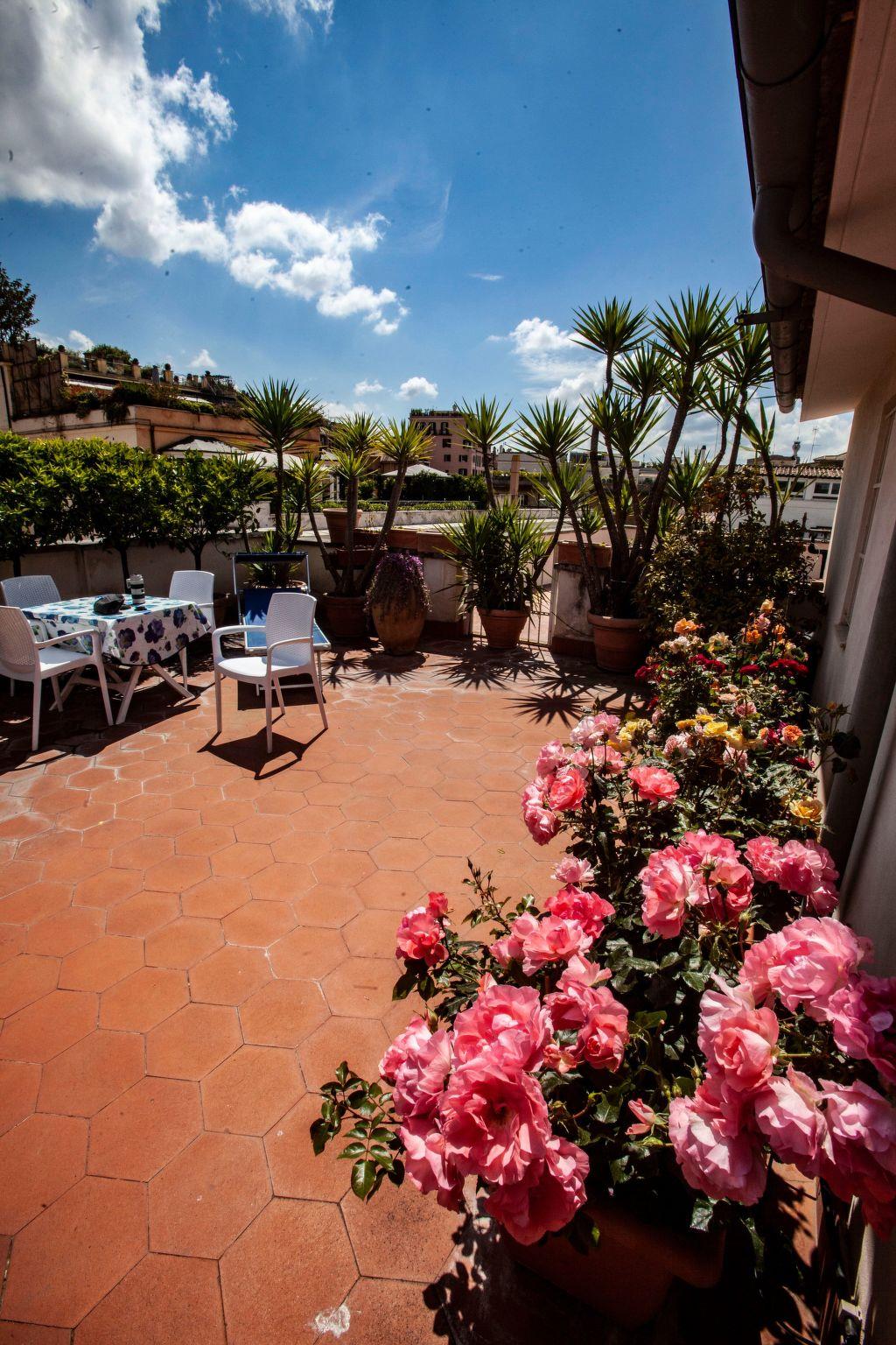 The sunny, well-kept 200 square metre roof terrace with many roses, lemon and orange trees, bougainvillea and fragrant lavender plants has a magnificent 360 degree view over Rome. It is located one floor above the holiday flat and is equipped with patio furniture and sun loungers for guests to relax on. The sunset with a view over Rome and St Peter's Basilica is a special experience. On New Year's Eve in Rome, the panorama from the picturesque roof terrace is unique. At midnight, you can see the fireworks from all over Rome.