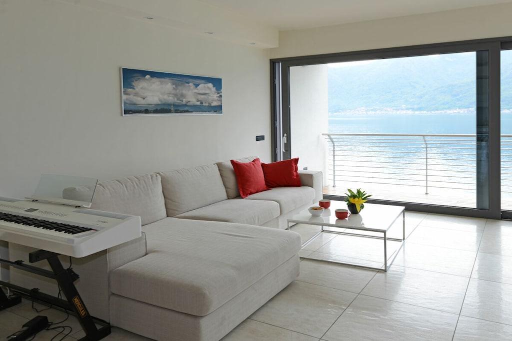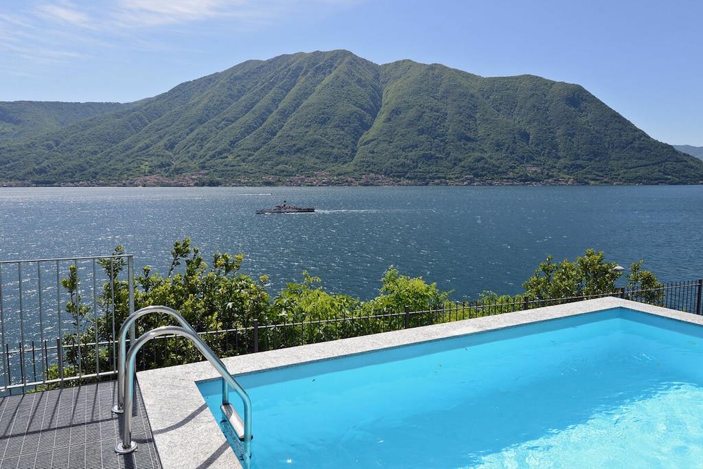 Das luxuriöse Appartment Barcarola erstreckt sich über 2 Ebenen und bietet mit seinem besonderen Ambiente den richtigen Rahmen für gelungene Ferien am Comer See. Die obere Ebene der Wohnung besteht aus dem lichtdurchfluteten Wohnraum - ganz in weiß gehalten - mit passend ausgesuchter Designerküche, einem großen Balkon mit beeindruckendem Seeblick sowie einem Schlafzimmer mit dazugehörigem schicken Bad. Eine interne Treppe führt nach unten. Dort sind dann ein weiteres Schlafzimmer mit Ausgang zum Garten, ein zweites Bad mit Sauna sowie der Zugang zum Poolbereich, dem Highlight dieser Wohnung: den Gästen steht ein privater Pool zur Verfügung umgeben von Holzdecks, mediterran bepflanztem Garten und sensationellem Blick auf dem Comer See. Hier können die Gäste ganz privat relaxen und die Sonne genießen. Ausstattung und Möblierung sind exclusiv, alles sehr schön hell und von modernem Design. Im Wohnraum wird eine Wand durch ein Original-Fresco einer Künstlerin aus Verona geziert, was dem Raum eine besondere Atmosphäre verleiht. Weitere Originalkunstwerke erfreuen das Auge. Die Gäste genießen die Sonne auf dem Balkon oder auch mal ein schattiges Plätzchen in einem der privaten Gartenanteile mit den Holzdecks, die vom Schlafzimmer aus zu erreichen sind.