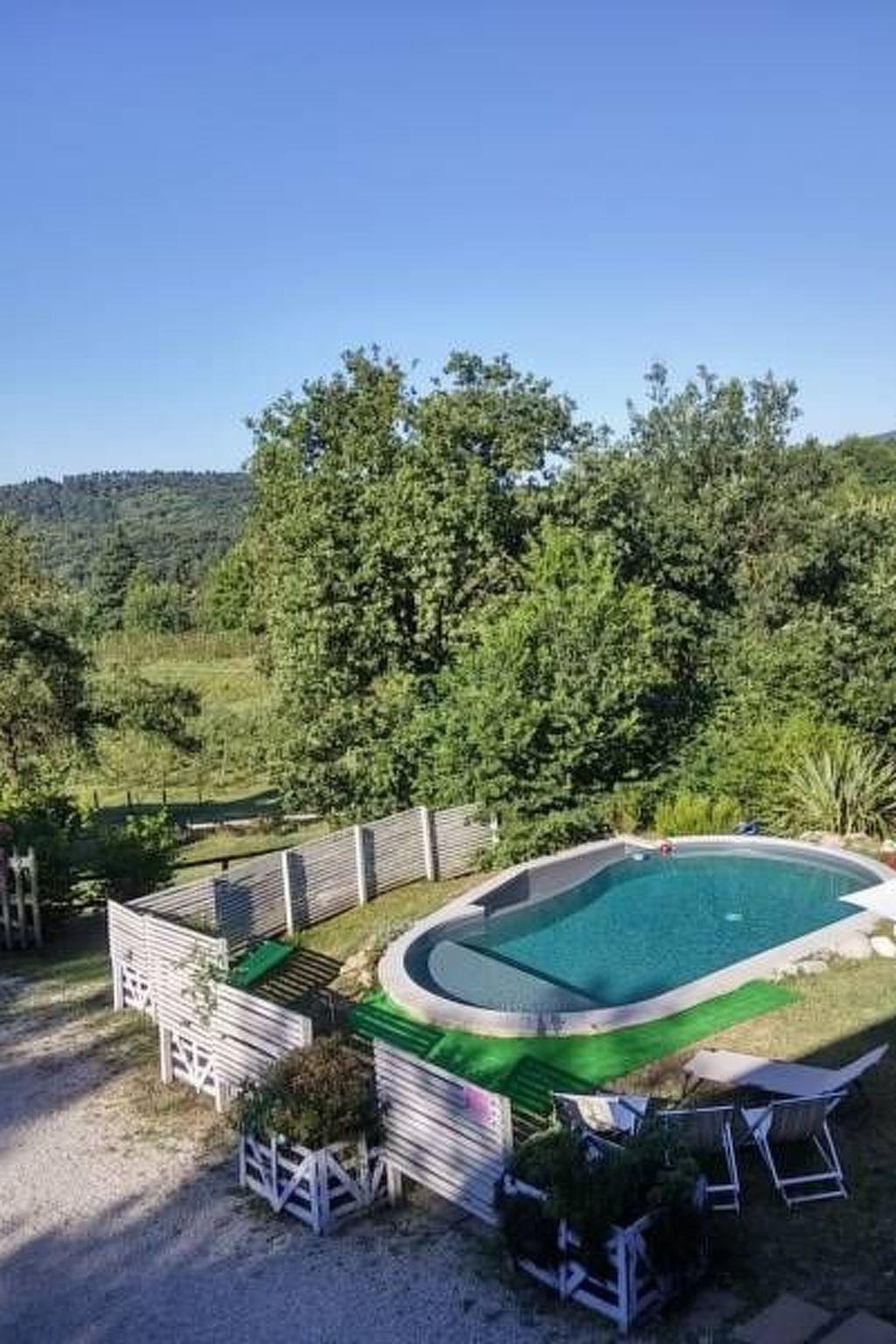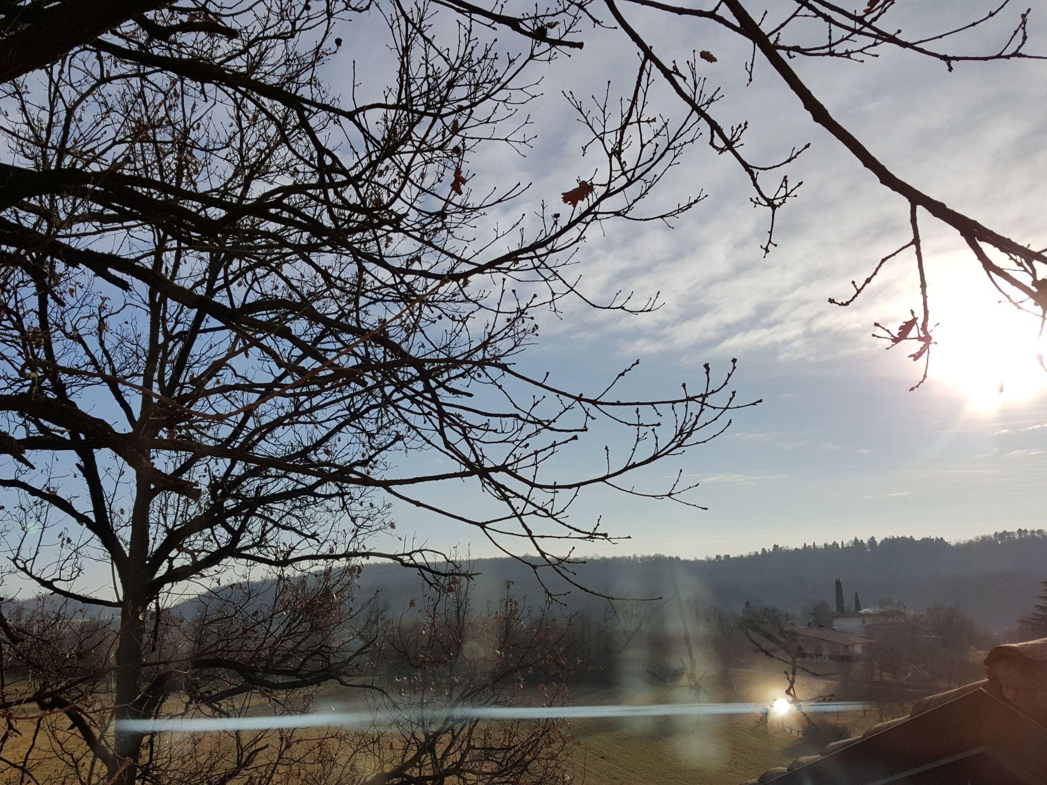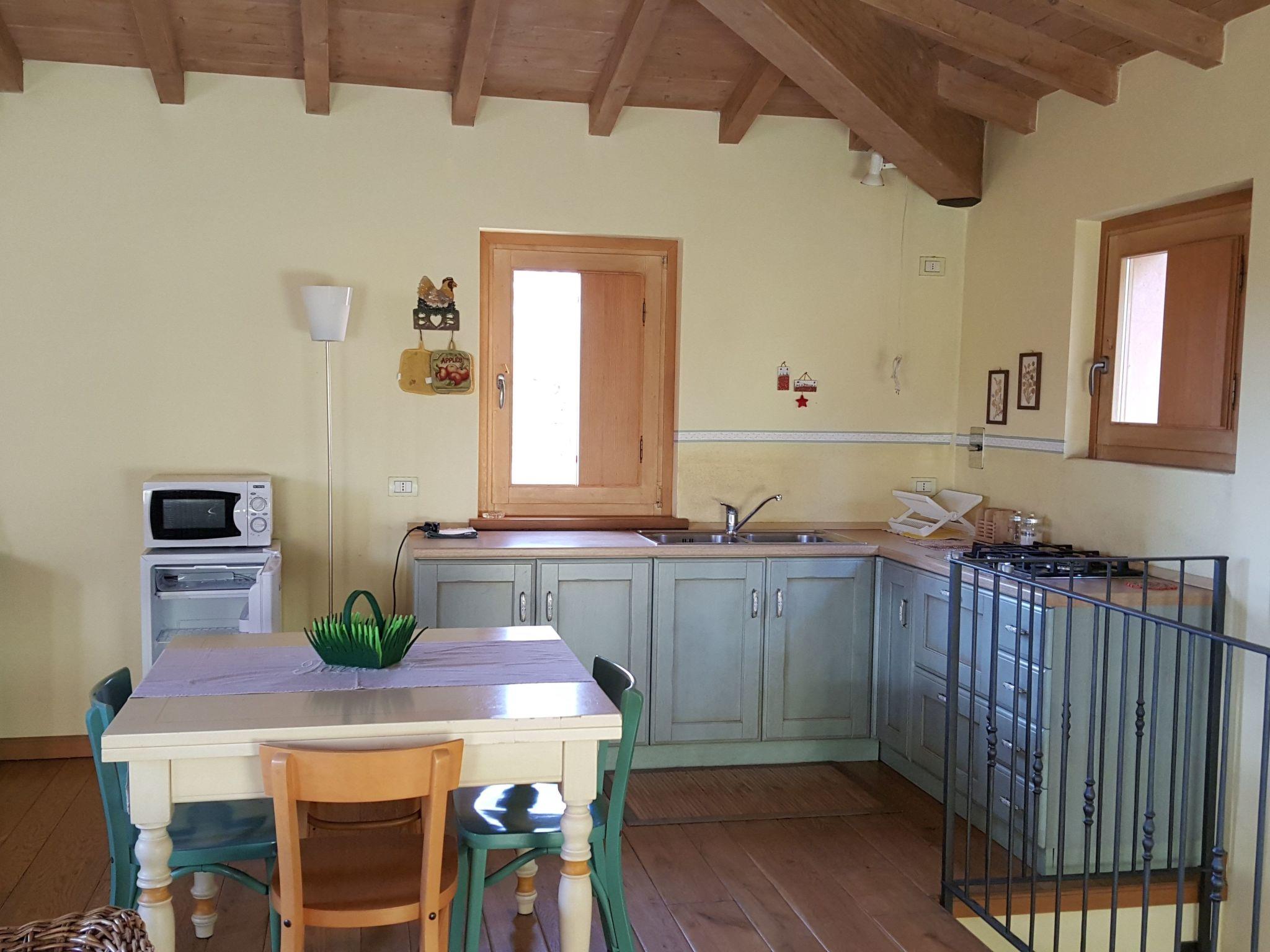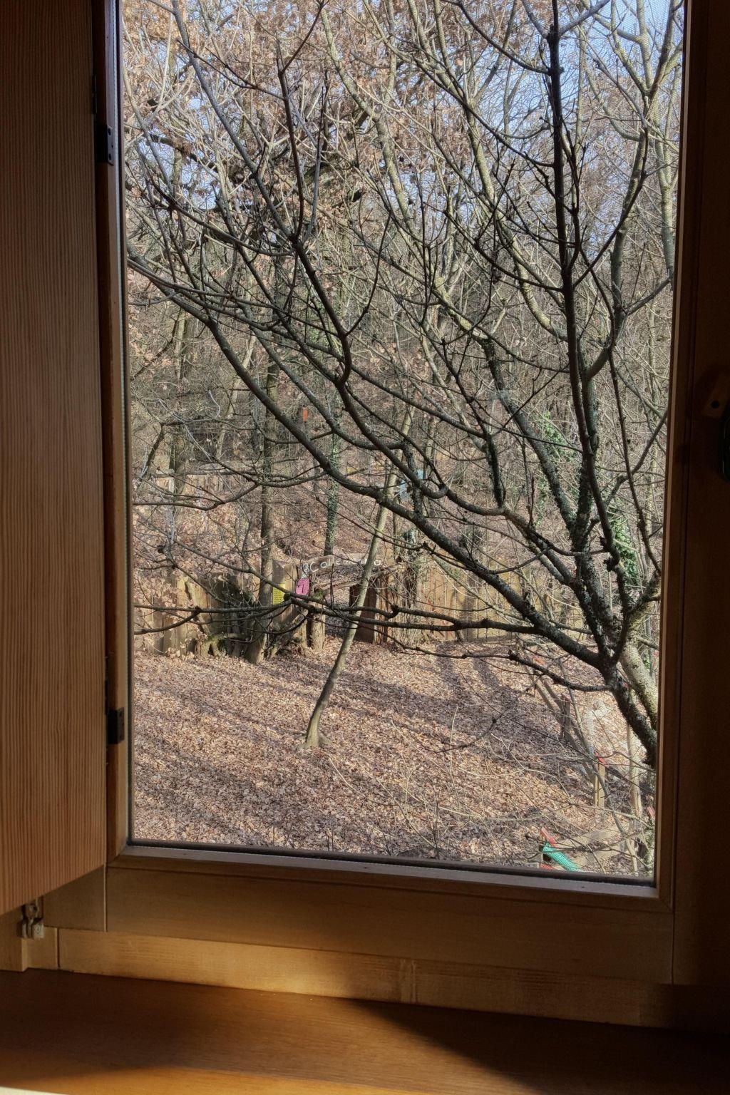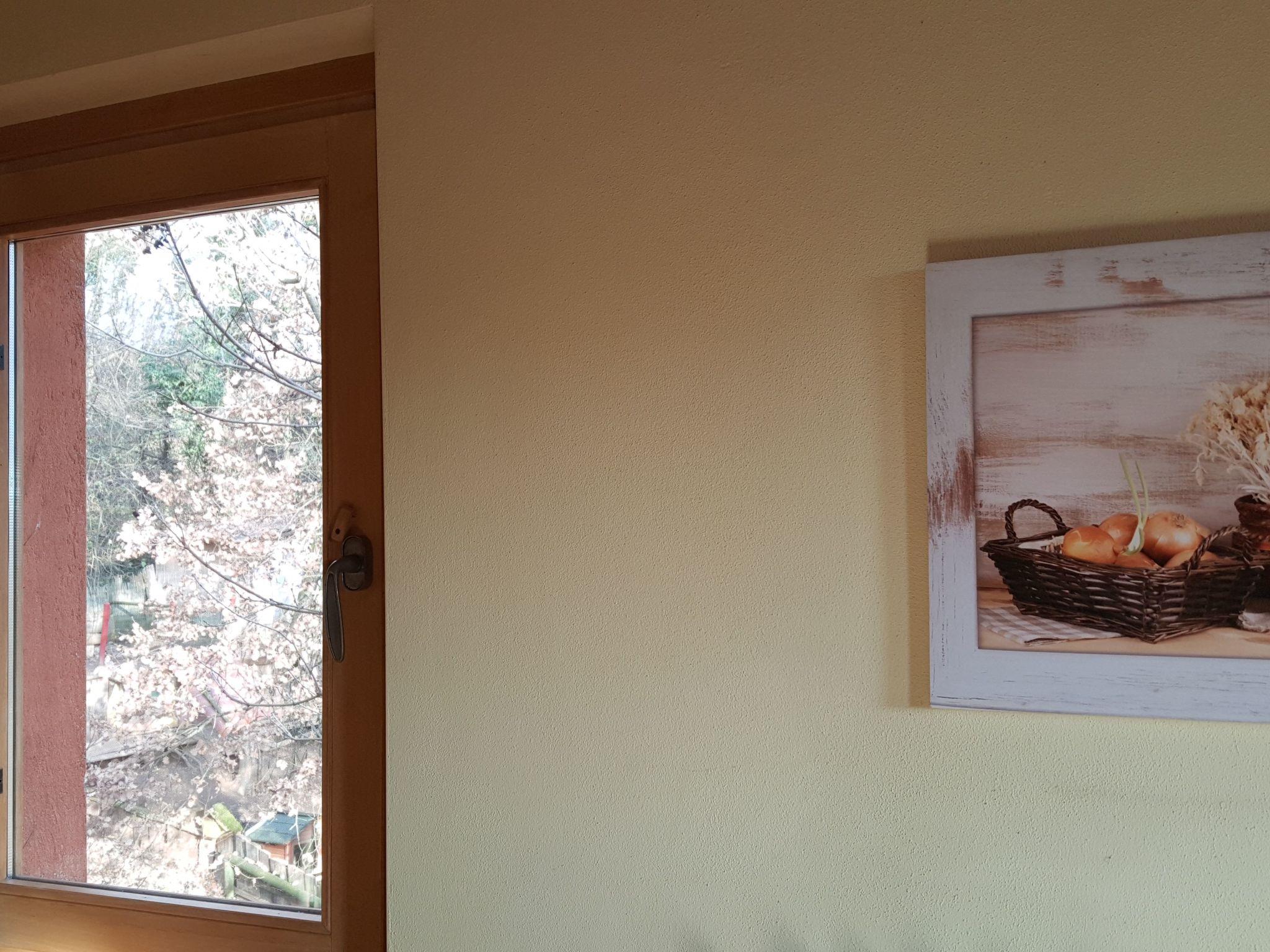 The flat has a separate entrance and is on two levels. On the ground floor there is a bedroom of approximately 20 m² with a double bed and a single bed. On request it is possible to add a single bed or a cot (for children up to 2 years old). Next to the bedroom is the bathroom with shower, bidet, toilet and washbasin. There is a small storage room under the stairs. The floors are made of handmade clay tiles. On the first floor is the living room with kitchenette and dining table. The kitchenette is equipped with a gas cooker, microwave oven, toaster and refrigerator with freezer. The living area consists of a double sofa bed, two armchairs, a coffee table and a television. The floors on the first floor are made of antique oak. The furniture is rather simple and in pastel colours. Every wall of the room has windows overlooking the moraine hills.