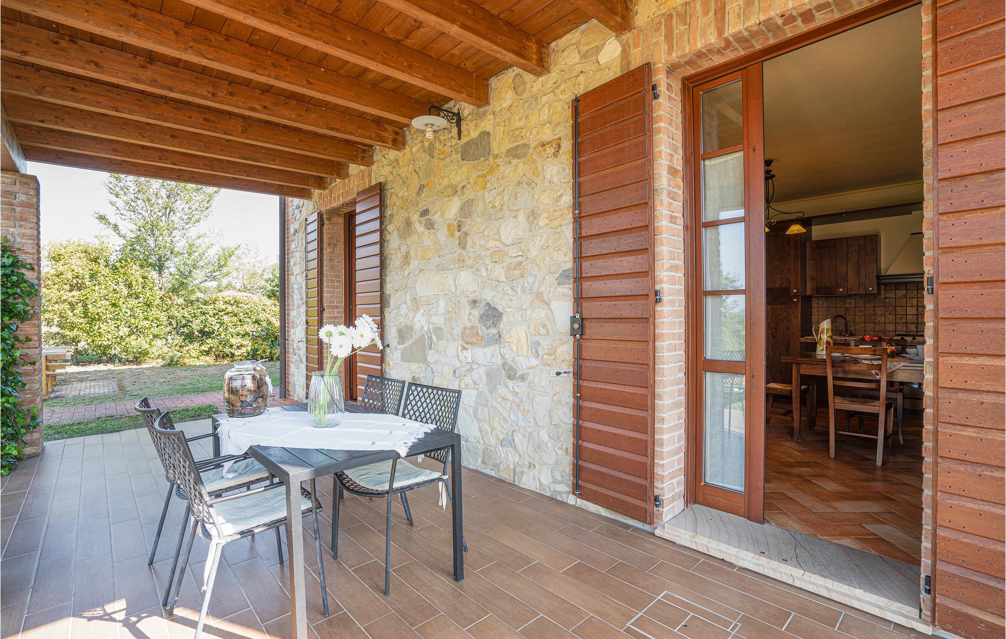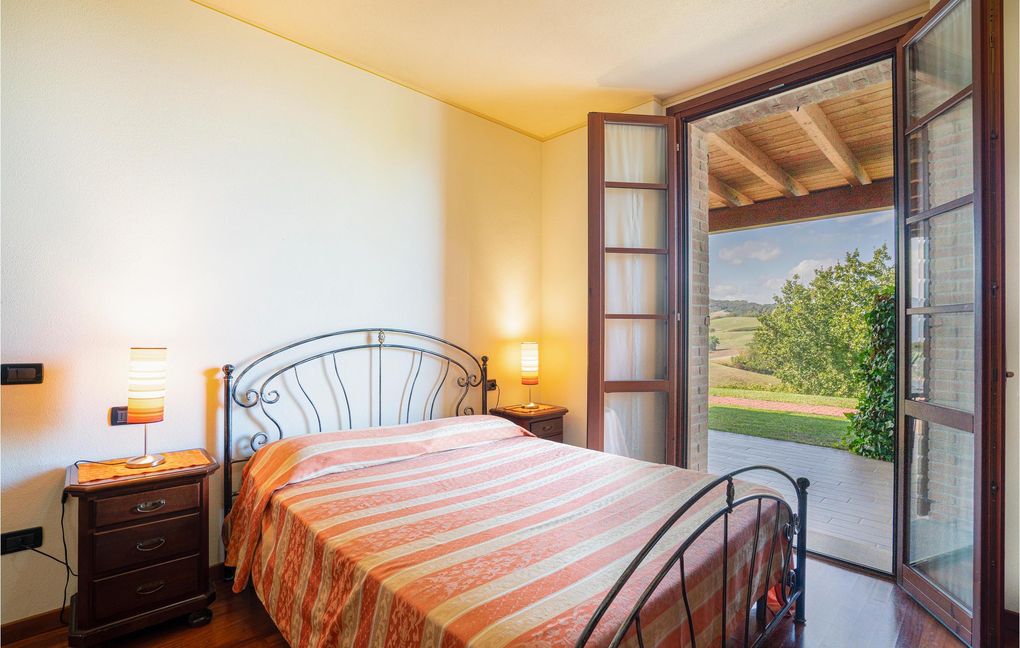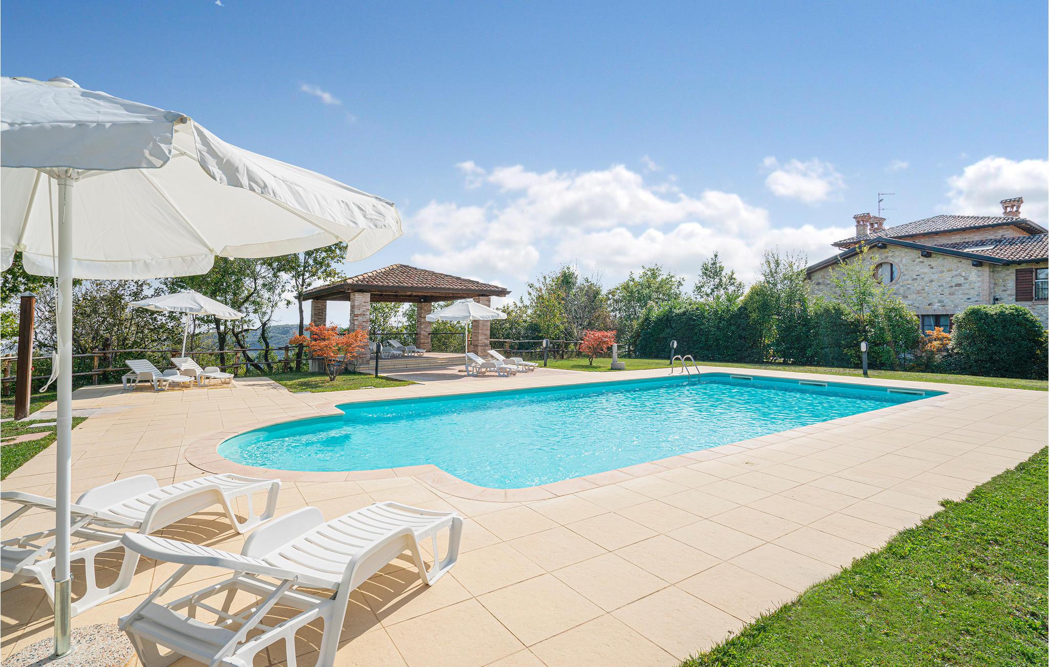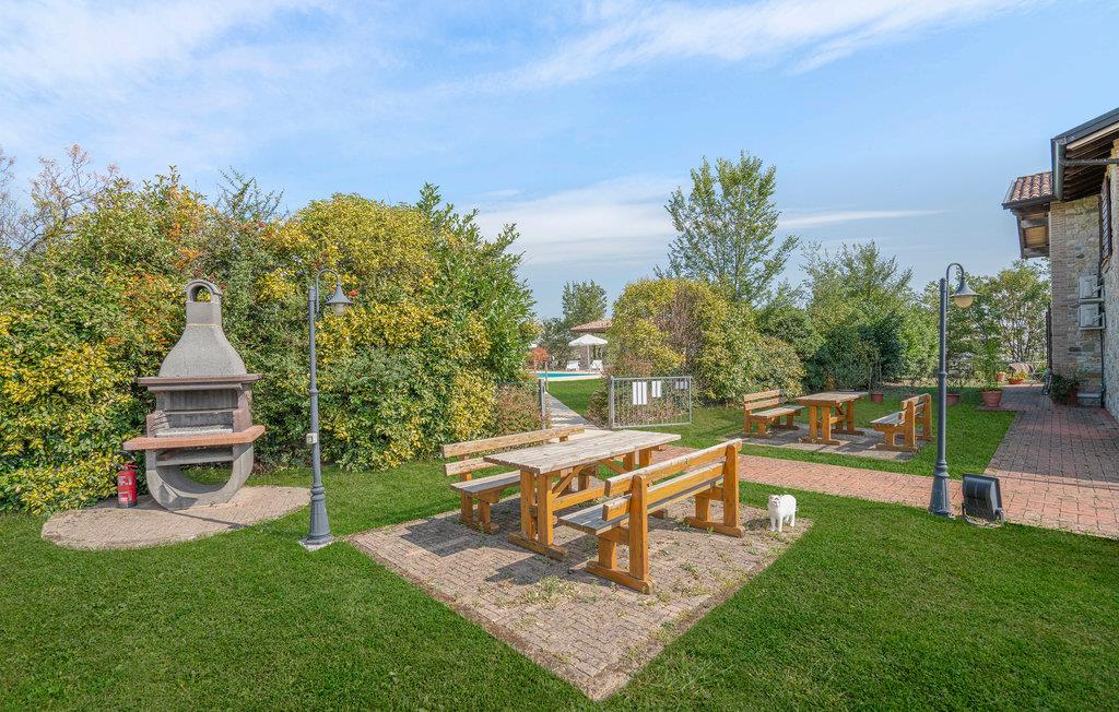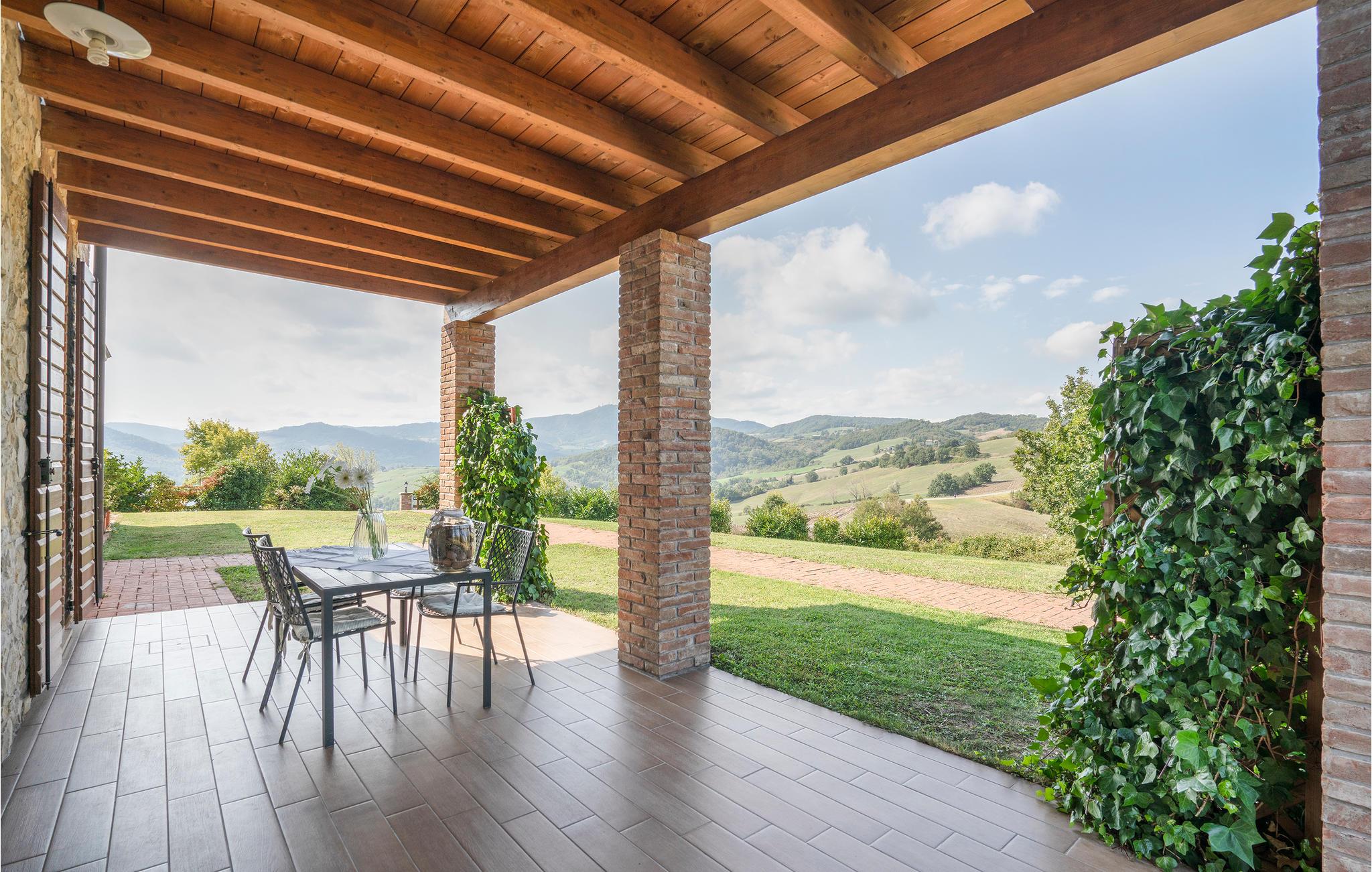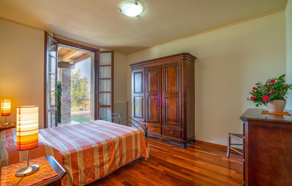 Charmerende landhus med pool (rummer i alt seks lejligheder, se også IEC103) omgivet af de smukke emilianske bakker og kun tre km fra de berømte termer i Salsomaggiore. Ferieboligen ligger i stueplan med separat indgang, hvor den overdækkede terrasse også ligger, med skøn udsigt over landskabet og hvor I kan spise under åben himmel. Til gæsternes fælles brug er der en stor have hvor I kan tage solbad og en pool. Omgivelserne er ideelle, når I vil smage på de typiske regionale kvalitetsprodukter: parmesanost, pølser og vin. Elskere af kunst og kultur har kun tre km til ’ruten med hertugdømmernes slotte’ med den historiske borg Scipione (11. århundrede), hvor fresker og indretning fra det 17. århundrede er godt vedligeholdt. Fra ejendommen fører flere vandrestier til Via Francigena, mindre end to kilometer væk ligger naturparken Storione, hvor I kan betragte fugle. Kun 32 km til byen Parma, som er musikkens og teatrenes by, med Toscaninis fødested og museum „ Casa del Suono“ og ikke mindst Teatro Regio, som blev bygget på kejserinde Maria Luigia ønsnke og indviet i 1829, der stadig regnes som et af nutidens mest berømte teatre. I landhusets restaurant kan I smage lokale retter lørdag aften og søndag middag. Ellers benyttes restauranten til fester og andre store arrangementer. De sidste 200 meter af den asfalterede tilkørsel er delvis ujævn.