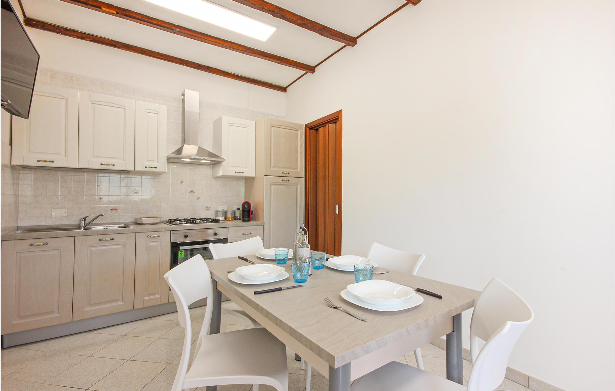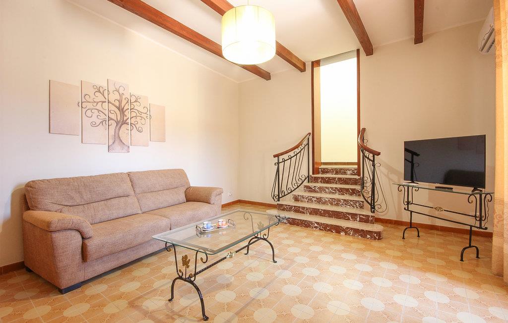 Huset afspejler stedets typiske huse. Efter indgangen fører trappen til opholdsstue med sovesofa, tv og badeværelse. Der er også en lang korridor med et soveværelse med en dobbeltseng og et soveværelse med to enkeltsenge. Den anden trappe fører til køkkenet, stuen og badeværelset, som er meget store og lyse. Udenfor finder du en overdækket terrasse og en anden tilstødende udendørs terrasse. Huset har aircondition og er udstyret med gratis WiFi for gæsterne.