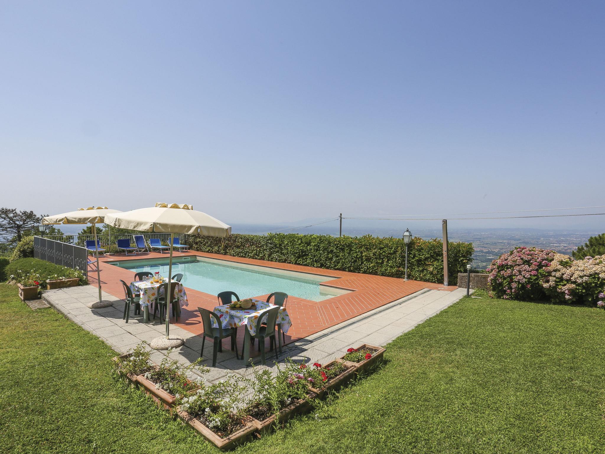 Large manor house "Villa Le Castagne", 400 m a.s.l., detached. 4 km from the centre of San Baronto, 15 km from the centre of Pistoia, 52 km from the centre of Florenz, in an elevated position on top of a hill, in the countryside. Private: property 4 ha, large, well-kept garden (not fenced) with lawn and trees, lawn for sunbathing, swimming pool fenced (10 x 5 m, depth 140 - 140 cm, seasonal availability: 10.Apr. - 09.Oct.) with internal staircase. In the house: heating available only from 01.Nov. - 15.Apr. (extra). 500 m long bumpy motor access to the house. Stepped path to the house. Parking (for 3 cars) on the premises. Shop 4 km, supermarket 5 km, bus stop 6 km. Golf course (18 hole) 5 km, tennis 5 km. Cooking courses bookable on request. Local sale of farm products.