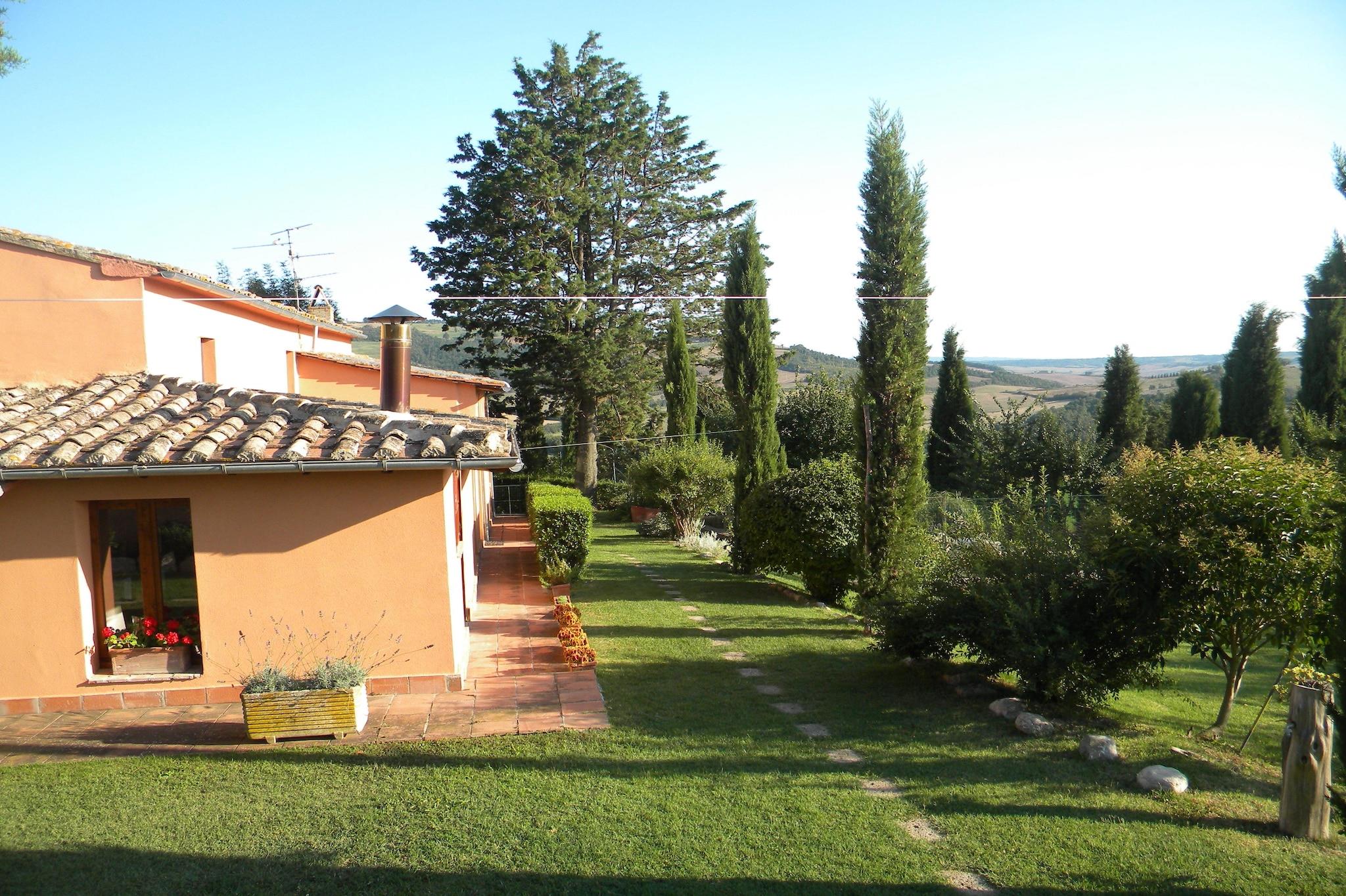 Beliggende i hjertet af Toscanas bølgende bakker tilbyder dette kæledyrsvenlige feriehus en fredfyldt flugt for op til seks gæster, der blander rustik charme med moderne bekvemmeligheder. Stueetagen byder på et indbydende åbent køkken med induktionskomfur og køle-fryseskab, perfekt til at tilberede lokale delikatesser. Det rummelige opholds- og spiseområde omfatter et satellit-tv og en hyggelig dobbelt sovesofa, der skaber de perfekte rammer for afslapning. To smukt møblerede soveværelser - det ene med eget badeværelse udstyret med bruser, håndvask, toilet og bidet - sikrer privatliv og komfort, mens et ekstra badeværelse giver ekstra bekvemmelighed. Centralvarme gør denne bolig til et glimrende valg til helårsophold. Den ekspansive fælles have, der strækker sig over 1.000 m², byder på en fantastisk udsigt over landskabet, mens den store swimmingpool (12 x 6 m), der er åben fra maj til september, giver et forfriskende tilflugtssted. Aktive rejsende kan nyde boulebanen, legeredskaber og bordtennis eller begive sig ud på ridning kun 2 km væk. Golfentusiaster vil finde en naturskøn bane inden for 20 km, mens historieelskere kan udforske de charmerende nærliggende byer Siena (103 km), Monteriggioni (121 km) og Firenze (148 km), alle rige på kultur og betagende arkitektur. Gæsterne kan nyde autentiske toscanske retter på restauranter, der ligger kun 300 meter væk, og nyde traditionelle retter parret med regionale vine. Offentlig transport, bekvemt placeret 200 meter fra boligen, sikrer nem adgang til omkringliggende landsbyer og naturlige vartegn. Uanset om du slapper af ved poolen, opdager ikoniske byer eller fordyber dig i de pulserende lokale smagsoplevelser, tilbyder dette feriehus et uforglemmeligt toscansk tilflugtssted.