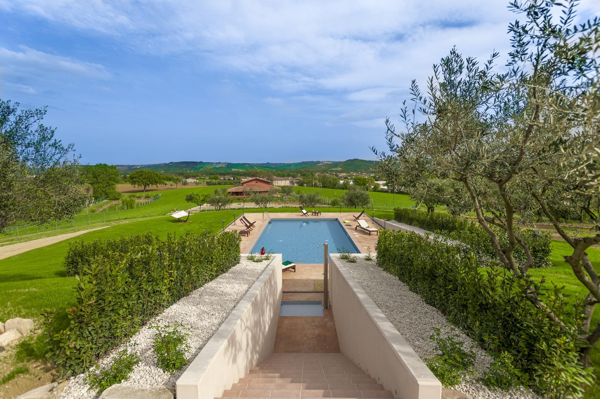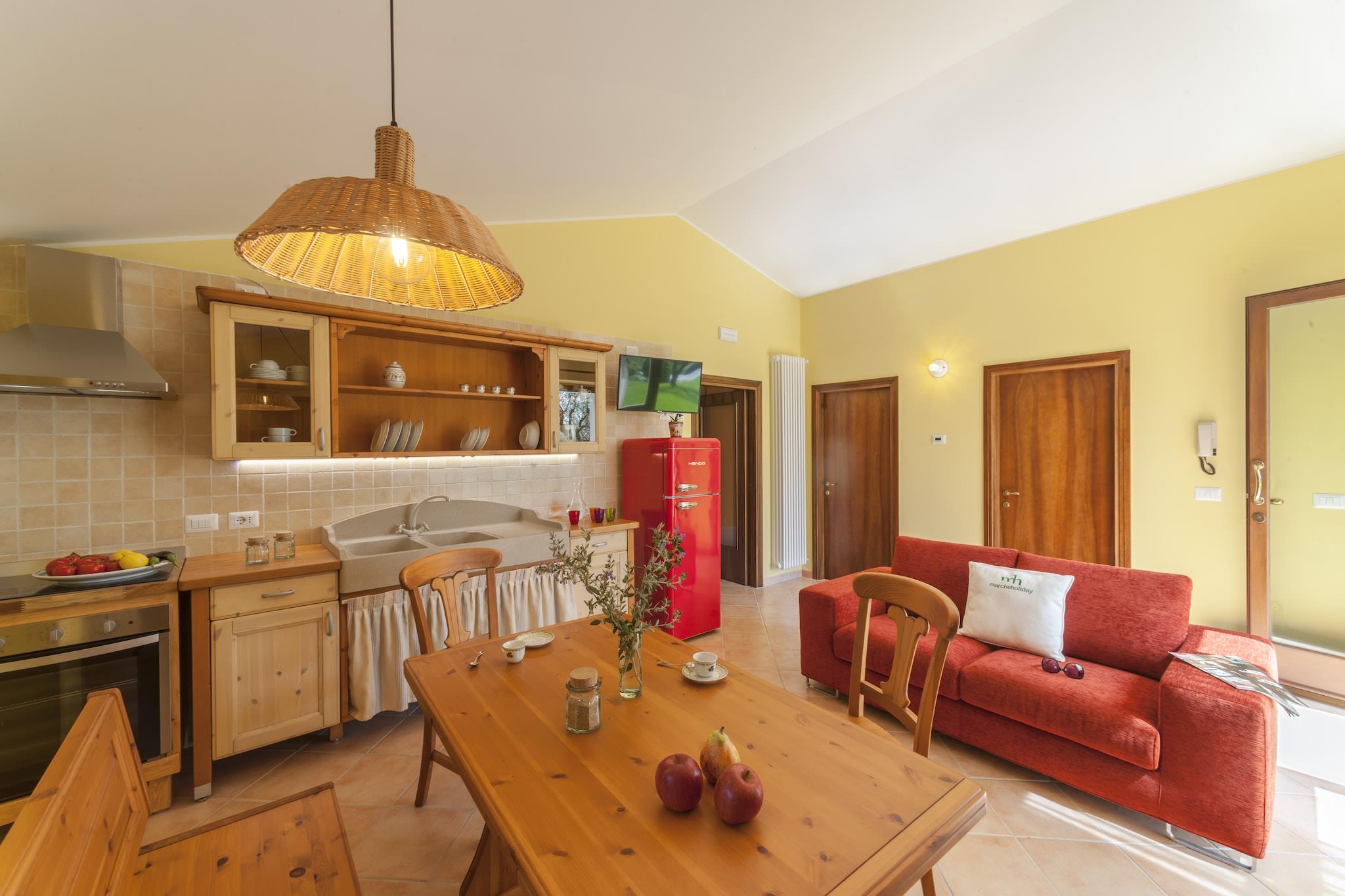 La CantinAia er et smukt bondegård beliggende på en bakke med udsigt over Adriaterhavet, som ligger mindre end 9 kilometer væk. Ejendommen består af det største bondegård, hvor der er en lejlighed beboet af det unge par, der ejer ejendommen, en anden lejlighed til ferieudlejning og en afhængighed, hvor en anden lejlighed er oprettet for gæster. Hele ejendommen er omgivet af en storslået have og en stor olivenlund; der er endda en lille yndefuld sø inden for gåafstand. Swimmingpoolen og det store soldæk tilbyder en vidunderlig udsigt over dalen, der strækker sig til havet. Den afhængighed, der tager navnet på la Cova, består af et stue-køkken, et soveværelse med dobbeltseng, et soveværelse med dobbeltseng og et badeværelse med bruser . Der er et havepavillon med udendørs bord og stole og et afslapningsområde med sofaer til rådighed for gæsterne i denne lejlighed. Den anden lejlighed, der ligger inde i bondegården og kaldes La Botte, har et opholdsstue-køkkenområde, et soveværelse med dobbeltseng, et soveværelse med dobbeltseng, et badeværelse med bruser. En stor veranda er indrettet med et bord og stole og sofaer, så gæsterne frit kan nyde det udendørs. Bondegården ligger i kommunen San Costanzo og ligger kun 3 kilometer væk fra den smukke by Mondolfo; I begge byer kan du finde alle de vigtigste tjenester såsom butikker, barer osv. På cirka 8 kilometer kan du nå Marotta og Adriaterhavet, hvor der er smukke sandstrande, fremragende fiskerestauranter, underholdningssteder, cykelstier og mange aktiviteter, festivaler og begivenheder hele året rundt. For vinelskere i de omkringliggende bakker er der mange fremragende vingårde, hvor du kan smage eller købe de bedste vine og lokale produkter. Byerne Fano og Senigallia ligger cirka 15 kilometer fra CantinAia og er to populære turistmål for havelskere, men også for kultur og historie takket være deres smukke historiske centre. Urbino, hovedstaden i renæssancen og UNESCO, kan nås med bil i abo
