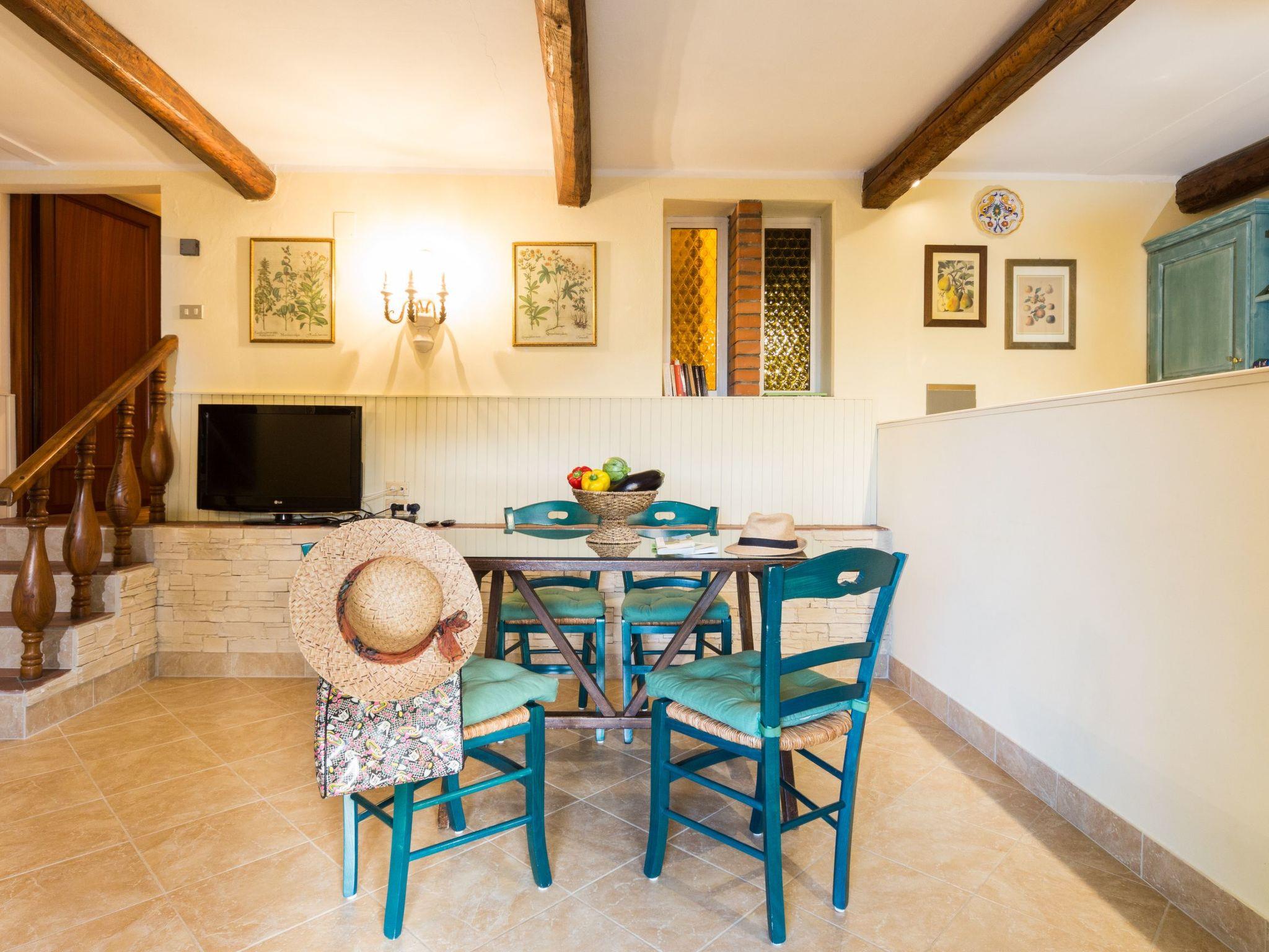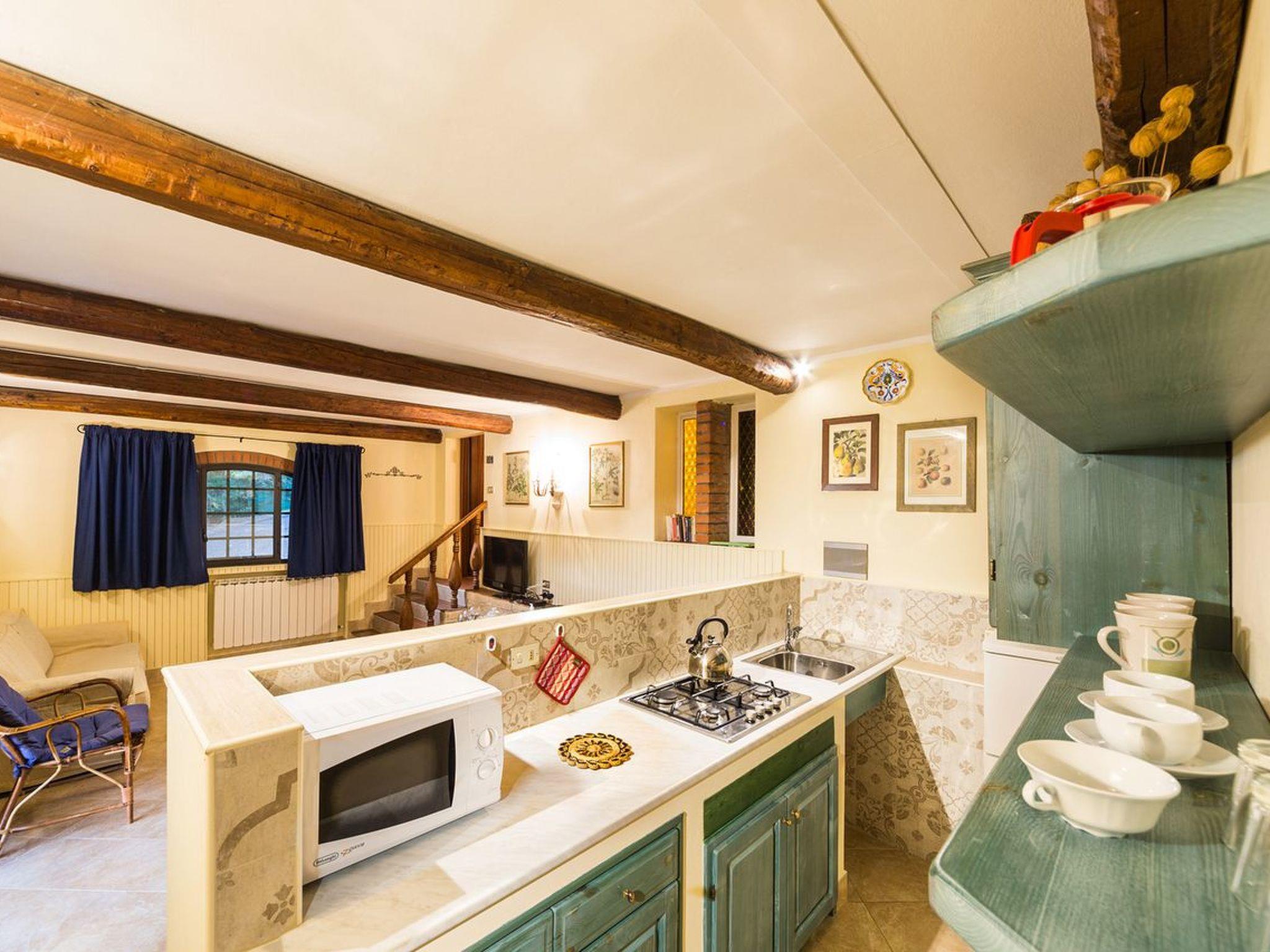 Ground floor accommodation, 43 m²; living/dining room (satellite TV) with kitchenette (2 burners, microwave), bedroom (height 2 m) with double bed, shower with WC, equipped private outdoor area; for 2 persons. Air-conditioning in the living room, which works well for the entire'appartamento.