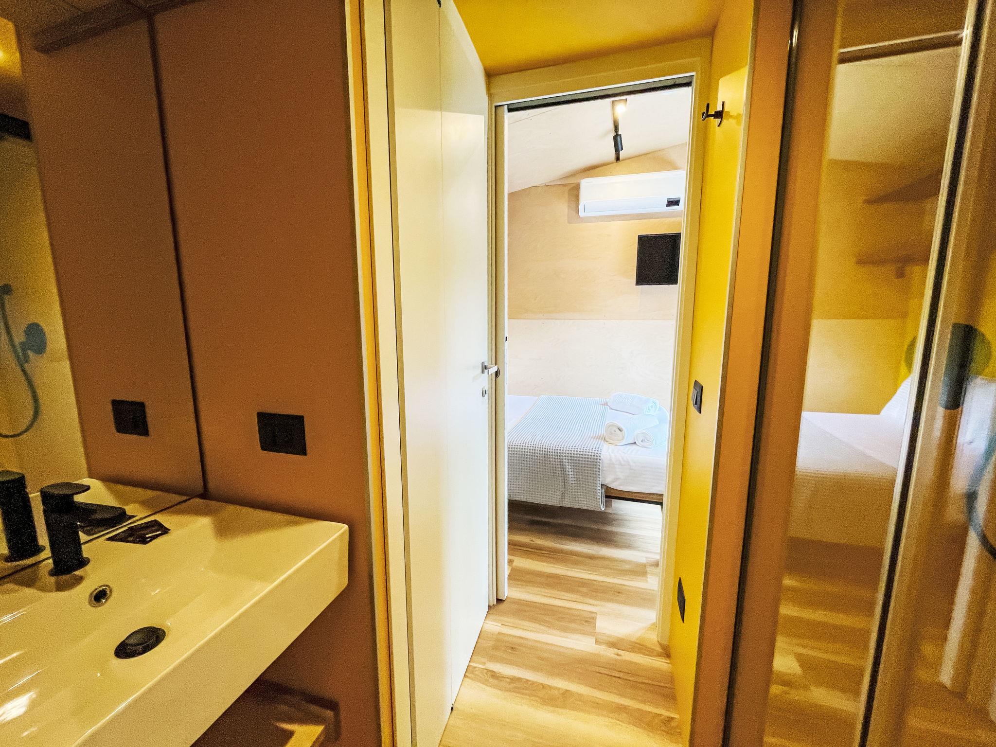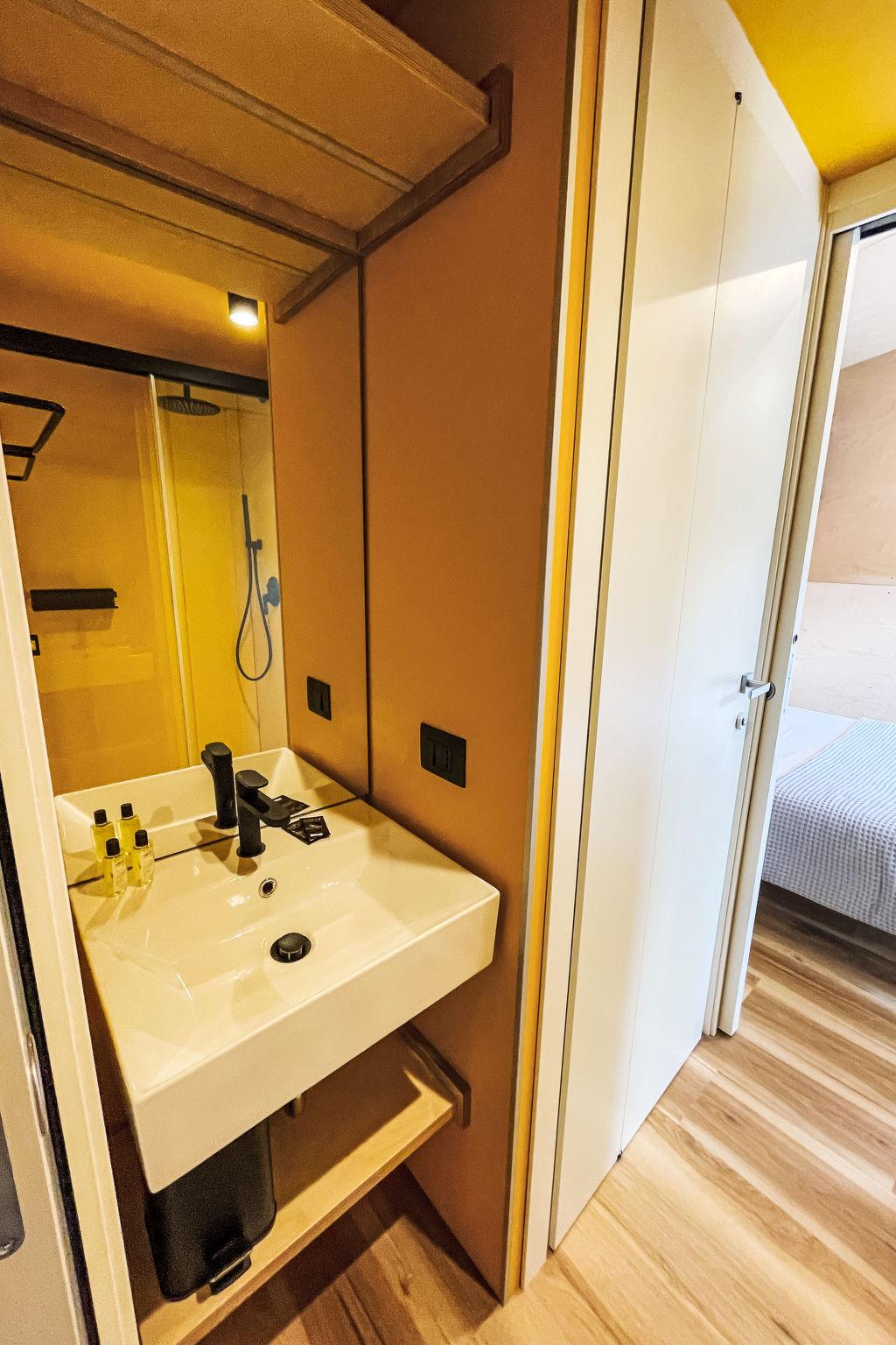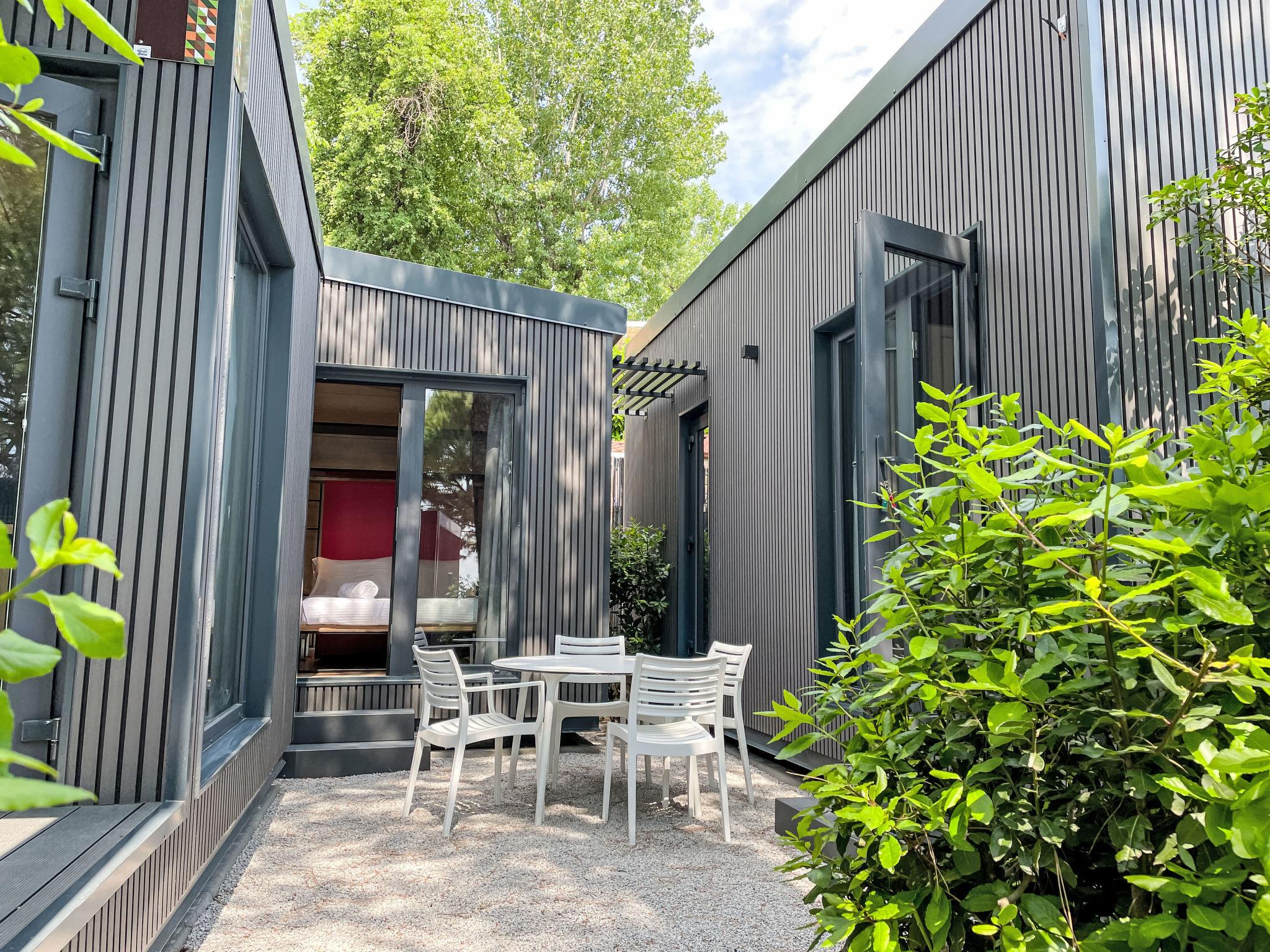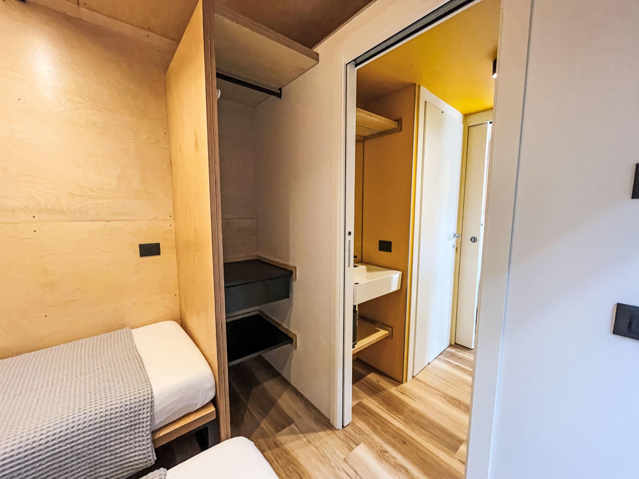 "Lodge 7", 4-room mobile home 51 m2. Modern furnishings: living/dining room with dining nook and digital TV. Exit to the terrace. 1 room with 1 french bed (140 cm), shower/WC. 1 double bedroom with 1 french bed (140 cm). 1 room with 2 beds (70 cm), 1 x 1 bunk beds (70 cm, length 170 cm). Kitchenette (4 induction hot plates). Shower/WC. Air-conditioning, forced-air heating. Terrace roofed. Terrace furniture. Facilities: baby cot (extra). Parking (1 car). Please note: non-smokers only. Please note: The residential unit consists of 3 separate residential modules with a small plot of land between the modules. Module 1: Living/dining room with kitchenette and covered terrace. Module 2: Double room with shower/WC. Module 3: Double room. Bedroom with 3 beds. Shower/WC accessible from both rooms. Bed layout is flexible. There are more sleeping options available than the maximum number of people allowed which may, however, not be exceeded. IT017171B1ZJWA3YLE