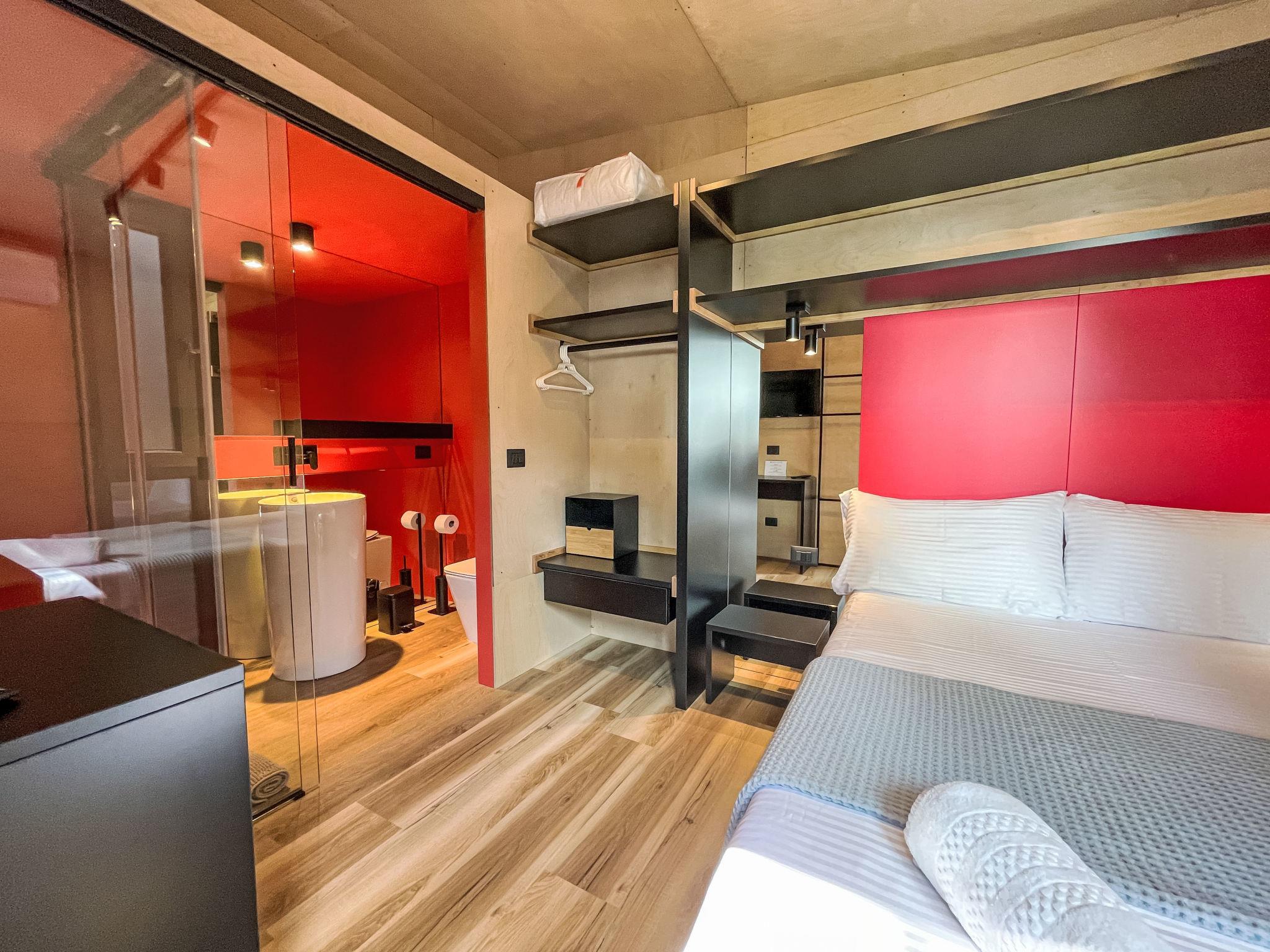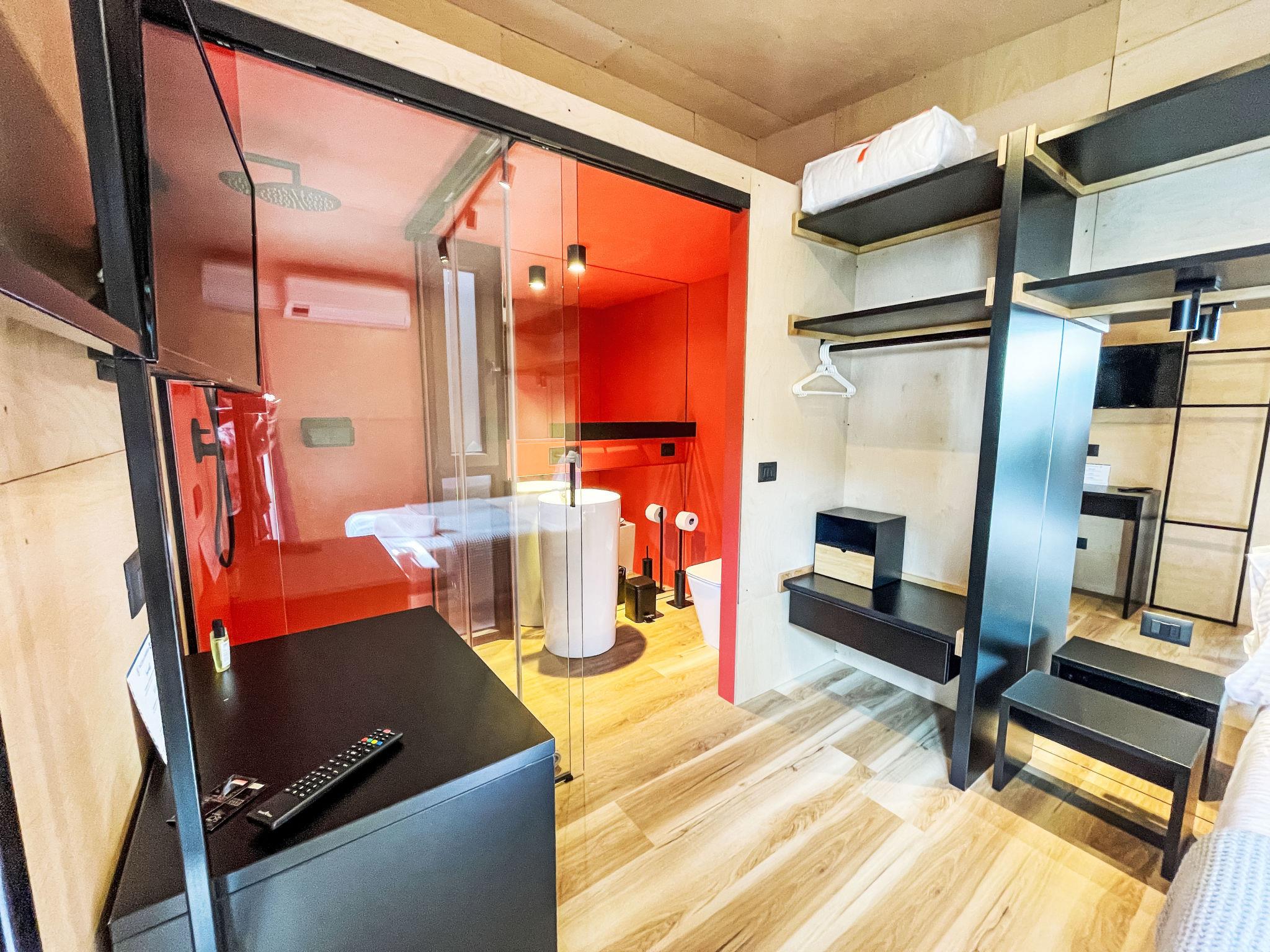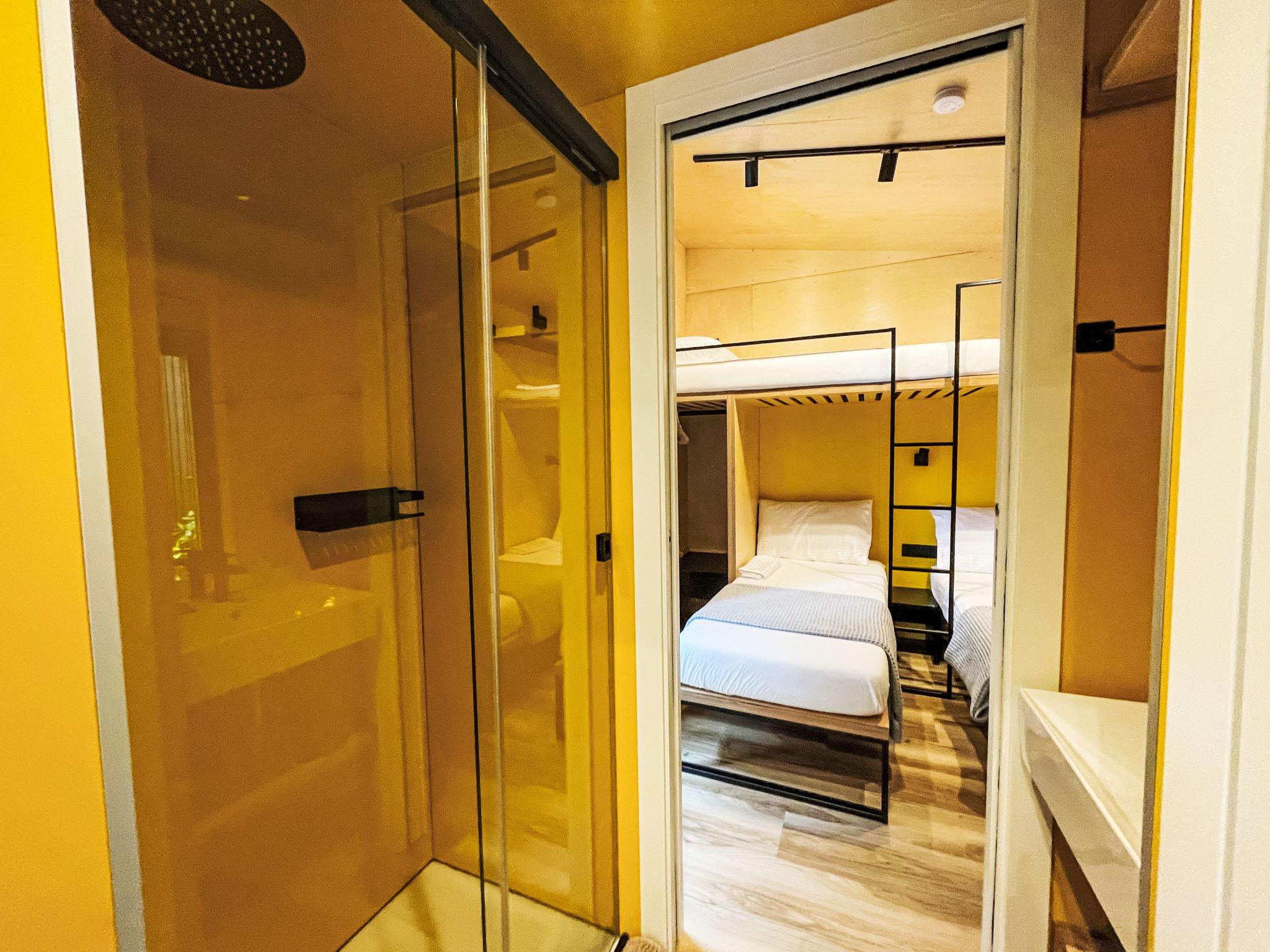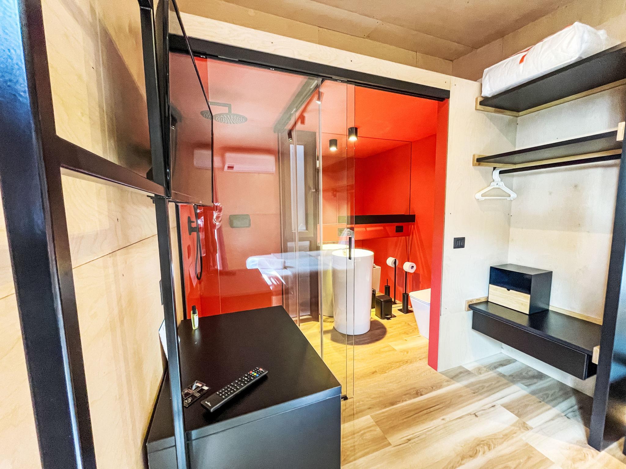 "Lodge 7", 4-room mobile home 51 m2. Modern furnishings: living/dining room with dining nook and digital TV. Exit to the terrace. 1 room with 1 french bed (140 cm), shower/WC. 1 double bedroom with 1 french bed (140 cm). 1 room with 2 beds (70 cm), 1 x 1 bunk beds (70 cm, length 170 cm). Kitchenette (4 induction hot plates). Shower/WC. Air-conditioning, forced-air heating. Terrace roofed. Terrace furniture. Facilities: baby cot (extra). Parking (1 car). Please note: non-smokers only. Please note: The residential unit consists of 3 separate residential modules with a small plot of land between the modules. Module 1: Living/dining room with kitchenette and covered terrace. Module 2: Double room with shower/WC. Module 3: Double room. Bedroom with 3 beds. Shower/WC accessible from both rooms. Bed layout is flexible. There are more sleeping options available than the maximum number of people allowed which may, however, not be exceeded. IT017171B1ZJWA3YLE