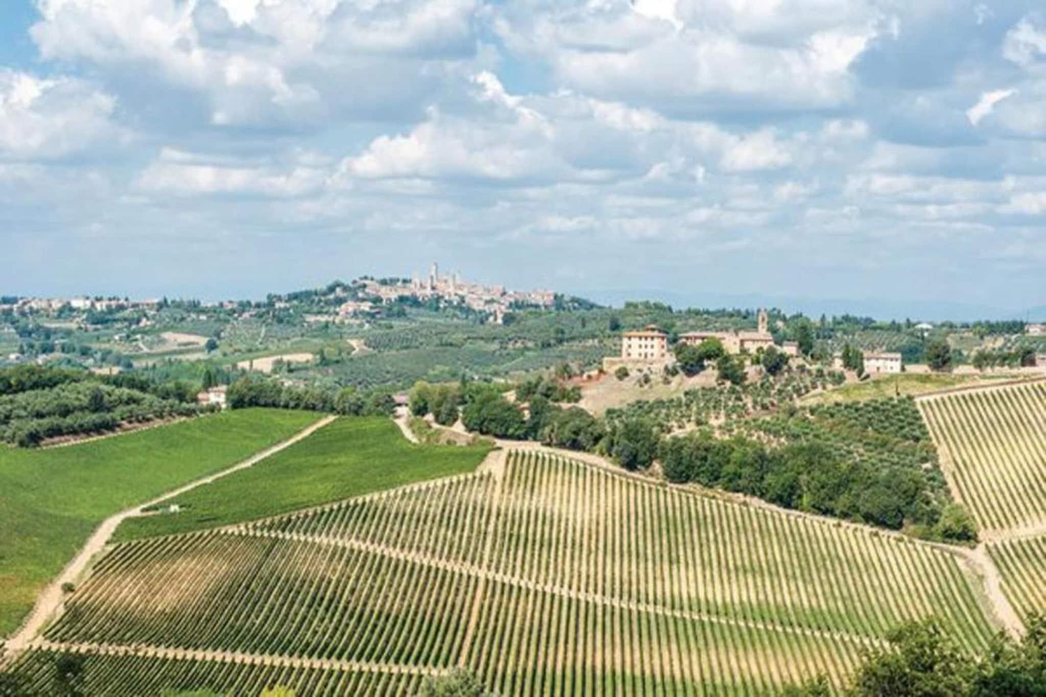 Beliggende i de bølgende bakker i San Gimignano, er dette charmerende 1-værelses bondehus perfekt til en familie eller gruppe på 4. Omgivet af vinmarker og olivenlunde tilbyder det en fælles swimmingpool, en privat terrasse og både fælles og private haver – ideel til at nippe til Vernaccia-vin under den toscanske sol. De fredelige landskabelige omgivelser ligger kun 4 km fra butikker, restauranter og et dejligt lokalt bageri. Indenfor byder stuehuset på et hyggeligt opholdsrum med en dobbelt sovesofa, et veludstyret køkken og et soveværelse med rustik charme. Nyd en flot udsigt over det toscanske landskab fra dine vinduer, og drag fordel af vaskemaskinen for ekstra bekvemmelighed. En barneseng er til rådighed for de mindste, og 1 kæledyr er velkommen gratis. Udforsk nærliggende ædelstene som Siena (30 km), Volterra (33 km) og Firenze (58 km) - en bil er afgørende for dagsture. Firenze Lufthavn ligger 59 km derfra. Uanset om du slapper af ved poolen eller nyder en have-picnic, tilbyder denne bondegård en perfekt blanding af komfort, tradition og toscansk skønhed.