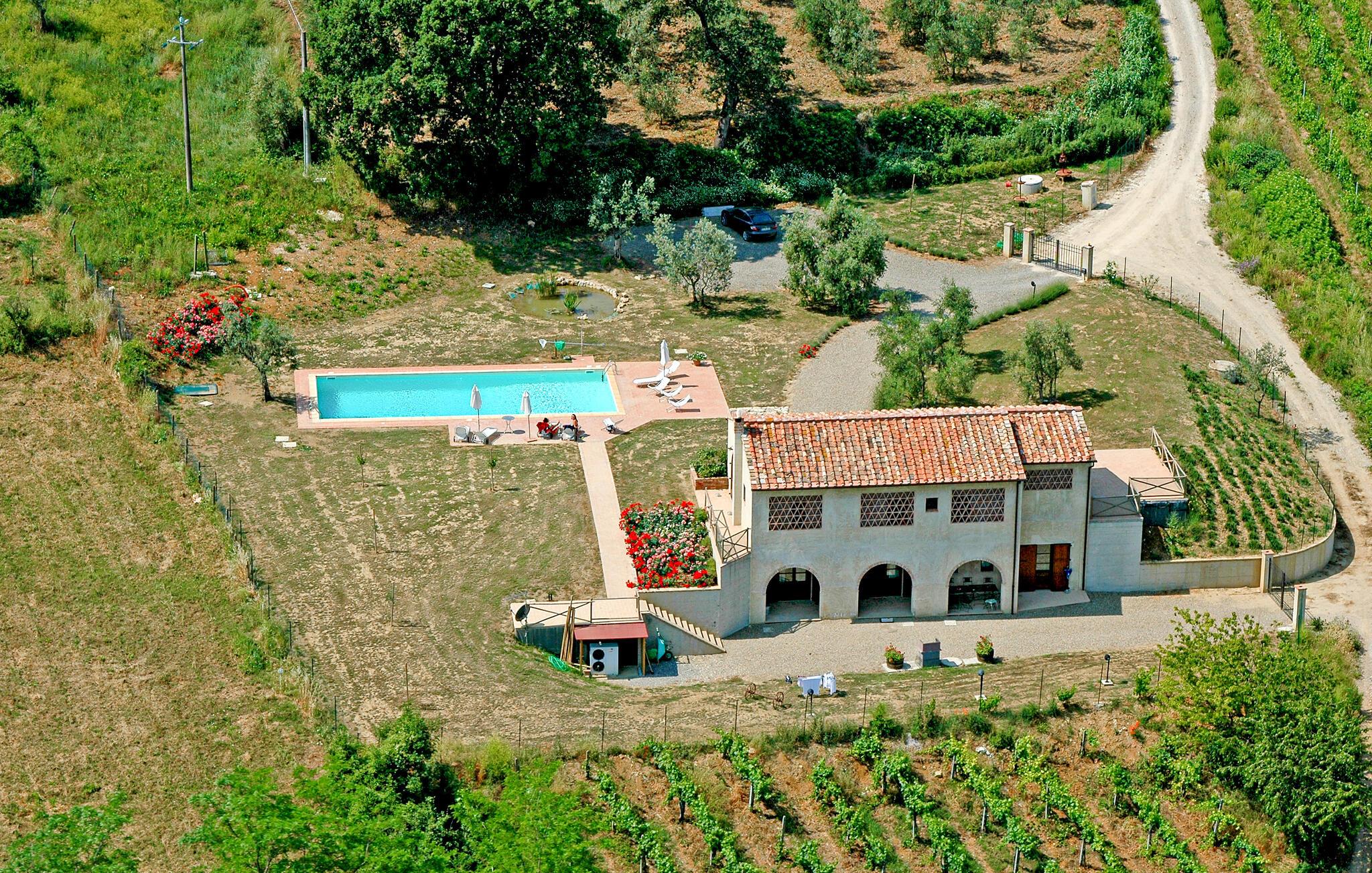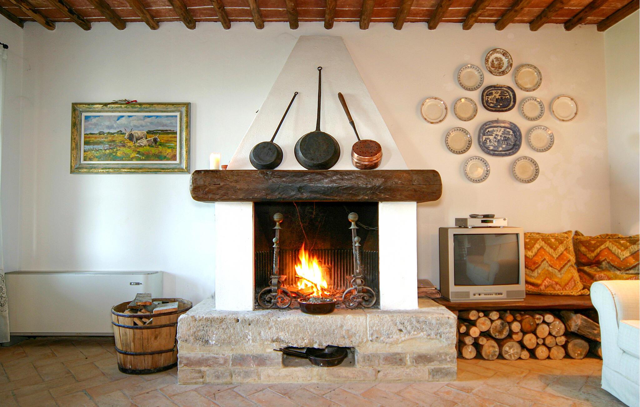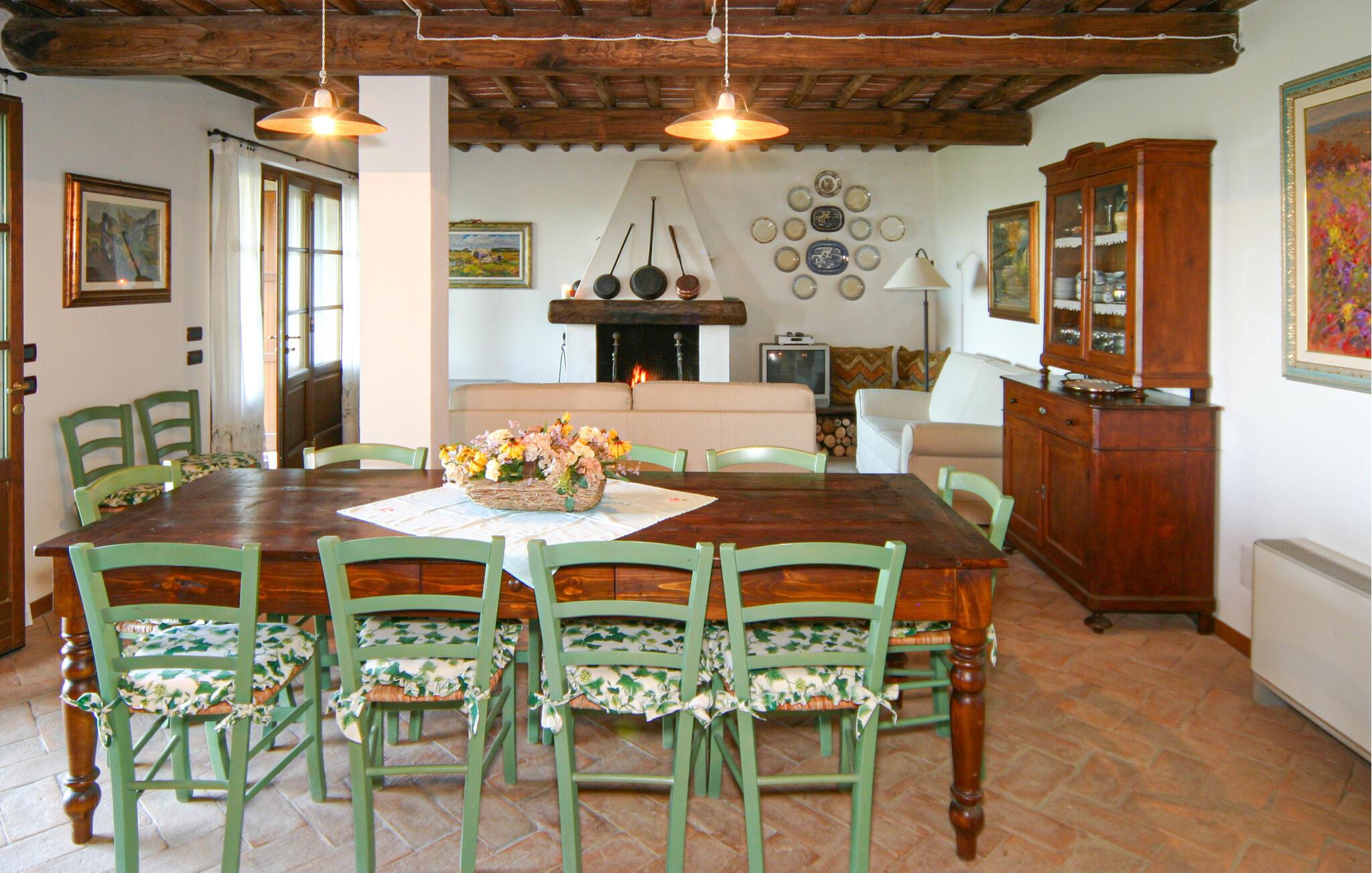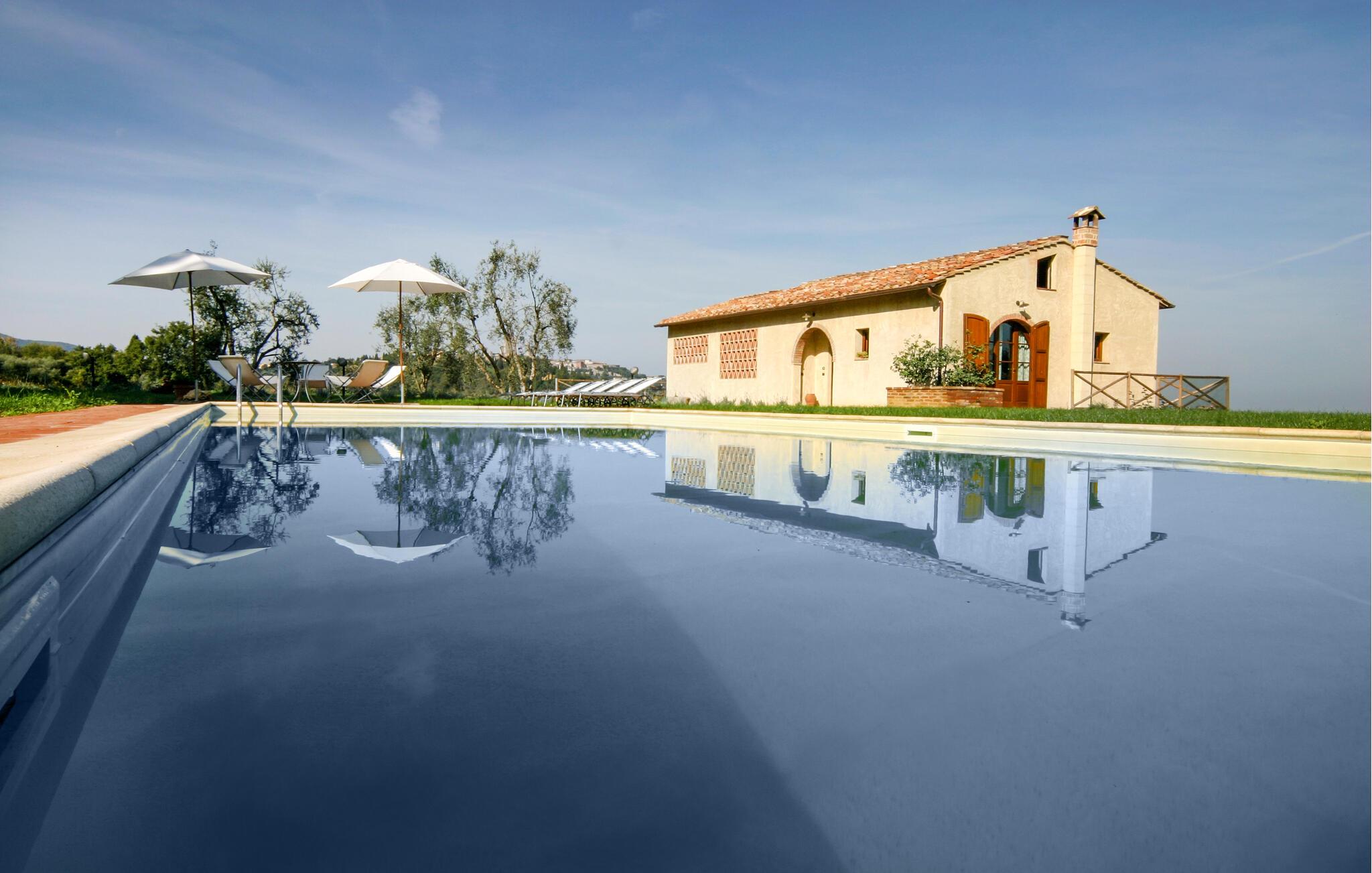 Nyd rustik hygge og en vidunderlig panoramaudsigt over landskabet i dette rummelige feriehus med pool.