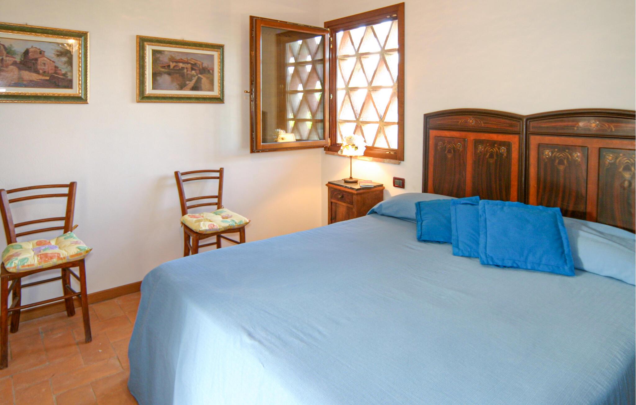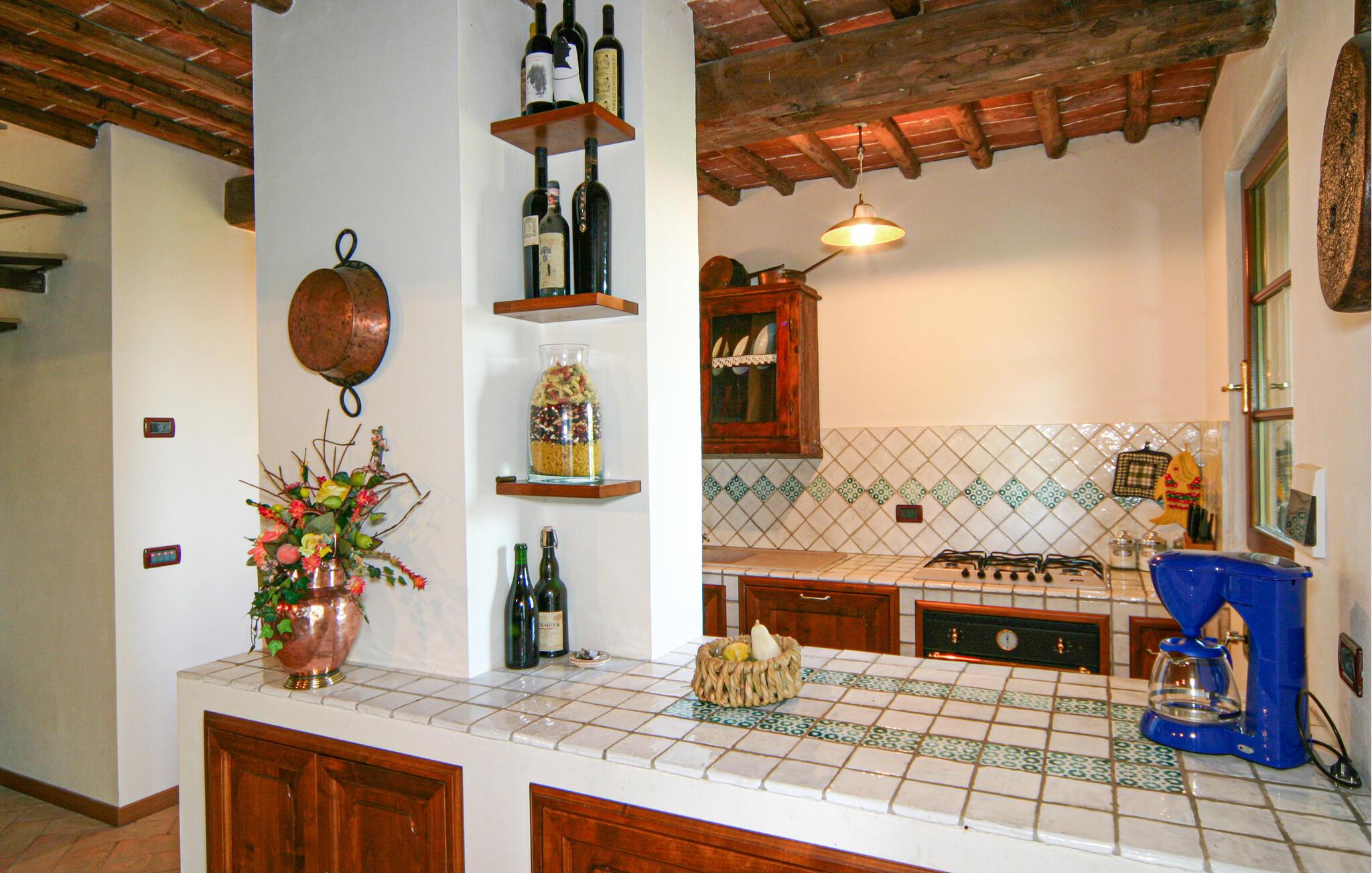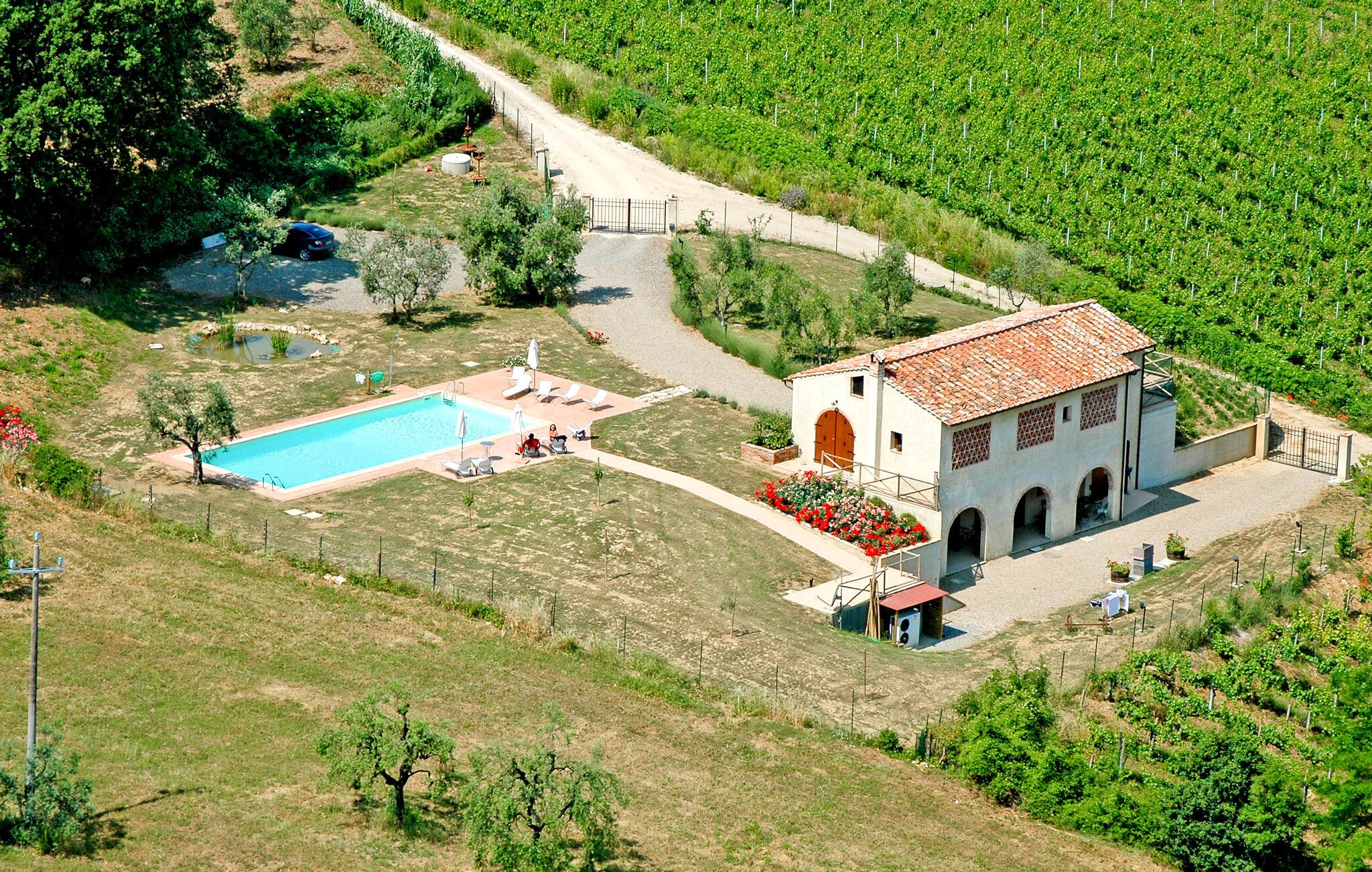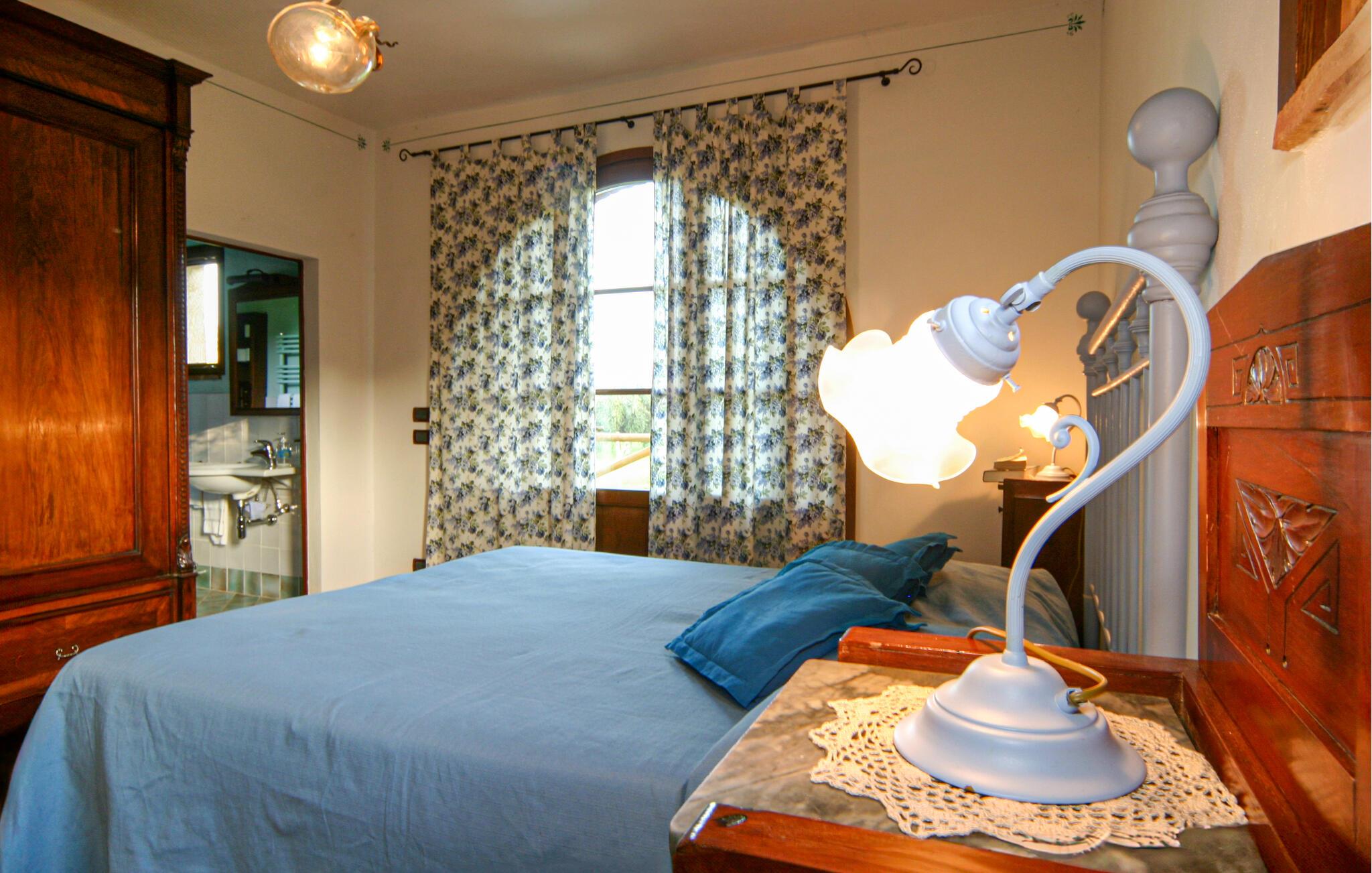 Nyd rustik hygge og en vidunderlig panoramaudsigt over landskabet i dette rummelige feriehus med pool.