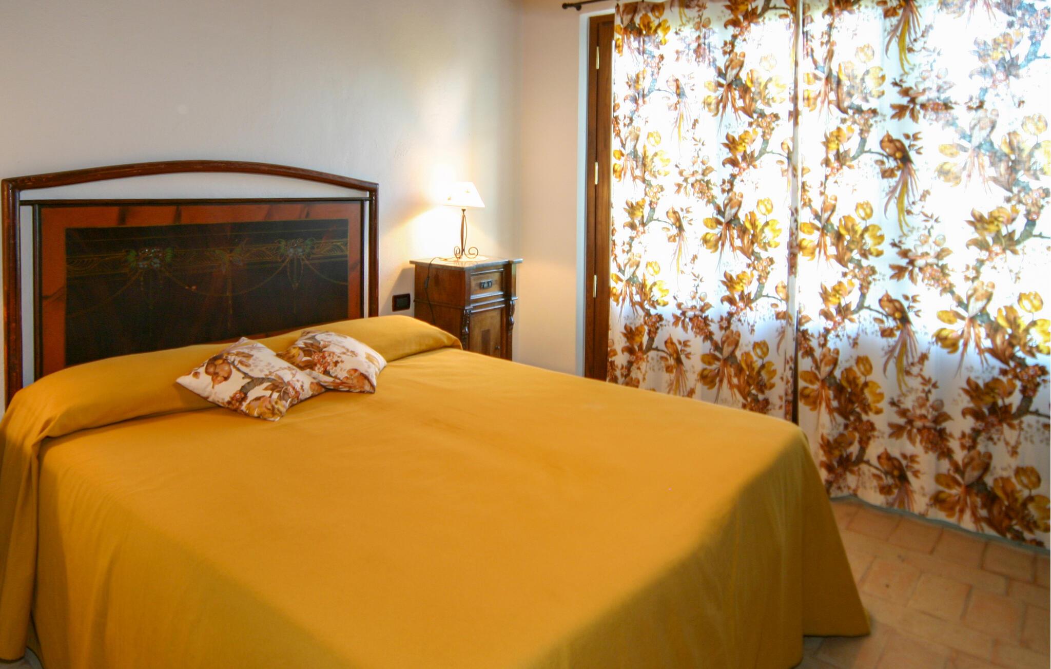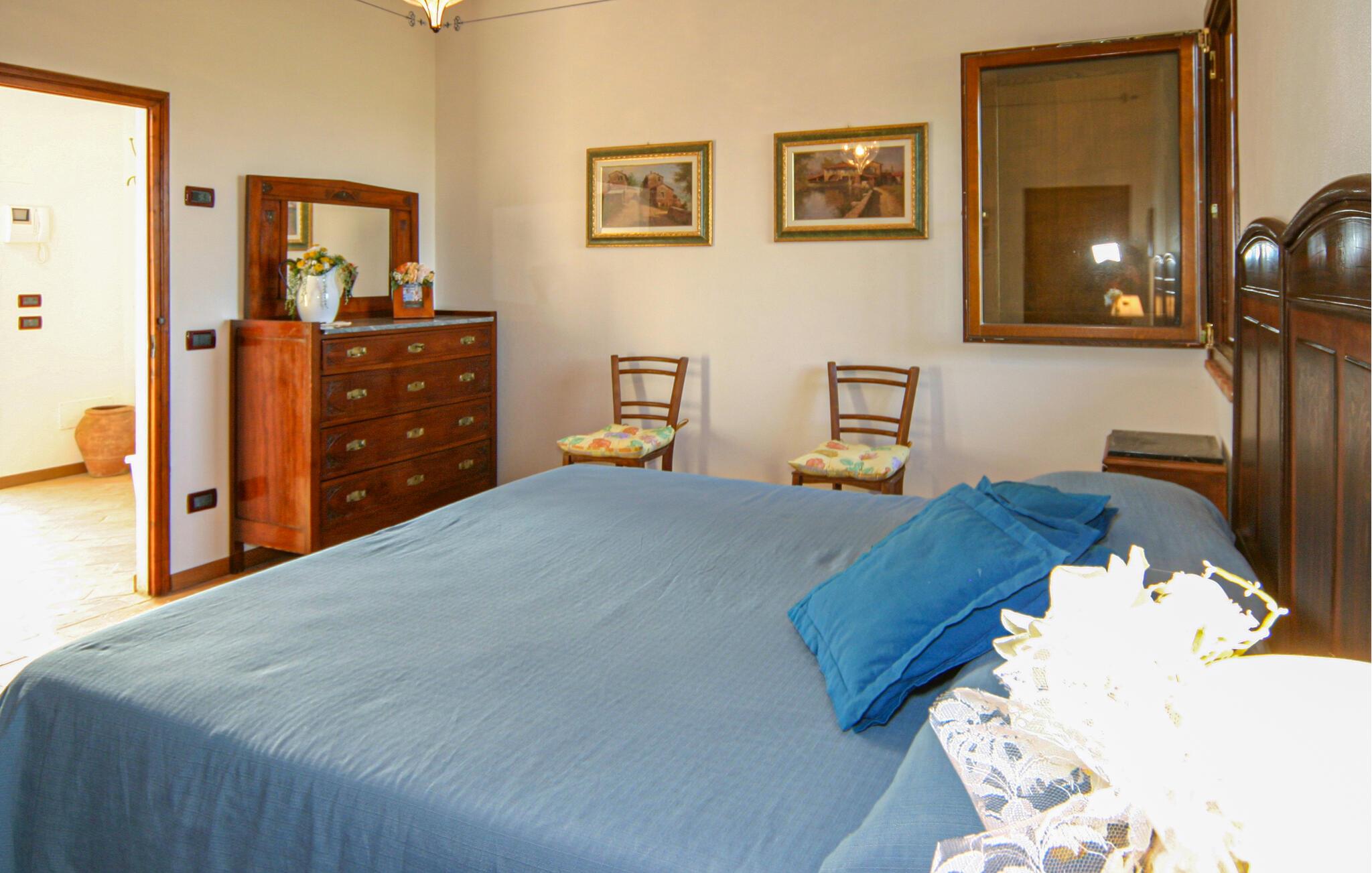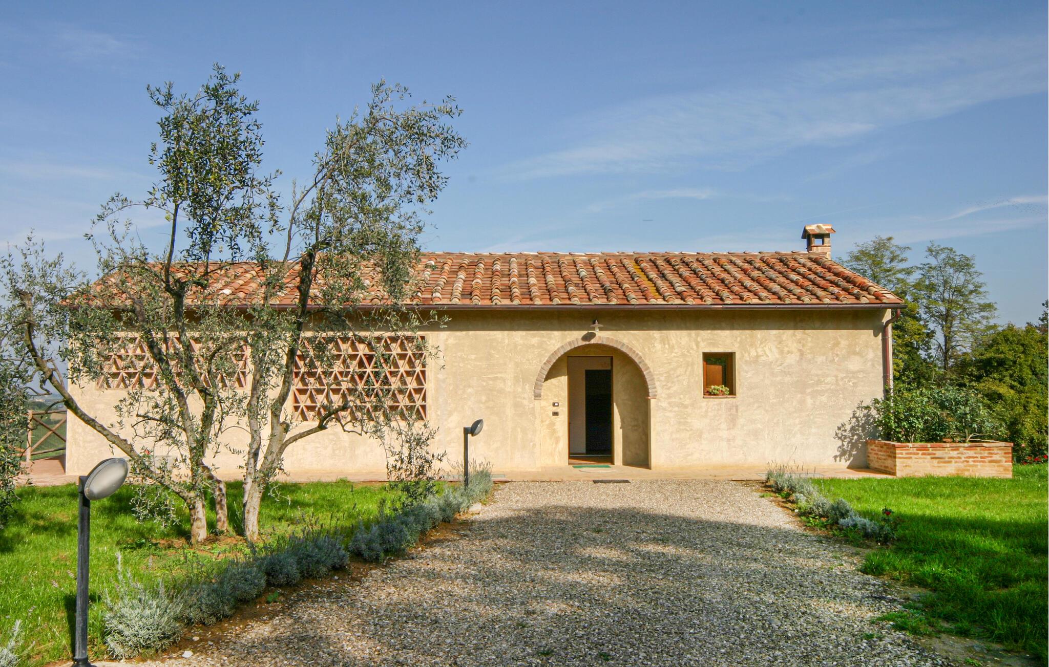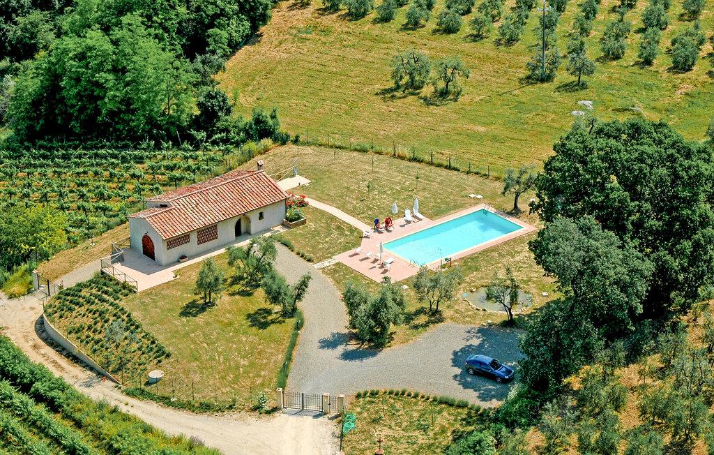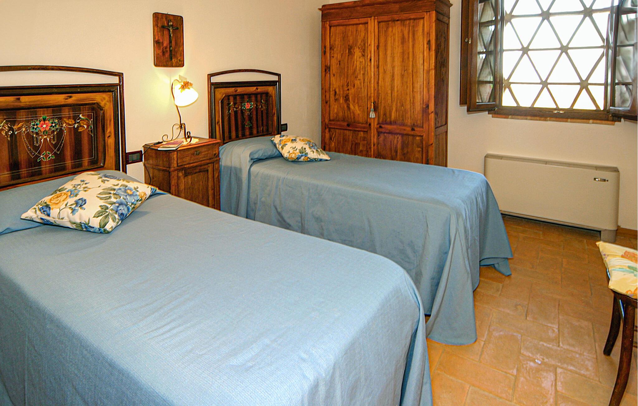 Nyd rustik hygge og en vidunderlig panoramaudsigt over landskabet i dette rummelige feriehus med pool.