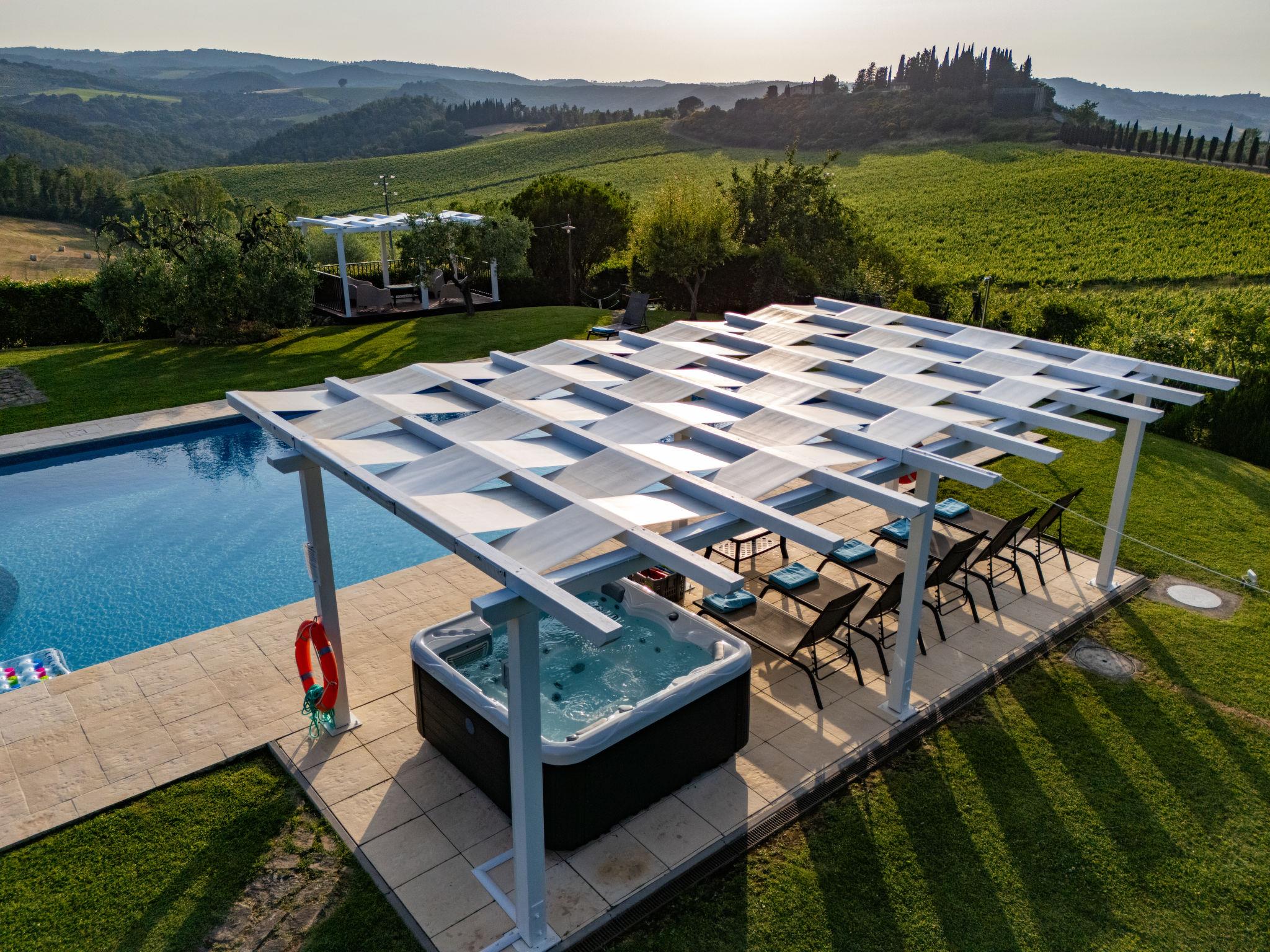 Large, child friendly, beautiful villa, surrounded by meadows. 7 km from the centre of San Gimignano, 52 km from the centre of Siena, 58 km from the centre of Firenze, in a quiet, sunny position. Private: large, well-kept garden 1'800 m2 (fenced) with meadow, swimming pool fenced (7 x 14 m, depth 120 - 240 cm, seasonal availability: 25.Apr. - 26.Sep.). Outdoor shower, pool house, table tennis. In the house: hot tub, central heating system, laundry, washing machine, tumble dryer, heating available only from 01.Nov. - 15.Apr.. Room cleaning on request (extra). House maid on request (extra). Cook on request (extra). Motor access to the house (800 m via unmade road). Parking (for 4 cars) at the house. Restaurant 1.5 km, bar 2 km, bus stop 5 km, railway station "Certaldo" 6 km. Golf course (18 hole) 26 km, tennis 5 km, walking paths from the house 100 m. Nearby attractions: Certaldo 6 km, Colle di Val d'Elsa 21 km, Monteriggioni 25 km, Volterra 30 km, San Donato 33 km, Castellina in Chianti 45 km. Please note: suitable for families, baby equipment on request (extra). Obligation to wear bathing caps. Close to the swimming pool guests can use a gazebo (3x8 m) and a panoramic viewing plattform (2.5 x 4.5 m) overlooking the vineyards. It is not allowed to leave dogs alone in the house. 5-seater outdoor hot tub.
