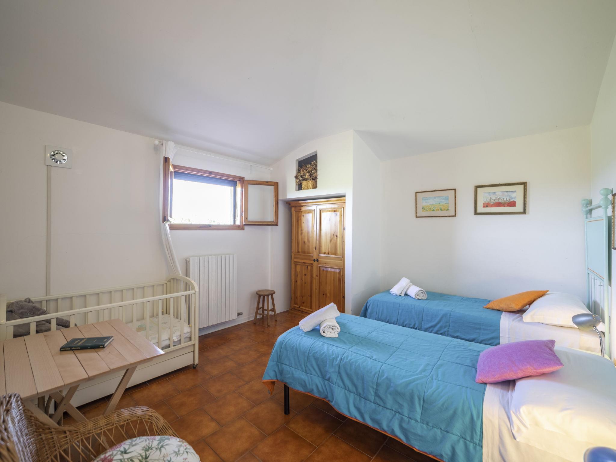 "Podere San Michele", 8-room villa 180 m2 on 2 levels, on the upper floor. Spacious and bright, rustic and cosy furnishings: entrance hall. Upper floor: living/dining room with open-hearth fireplace, dining table and kitchen corner. Exit to the loggia, to the patio. Living/dining room with open-hearth fireplace, dining table and kitchen corner. Exit to the balcony. 1 double bedroom. 2 rooms, each room with 1 bed (80 cm), 1 double bed. Kitchen-/living room (8 hot plates, oven, dishwasher, toaster, kettle, microwave, electric coffee machine). 2 showers/bidet/WC. 2nd upper floor: living room with TV (flat screen). 1 double bedroom. 1 room with 2 beds. Hip bath/bidet/WC. Heating (extra). Natural stone floors. Balcony, large patio. Terrace furniture, barbecue, deck chairs, covered balcony, box-room. Marvellous panoramic view of the countryside and San Gimignano. Facilities: washing machine, iron, mosquito net, children's high chair, baby cot for up to 2 year olds, hair dryer, logs (extra). Internet (WiFi, free). Parking at the house. Please note: non-smokers only. Maximum 1 pet/ dog allowed. Private entrance, fire extinguisher. The pool mentioned in the description is for private use. Bed layout is flexible. There are more sleeping options available than the maximum number of people allowed which may, however, not be exceeded. No mandatory extra charges to be paid on-site except for local tax. IT052028B4YY8TDQ62