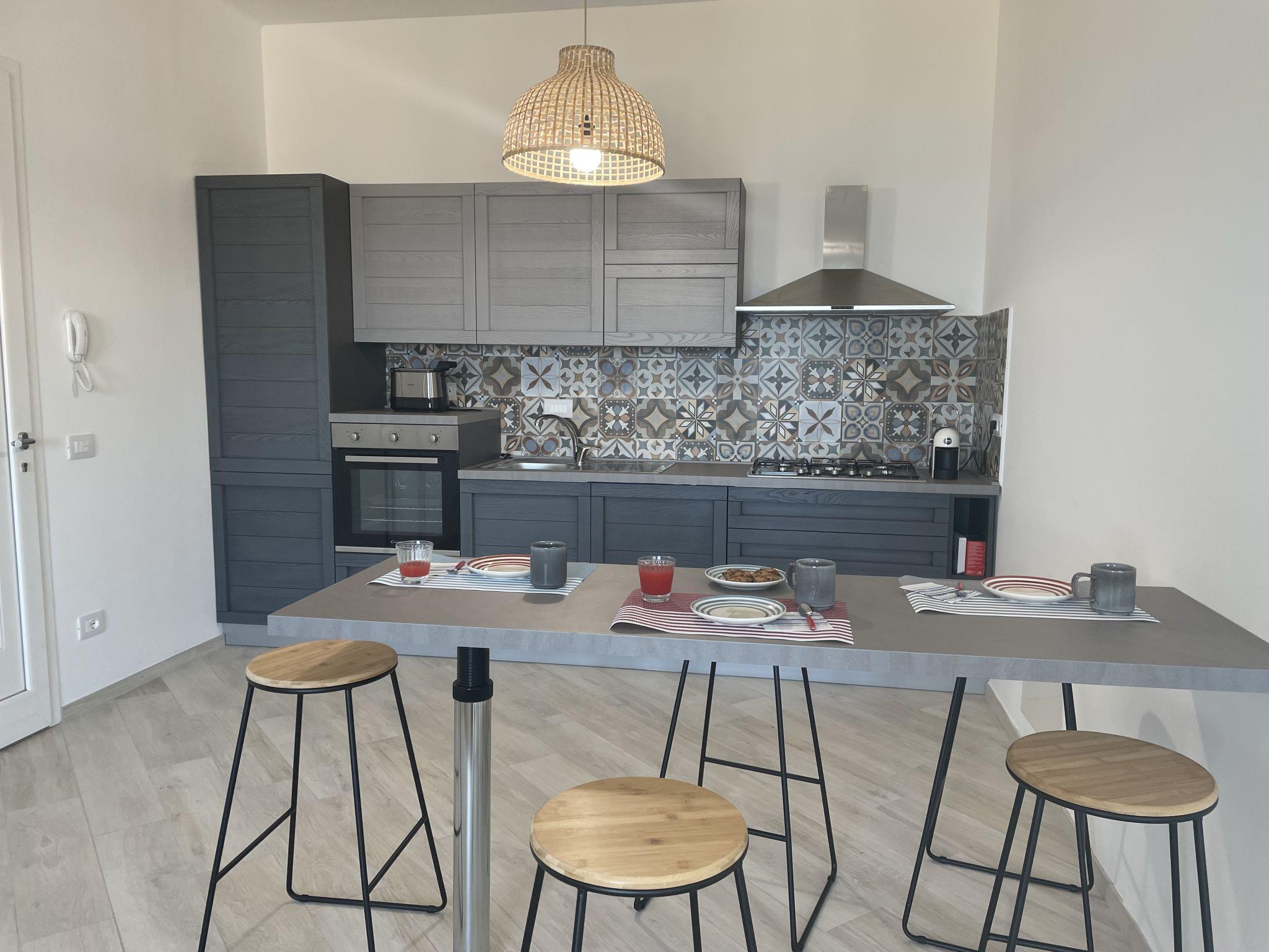 3-room terraced house 90 m2 on 2 levels. Bright, modern and tasteful furnishings: living/sleeping room with 1 sofabed (120 cm), satellite TV. Exit to the terrace. Kitchenette (oven, dishwasher, Gas stove, 4 gas rings, toaster, kettle, freezer, electric coffee machine, Capsules for coffee machine (a modo mio Lavazza)) with small bar. Sep. WC. Upper floor: 1 double bedroom. Exit to the balcony. 1 room with 2 beds (90 cm). Shower/bidet/WC. Gas heating. Heating available only from 30.10. to 01.04. Natural stone floors. Large balcony, large terrace 40 m2. Terrace furniture, barbecue, deck chairs (2). Very beautiful panoramic view of the sea and the resort. Facilities: washing machine, children's high chair, baby cot. Internet (WiFi, free). Garage. IT008054C2FIIH87SD