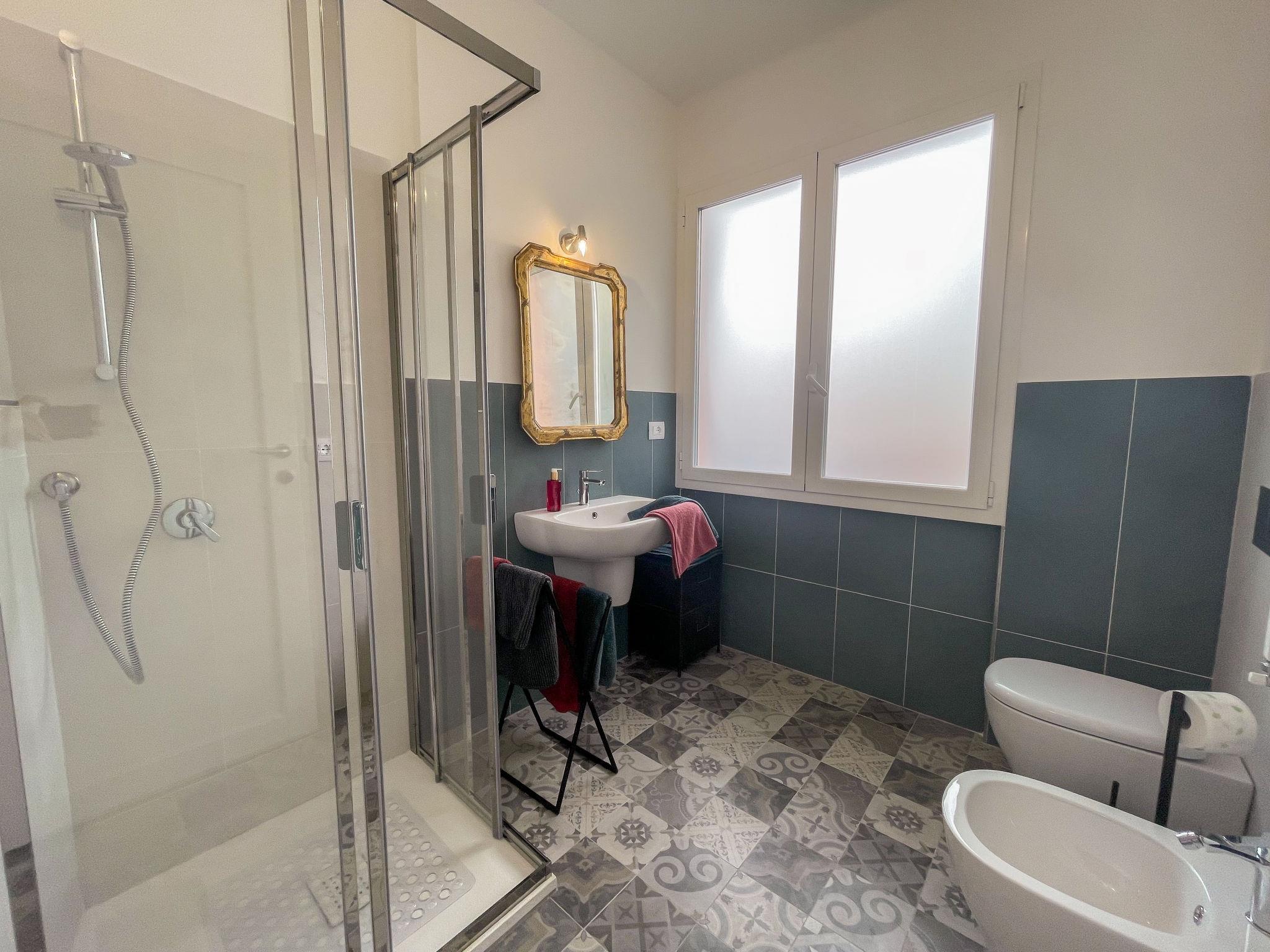 Large, beautiful apartment house "Casa Vacanze La Faiola", 2 storeys. 3 apartments in the property. Above San Lorenzo al Mare, 500 m from the centre, in a sunny, elevated position on a slope, residential area (villas), 500 m from the sea, 500 m from the beach, in a cul-de-sac. Motor access to the house. Parking space or garage only for small to medium-sized cars. Shop, supermarket, restaurant, bar, bakery, café, pedestrian zone, bicycle rental 500 m, bus stop 6.8 km, sandy beach 500 m. Cycle lane 500 m.