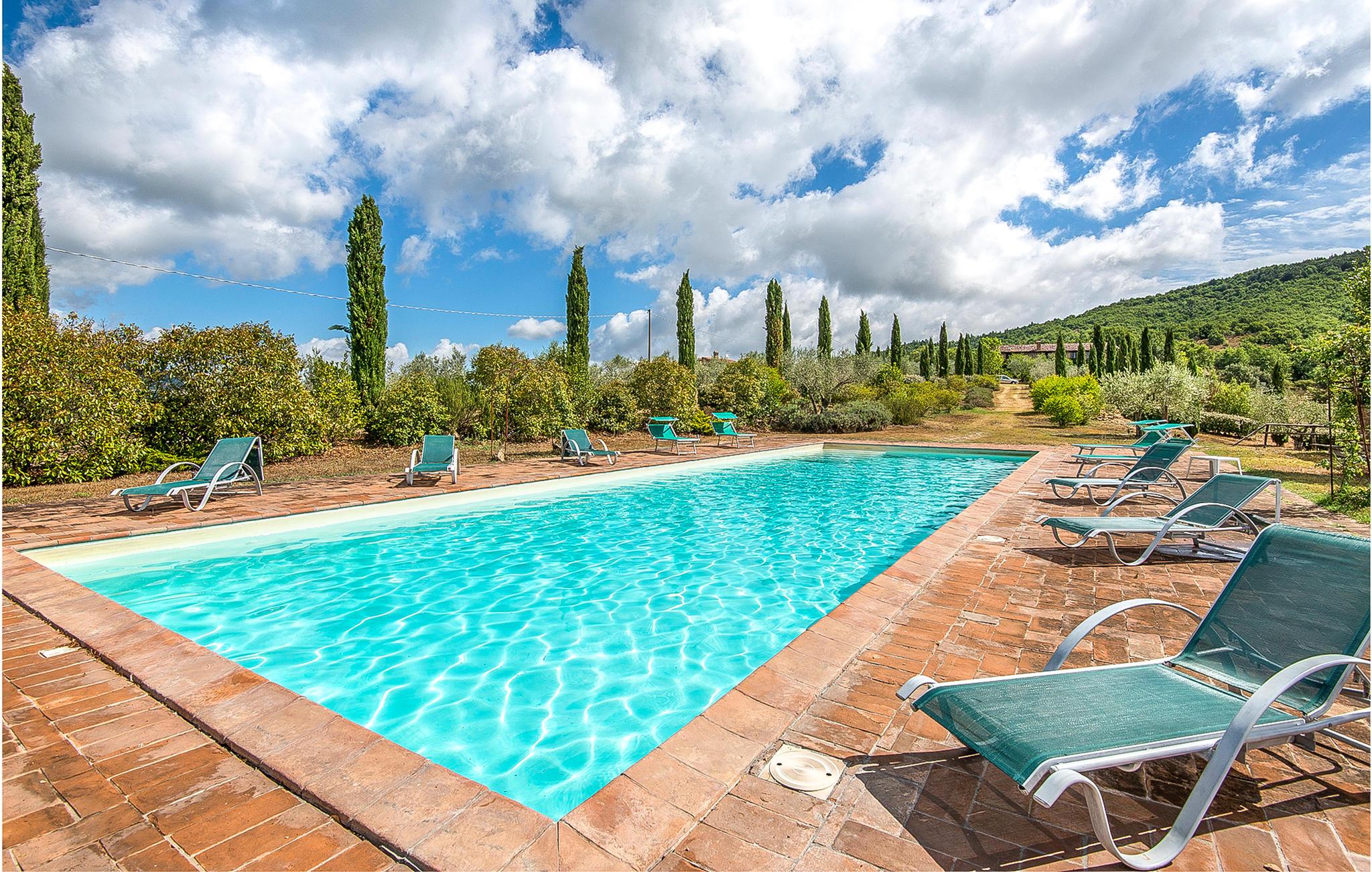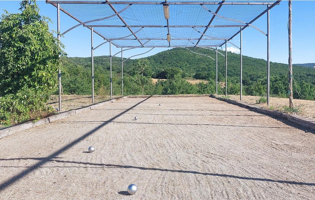 Huset ligger på en 150 ha stor grund på en bakke og er omgivet af enge og skove. Nyd den brede og smukke udsigt over dalen og skoven. Tilstedeværelsen er omgivet af græsplæner og olivenlunde, hvor en stor swimmingpool, boccia, legeplads, bordtennis og stengrill er til rådighed til fælles brug med de andre lejligheder.
