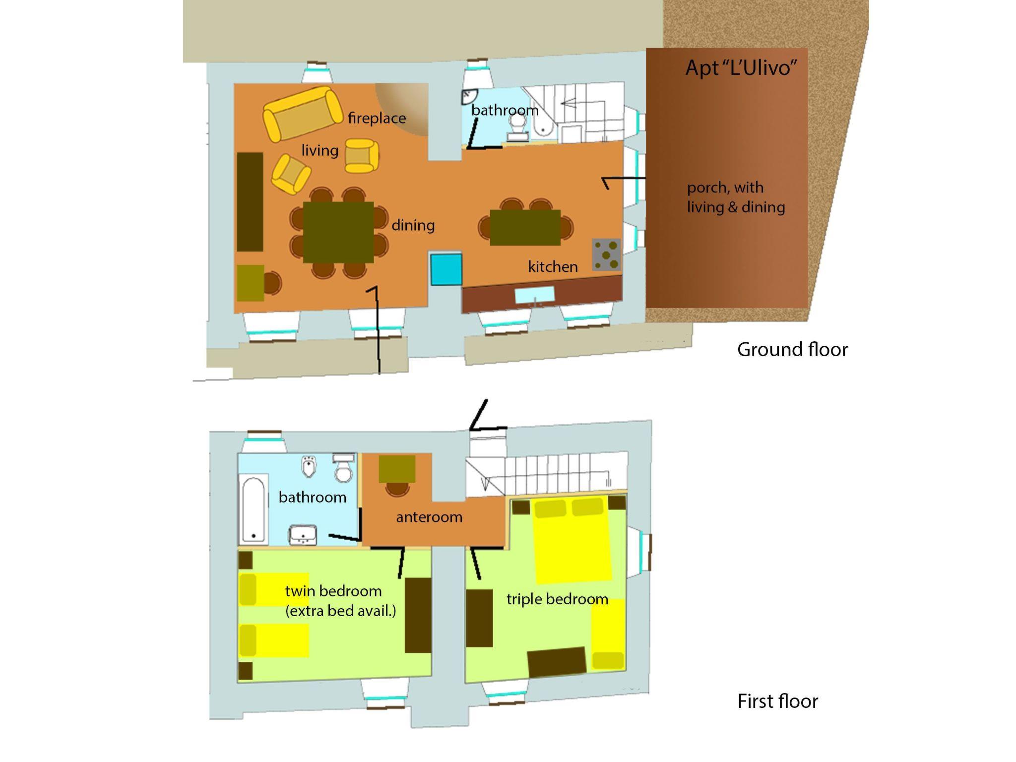 On the ground floor is a fully equipped kitchen-dining room with refrigerator-freezer, gas cooker and oven and a dining area with table and chairs for 8-12 persons. The living room has a fireplace, sofa and armchairs and can accommodate up to eight people. There is also a dining room with table and chairs for up to twelve people. There is a bathroom with a bathtub and WC. On the first floor there is a second bathroom with a bathtub and WC. There are two further bedrooms, one with three beds and one with a double bed. An extra bed can be added in each of these rooms.