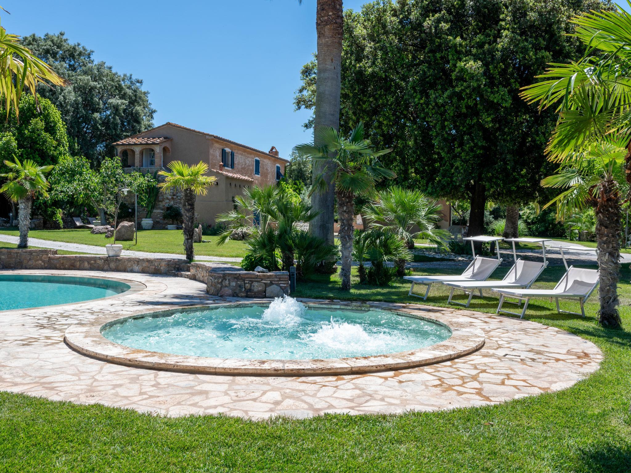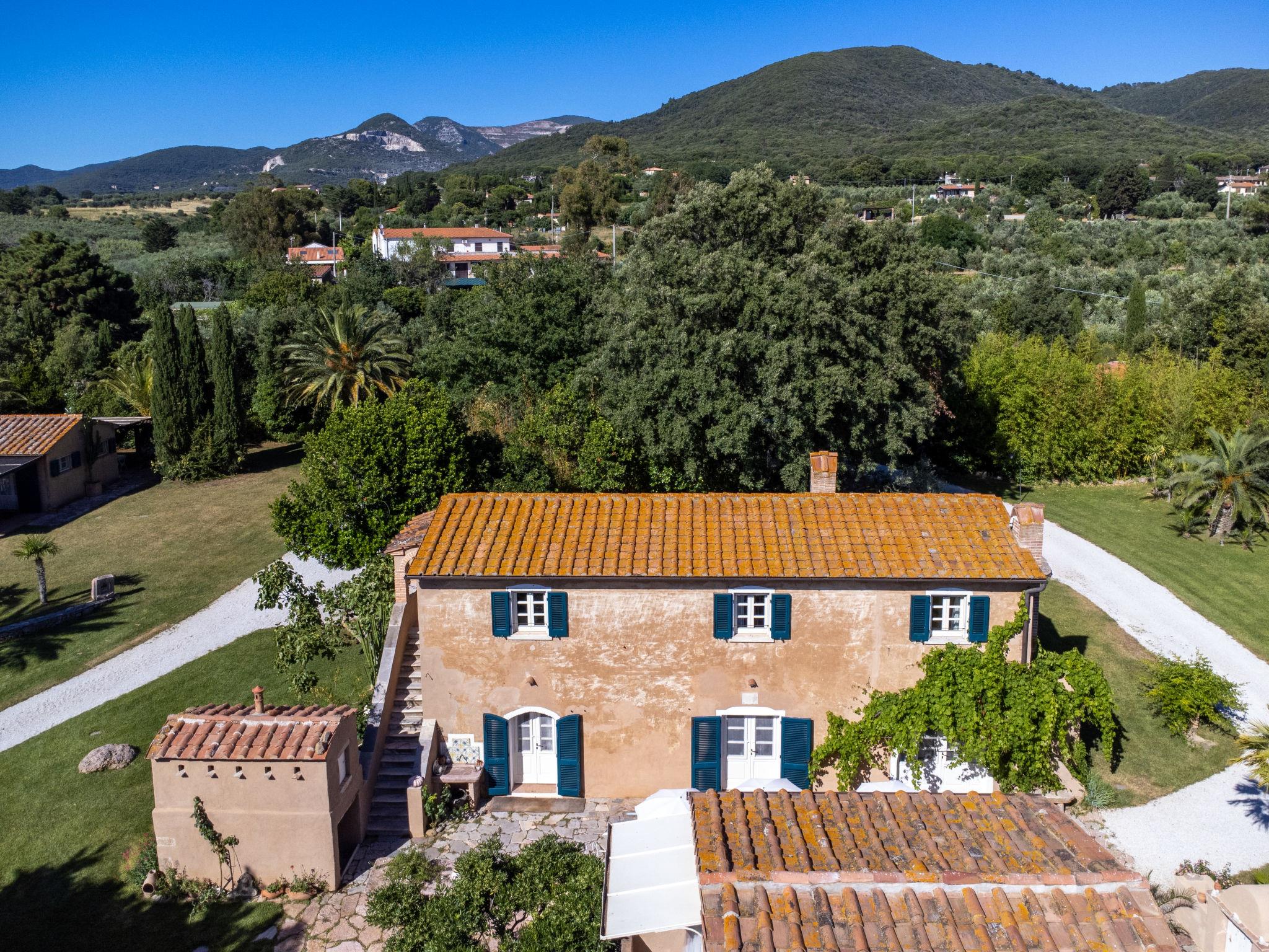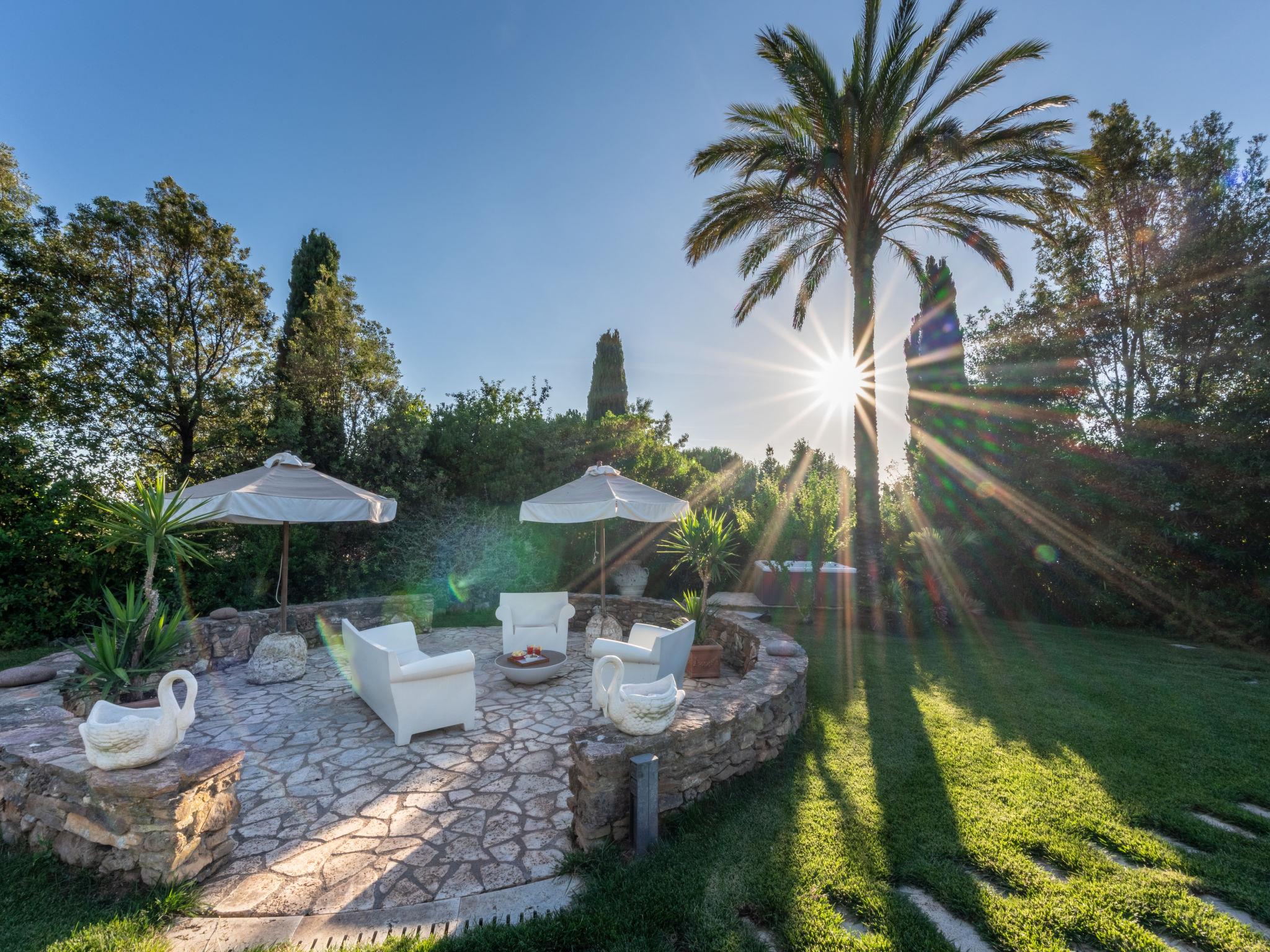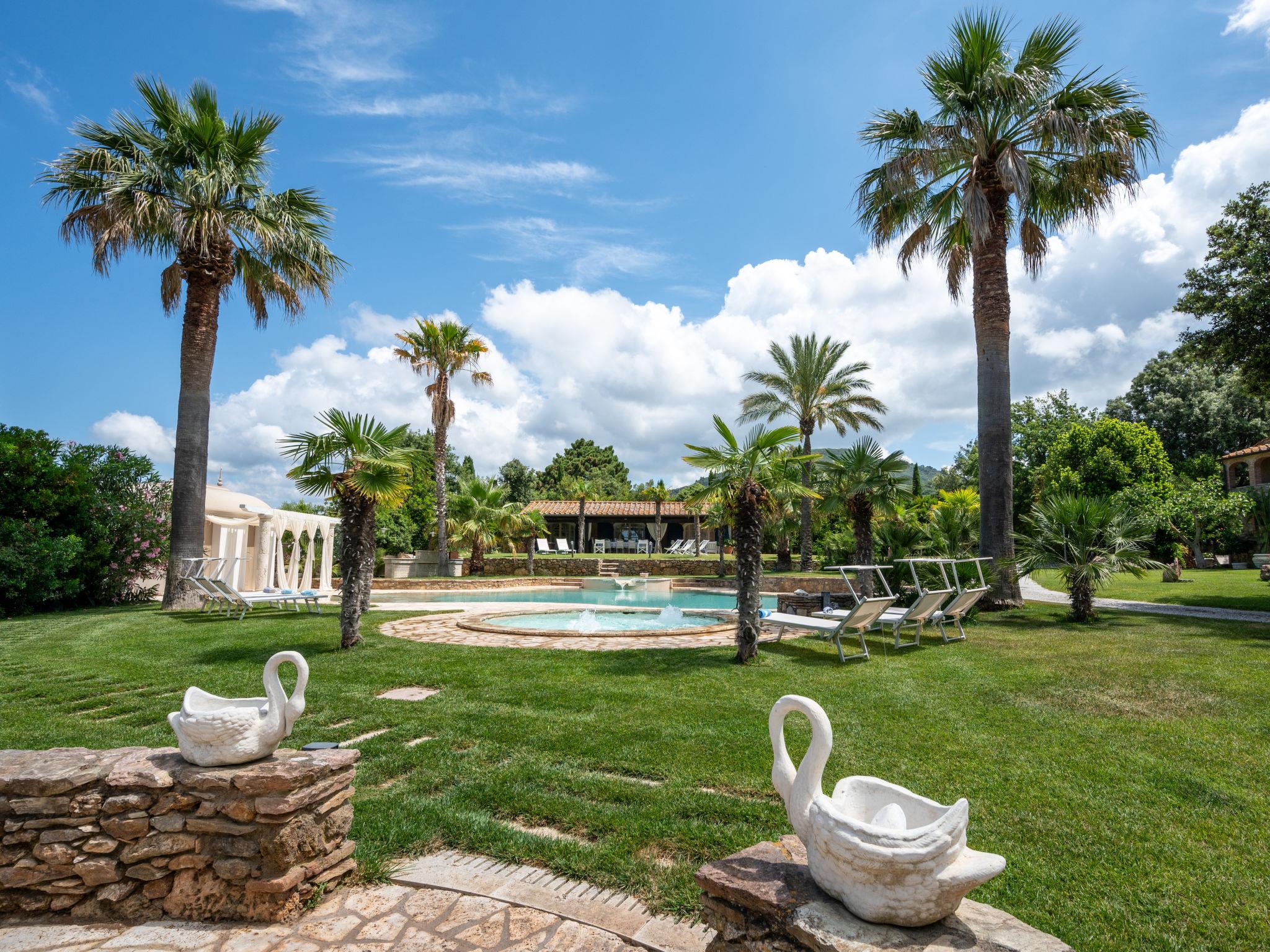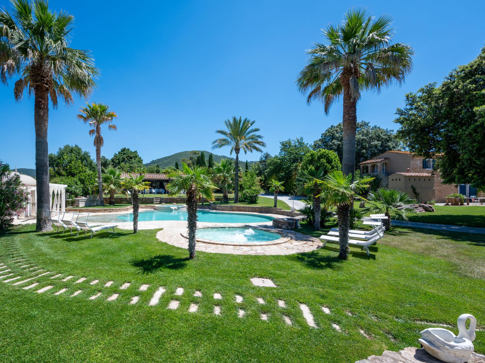 This private country estate is the epitome of a southern dream, palm trees, large pool and beautiful garden to enjoy in close proximity to the sea. Comfortable country house "Villa delle Stelle", detached, surrounded by trees and fields. Property composed of main house and outbuilding, in the hamlet Campalto 5 km from the centre of San Vincenzo, 5 km from the centre of Venturina, in a quiet, sunny position, 5 km from the sea, 5 km from the beach, in the countryside. Private: park 6'000 m2 (fenced) with lawn and trees, beautiful garden to relax, swimming pool kidney shaped (150 m2, depth 150 - 150 cm, seasonal availability: 29.Apr. - 04.Oct.). Shower/WC in the pool area, paddling pool, slide, hot tub, pool house with fridge and cooking stove, patio, arbour, barbecue, pool maintenance by the owner/gardener. In the house: WiFi, hot tub (all included), table tennis, billiard table, playroom, bicycles available (extra). Linen change weekly. Towel change weekly. Parking (for 5 cars) on the premises. Shop 5 km, supermarket 4 km, restaurant 600 m, bus stop "Palmentello" 1 km, railway station "Campiglia Marittima" 7 km, sandy beach "Dog Beach, Rimigliano" 5 km, grass beach "Golfo di Baratti" 12 km, thermal baths "Calidario" 5 km. Marina 7 km, golf course (18 hole) 40 km, riding stable 16 km. Nearby attractions: Golfo di Baratti 12 km, Bolgheri 25 km, Pisa 90 km, Firenze 160 km. Please note: baby equipment (included). The owner does not accept any youth groups.