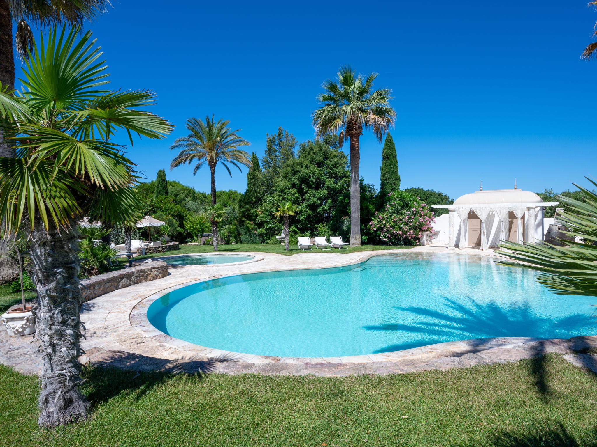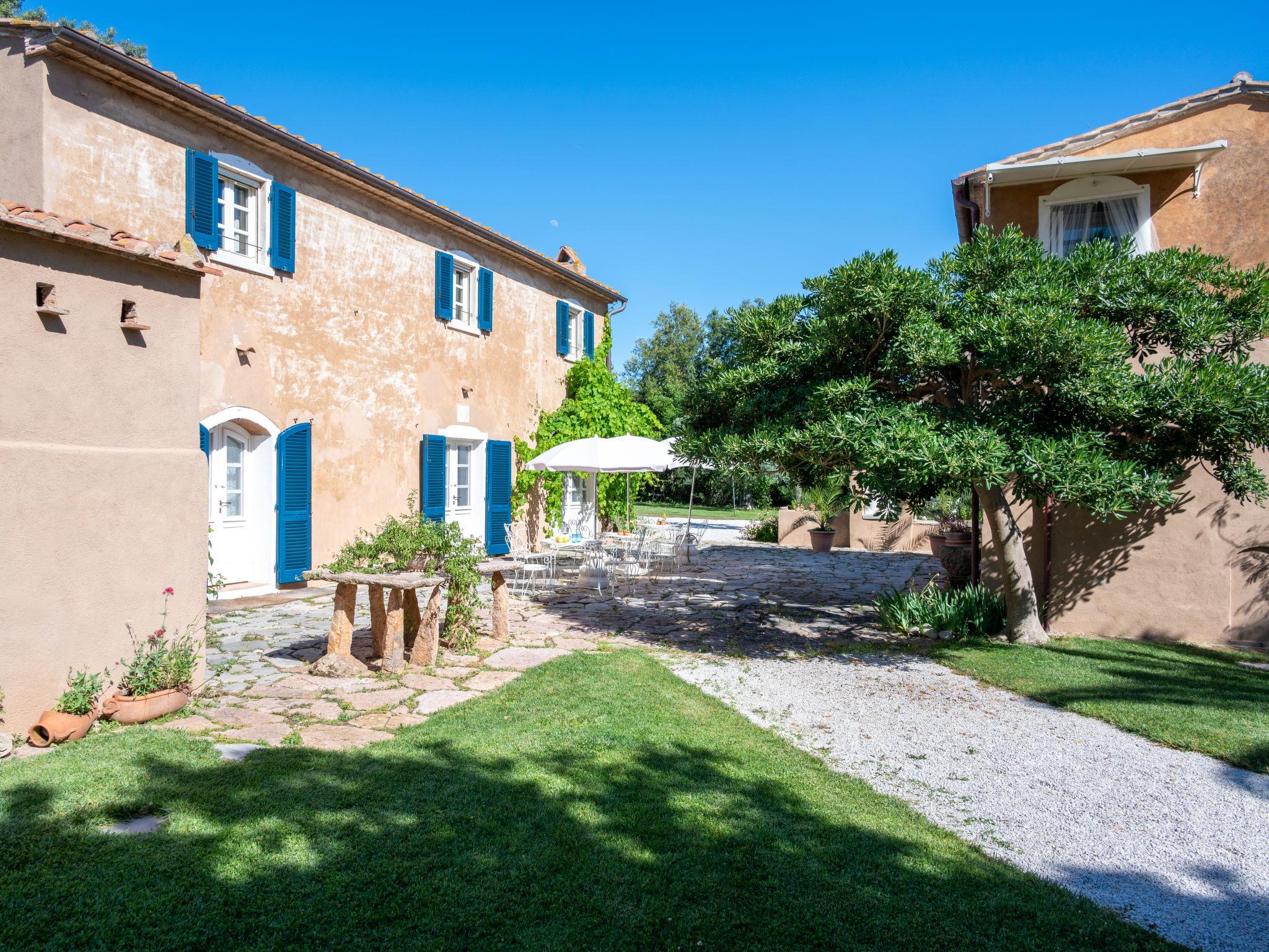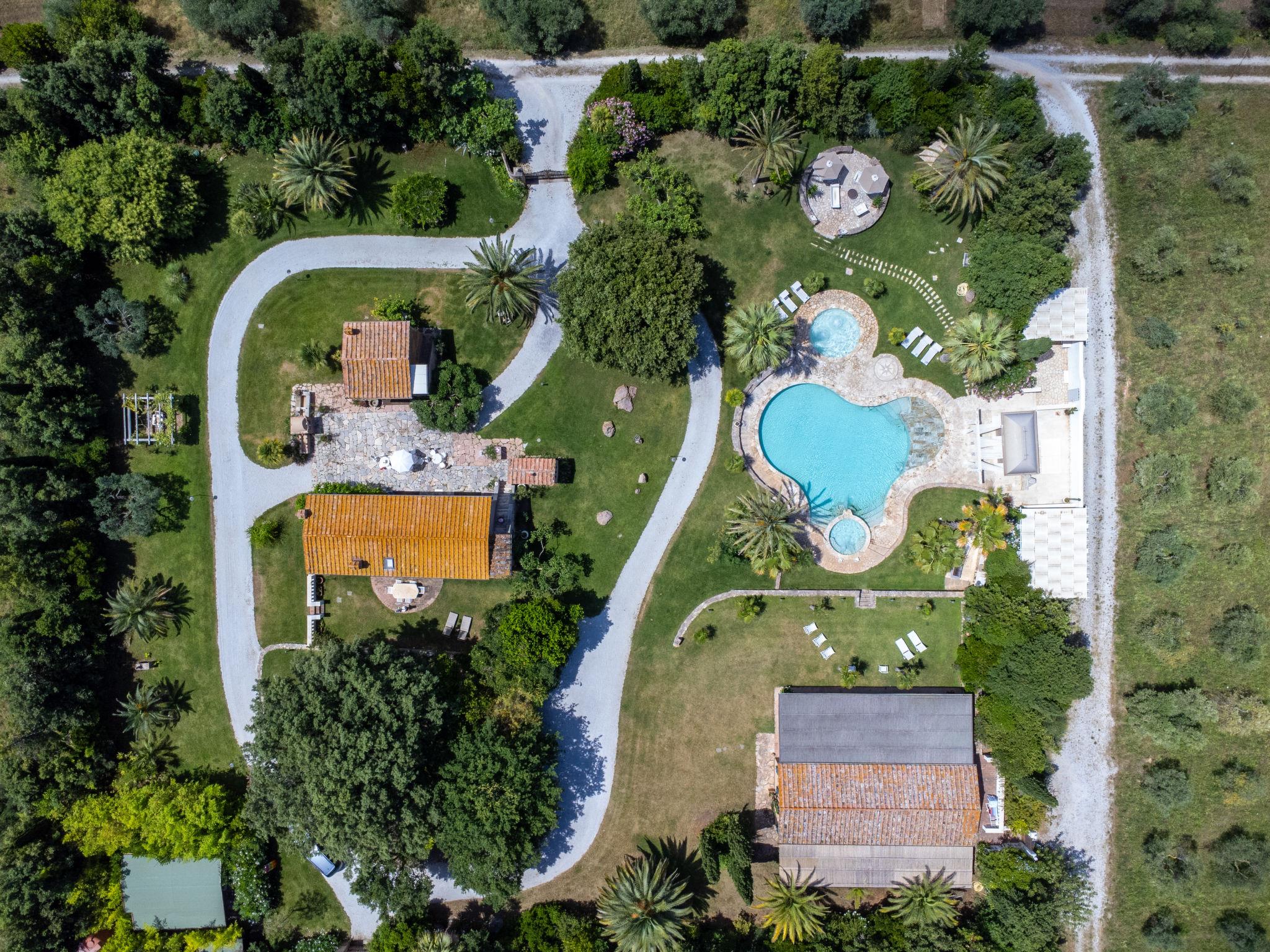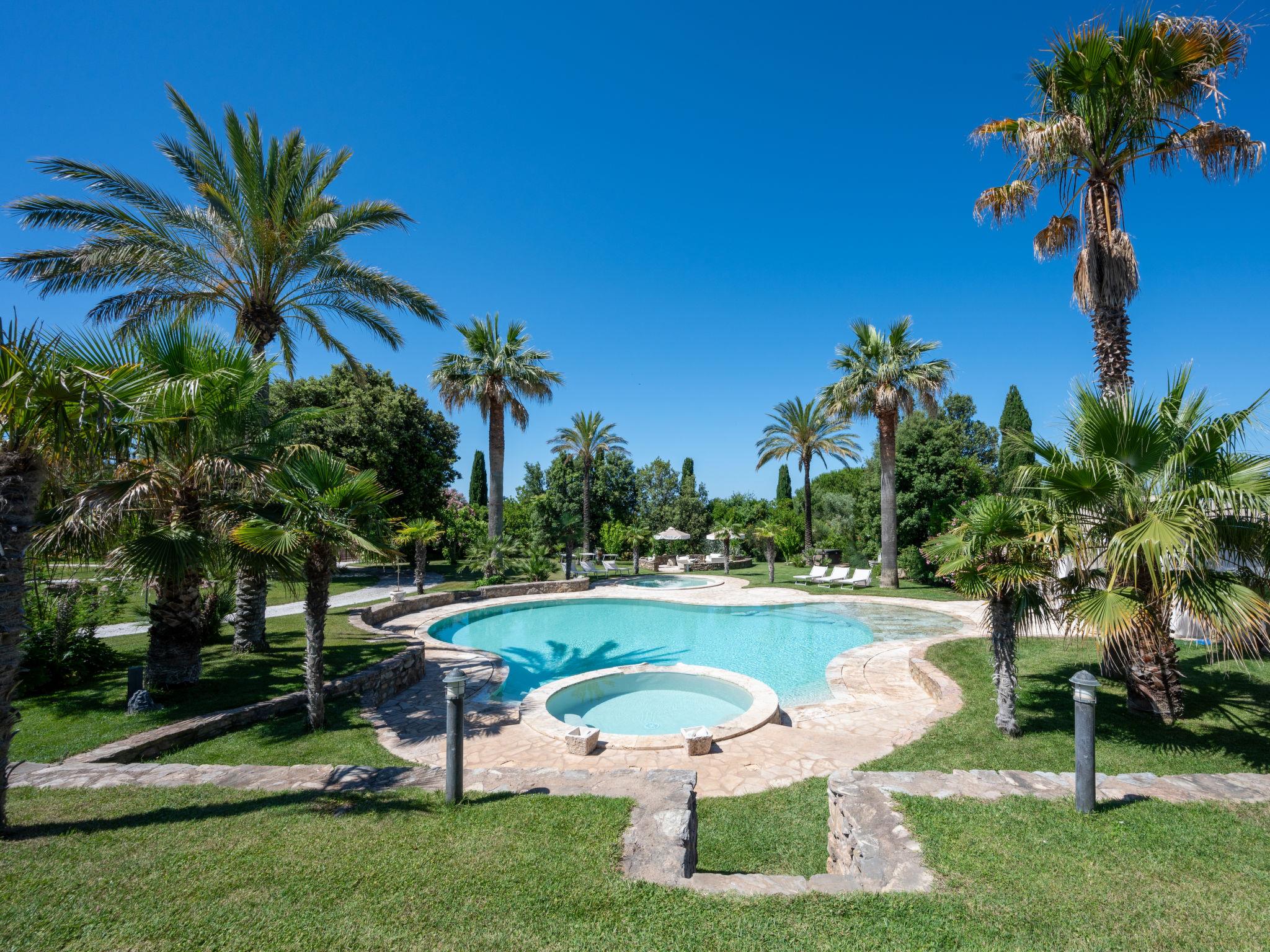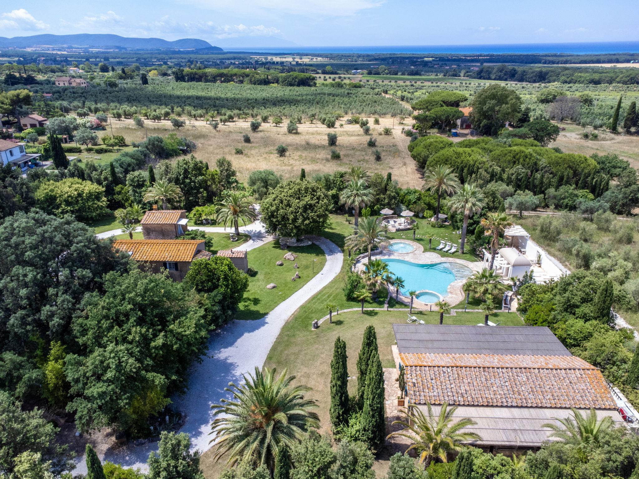 This private country estate is the epitome of a southern dream, palm trees, large pool and beautiful garden to enjoy in close proximity to the sea. Comfortable country house "Villa delle Stelle", detached, surrounded by trees and fields. Property composed of main house and outbuilding, in the hamlet Campalto 5 km from the centre of San Vincenzo, 5 km from the centre of Venturina, in a quiet, sunny position, 5 km from the sea, 5 km from the beach, in the countryside. Private: park 6'000 m2 (fenced) with lawn and trees, beautiful garden to relax, swimming pool kidney shaped (150 m2, depth 150 - 150 cm, seasonal availability: 29.Apr. - 04.Oct.). Shower/WC in the pool area, paddling pool, slide, hot tub, pool house with fridge and cooking stove, patio, arbour, barbecue, pool maintenance by the owner/gardener. In the house: WiFi, hot tub (all included), table tennis, billiard table, playroom, bicycles available (extra). Linen change weekly. Towel change weekly. Parking (for 5 cars) on the premises. Shop 5 km, supermarket 4 km, restaurant 600 m, bus stop "Palmentello" 1 km, railway station "Campiglia Marittima" 7 km, sandy beach "Dog Beach, Rimigliano" 5 km, grass beach "Golfo di Baratti" 12 km, thermal baths "Calidario" 5 km. Marina 7 km, golf course (18 hole) 40 km, riding stable 16 km. Nearby attractions: Golfo di Baratti 12 km, Bolgheri 25 km, Pisa 90 km, Firenze 160 km. Please note: baby equipment (included). The owner does not accept any youth groups.