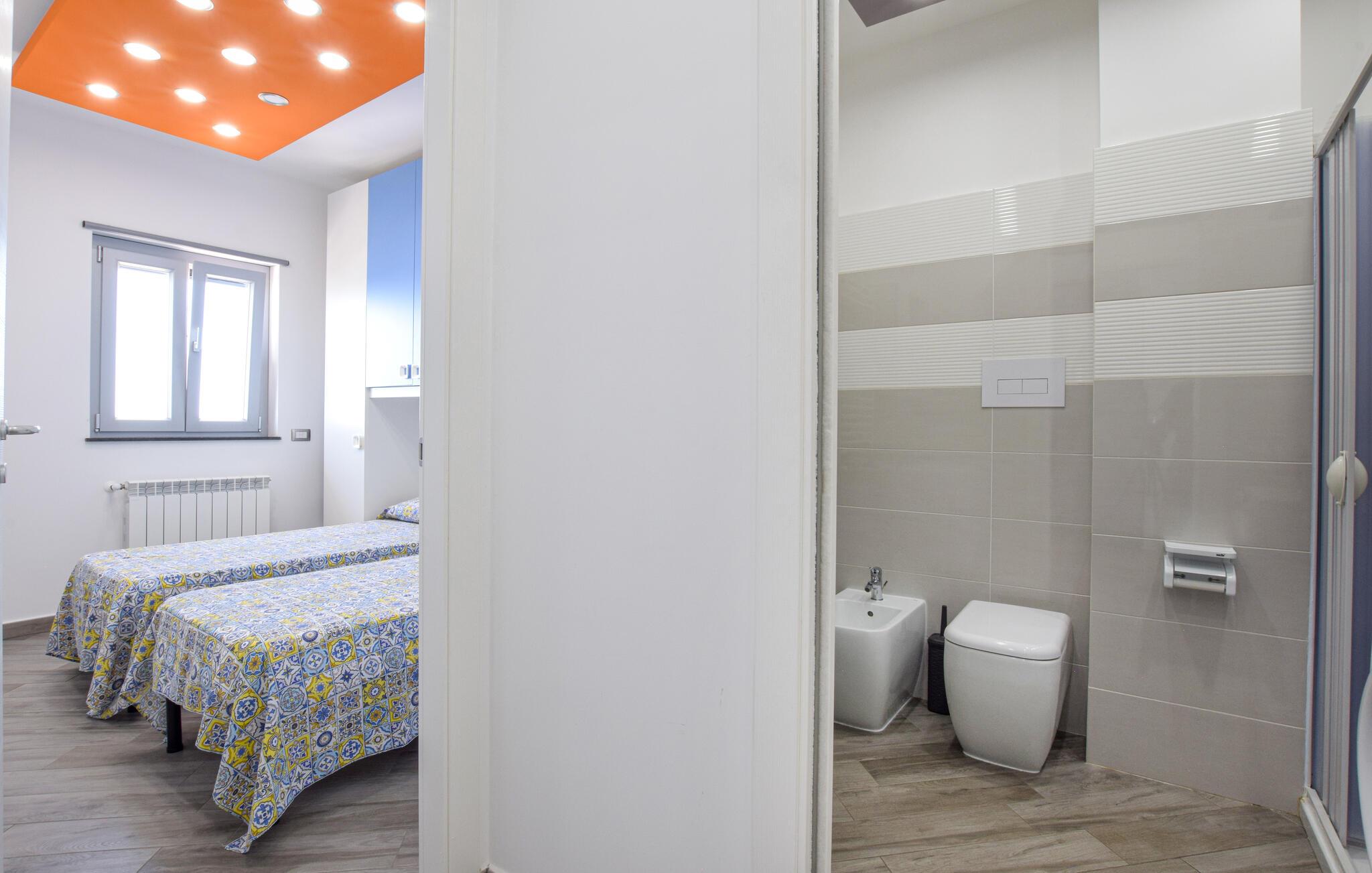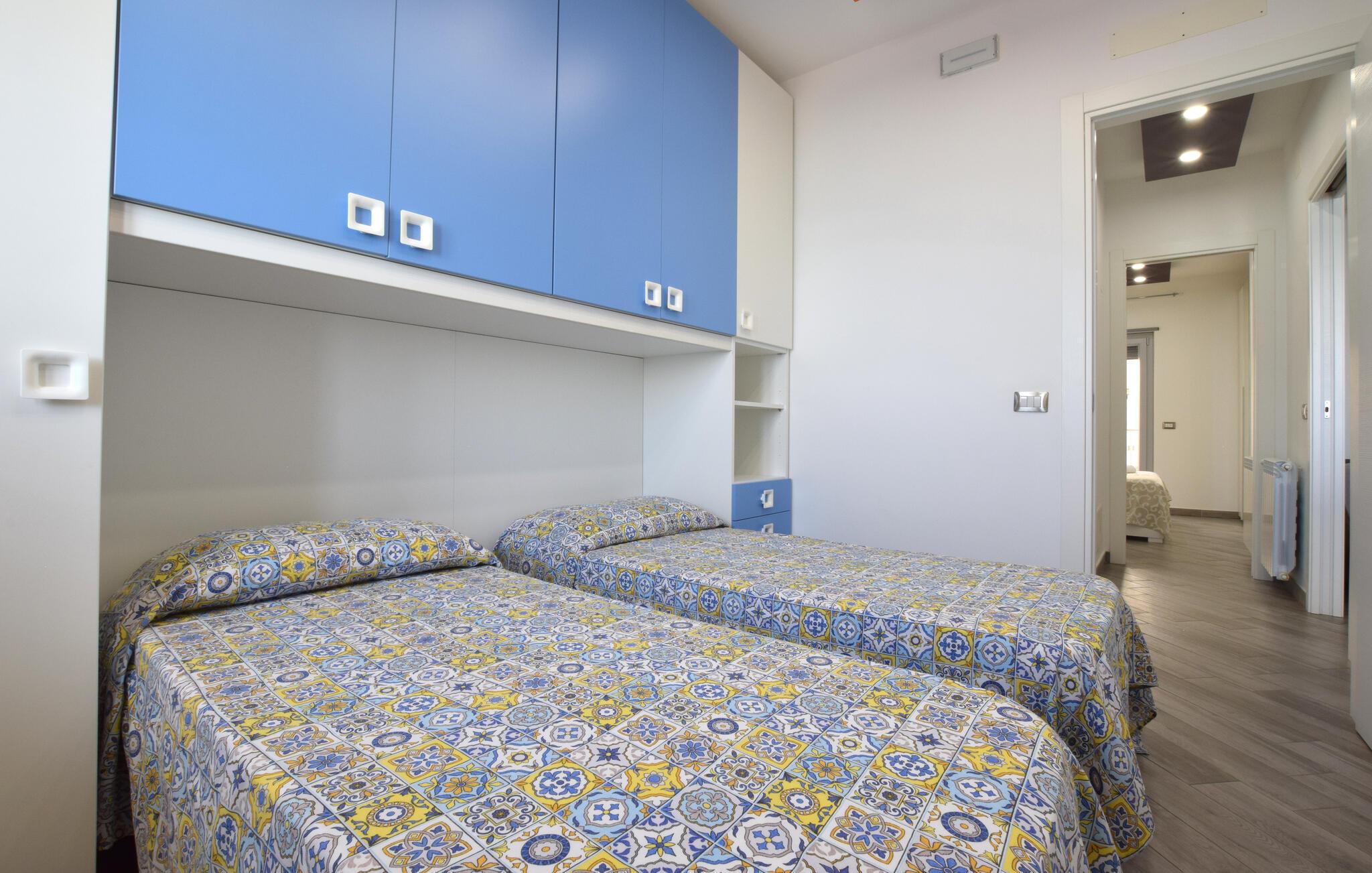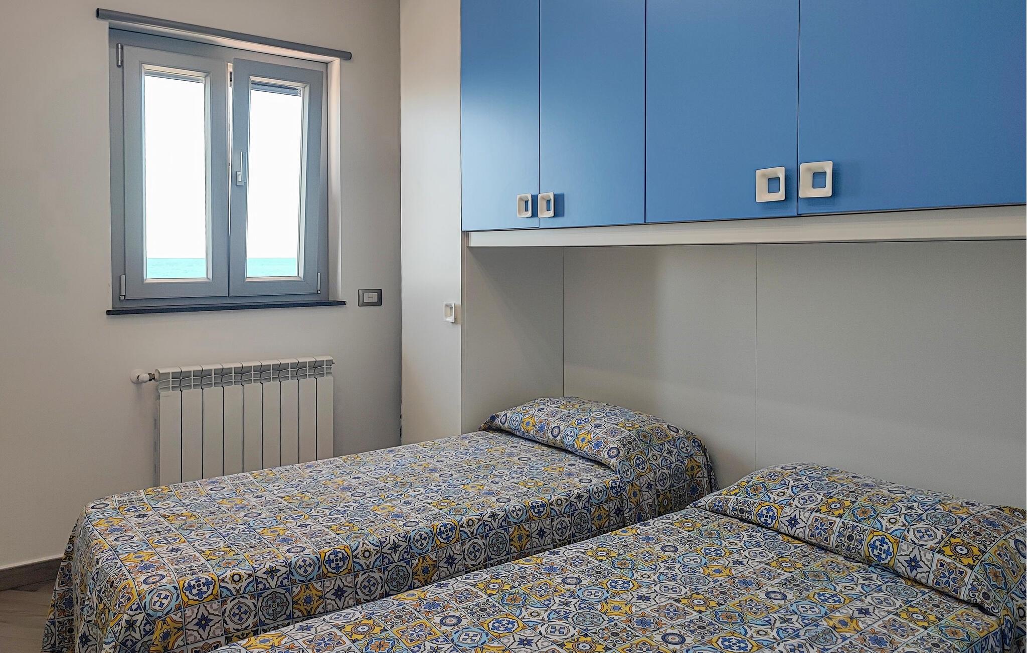 Nyd en smuk havudsigt fra denne komfortable lejlighed ved stranden. Velkommen til denne moderne lejlighed, der ligger direkte på sandstranden i Sant'Agata di Militello, hvor I kan nyde solrige dage med udsigt over det blå hav. Lad den behagelige brise strømme gennem de smagfuldt møblerede værelser, mens I tryller lækre pastaretter frem og serverer dem ved det stilfuldt dækkede spisebord. Snak på altanen over et glas vin og lad jer fortrylle af udsigten, som I kan nyde fuldt ud. Slentr gennem den charmerende gamle bydel med dens caféer og markeder, besøg det imponerende Castello Gallego, og nyd friskfanget fisk lige ved havnen. Tag på vandretur i den nærliggende Parco dei Nebrodi, hvor vilde landskaber, vandfald og udsigtspunkter med udsigt over de Lipariske Øer venter på jer. Kør langs kysten til Cefalù og beundr den berømte normanniske katedral, eller slap af på de lange sandstrande. For et rigtigt eventyr kan I tage en båd til de Lipariske Øer – Lipari eller Vulcano byder på imponerende natur og krystalklart vand.