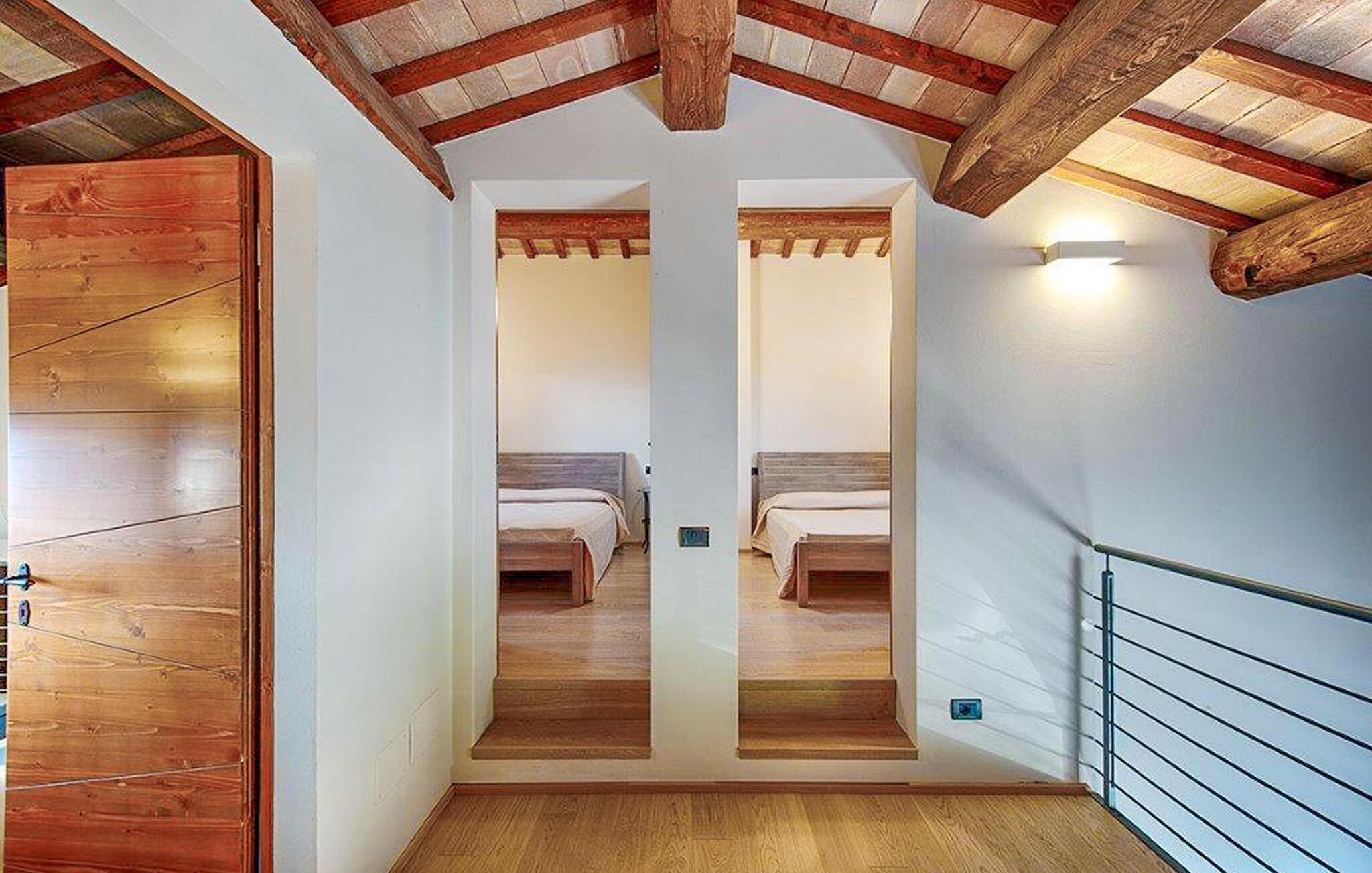 Glæd jer til en afslappende ferie i dette komfortable feriehus med panoramaudsigt og adgang til spabad. Dette lyse og indbydende hus har en forhøjet beliggenhed med fortryllende udsigt over det maleriske landskab. Nyd den hyggelige atmosfære med hyggelige måltider og harmoniske spilleaftener, brug fitnessrummet til jeres træning, og stream en spændende film efter en lang dag. Læn jer tilbage med en god bog ved pejsen eller mediter i galleriet. Det store, fælles spabad er det perfekte sted at nyde den fredelige atmosfære i den friske luft. Nyd et glas vin ved solnedgang, tænd op i grillen, eller lav lækre pizzaer i brændeovnen. Gå en tur gennem de historiske gader i Sant'Angelo, vandr gennem vinmarker og olivenlunde, og besøg de berømte trøffelmarkeder. Besøg Francesco Maria Gazzolis fødested eller Sant'Agostino-klosteret, og tag dagsture til de charmerende byer Urbino, Fossombrone og Cagli med deres farverige ugentlige markeder og hyggelige trattoriaer.