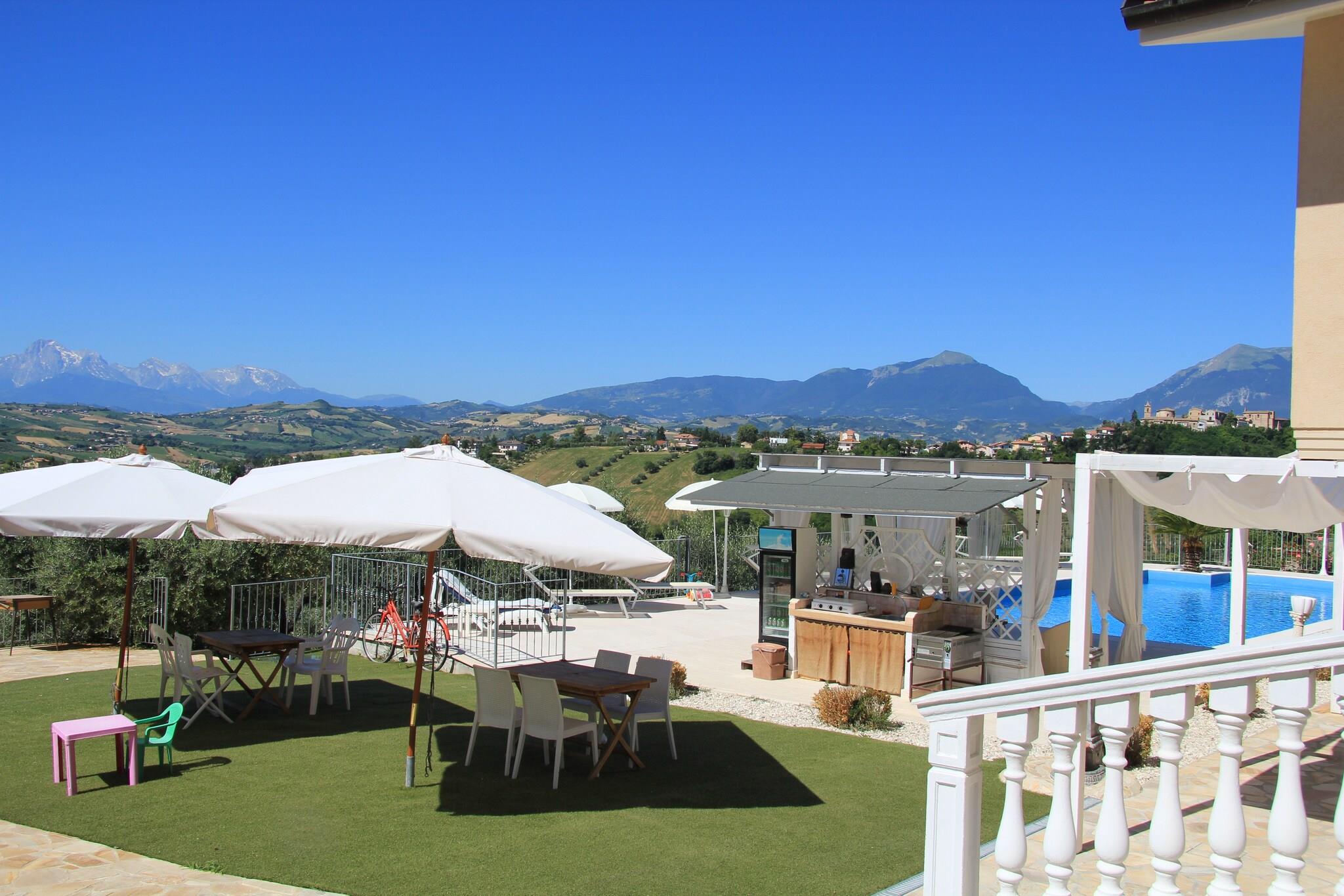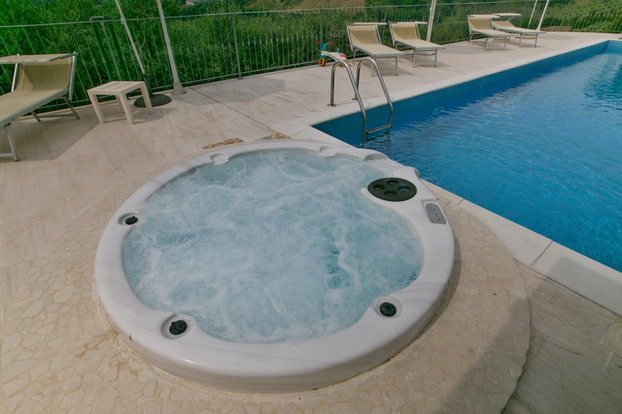 Denne charmerende villa ligger i et kuperet område i den nordlige del af Abruzzo-regionen og 11 km fra havet. Fra villaen har du en smuk udsigt over de omkringliggende bakker og dalen og Gran Sasso, Apennines højeste punkt. Villaen er elegant og smagfuldt indrettet og giver gæsterne et vidunderligt fredeligt sted. Villaen består af to lejligheder med separate indgange. Der er en smuk jacuzzi ved siden af swimmingpoolen (mod betaling, betales lokalt). Saltvandsbassinet opvarmes af solpaneler. Villa med saltvandspool og jacuzzi nær havet, smukke omgivelser. Den charmerende by Sant 'Omera ligger 800 m fra villaen. Der er flere restauranter og barer, hvor du kan smage specialiteter som porchetta og bacalà. Villaen er omgivet af en stor olivenplantage og en stor have med en dejlig pool. Ejeren bor tæt på villaen. Området er perfekt til vandreture og cykling, og det er værd at Gran Sasso Naturpark Monti della Laga, Civitella del Tronto, Campli, Teramo og Atri.