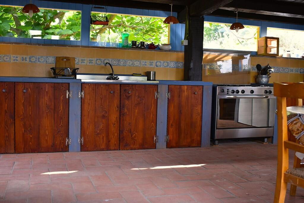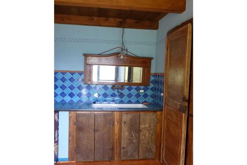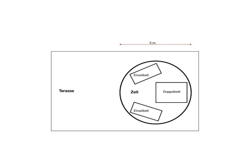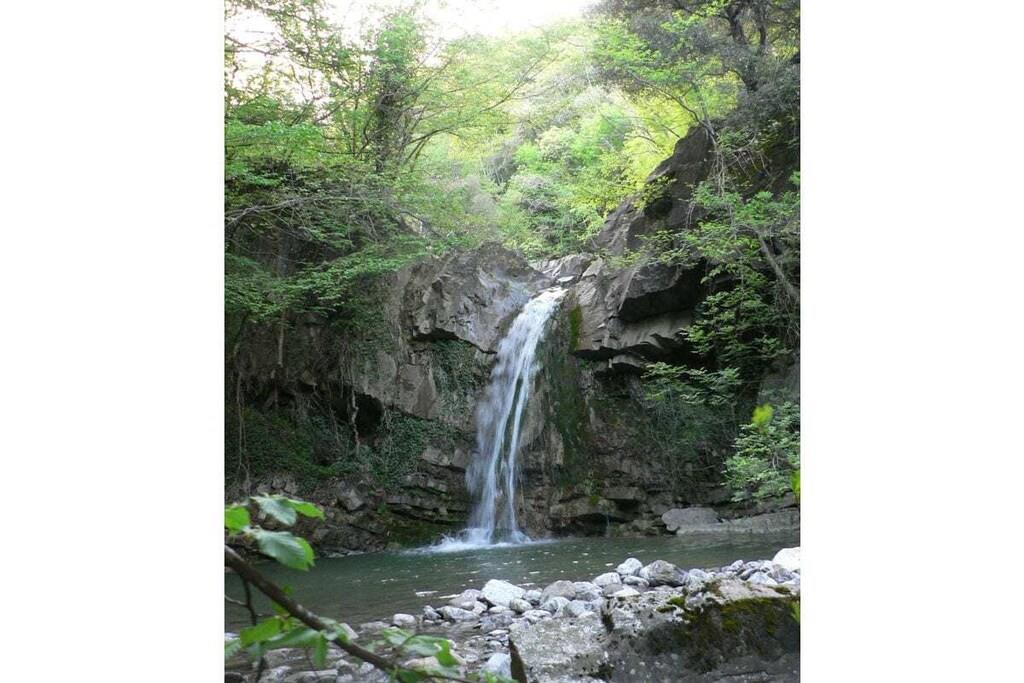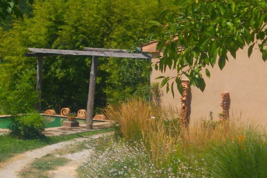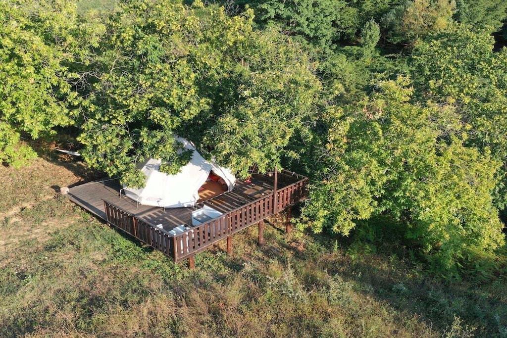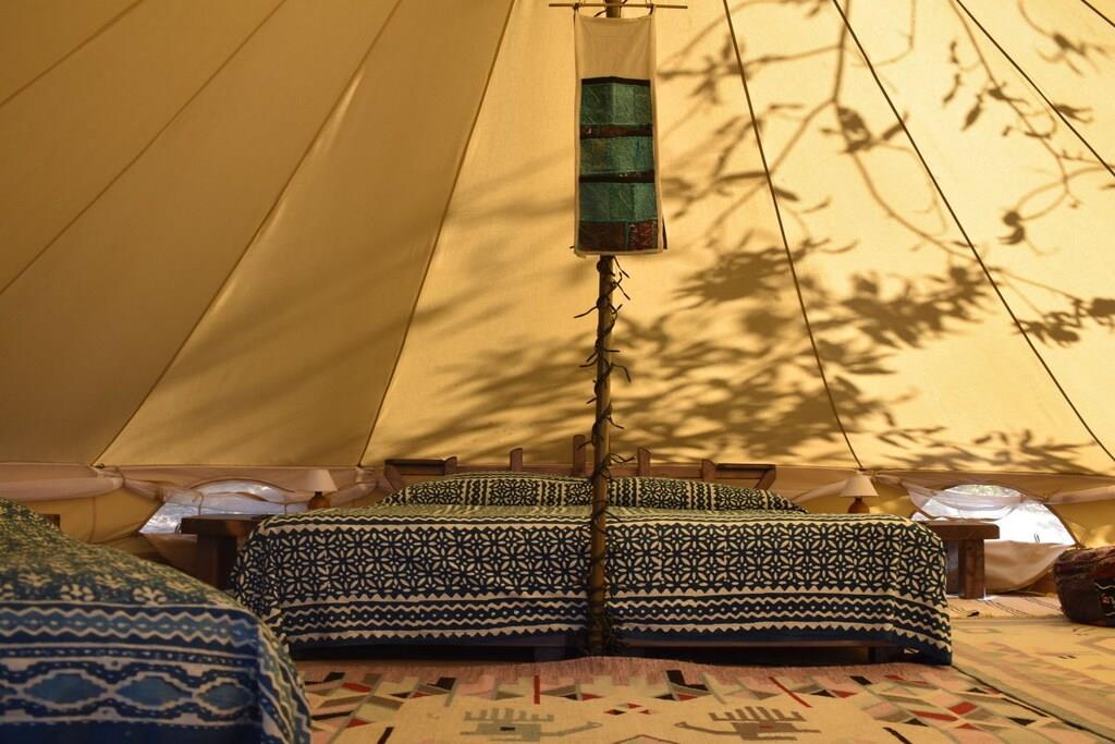 Teltet er placeret på en stor træterrasse i skyggen af århundreder gamle kastanjetræer og tilbyder maksimal privatliv. Teltet har en dobbeltseng og to enkeltsenge efter anmodning. Der er også tæpper på gulvet, og der er strøm- og vandtilslutning. Terrassen med udsigt over dalen har et spisebord med stole, en parasol og liggestole. Der er et rummeligt fælleskøkken udstyret med alt, hvad du behøver for et behageligt ophold: ovn, gaskomfur, privat køleskab, bestik, tallerkener osv. Brusere og toiletter (private) er placeret ved siden af teltet, og poolen ligger cirka 50 meter fra teltet.
