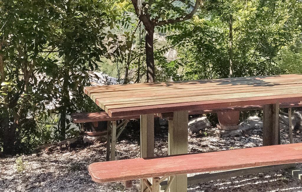 Udenfor tilbyder et skyggefuldt siddeområde med et træbord og bænke ideelle betingelser for udendørs spisning. Den store grund, beplantet med oliventræer, byder på fred og ro midt i naturen - ideelt for gæster, der søger afslapning og en autentisk følelse.
