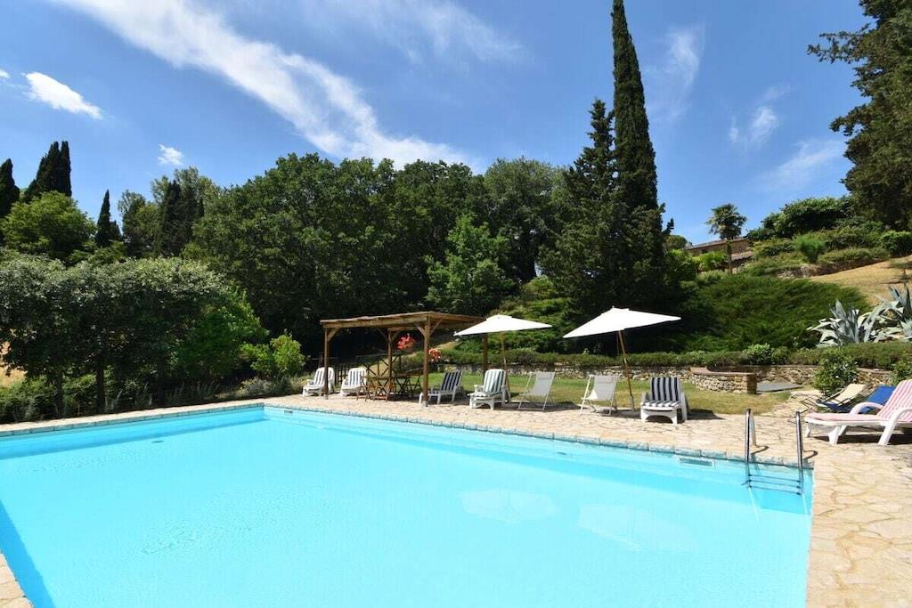 Smukt landsted fra det 18. århundrede med typisk sienesisk arkitektur. Herfra kan du nå Chianti-regionen og byen Siena, som byder på et væld af kulturelle attraktioner, på få minutter (6 km). Den nærmeste landsby ligger 3 km væk og har en bar, restaurant og supermarked. Lejligheden "Guest House" (80 m²), som strækker sig over to etager, har egen indgang via gårdhaven. Hovedrummet i stueetagen indeholder en stue med en enkelt sovesofa, et køkken og en spiseplads. Herfra fører en trappe til mezzaninen, som har en enkeltseng. Badeværelset er udstyret med bruser. På anden sal er der et stort soveværelse med en dobbeltseng og en barneseng. Loftet har typiske sienesiske bjælker, og møblerne er i typisk toscansk stil. Uden for lejligheden er der et privat område med en pergola, stole, en parasol og et bord i ejendommens gårdhave. En stor have med cypresser, egetræer, lindetræer og middelhavsplanter og -blomster omgiver huset. Den 6 x 12 m store swimmingpool ligger på en pergola-overdækket terrasse med smuk udsigt over skov og enge. De omkringliggende 2 hektar jord er beplantet med oliven- og frugttræer. Ejendommen ligger i en højde af 350 m og har en meget solrig beliggenhed.