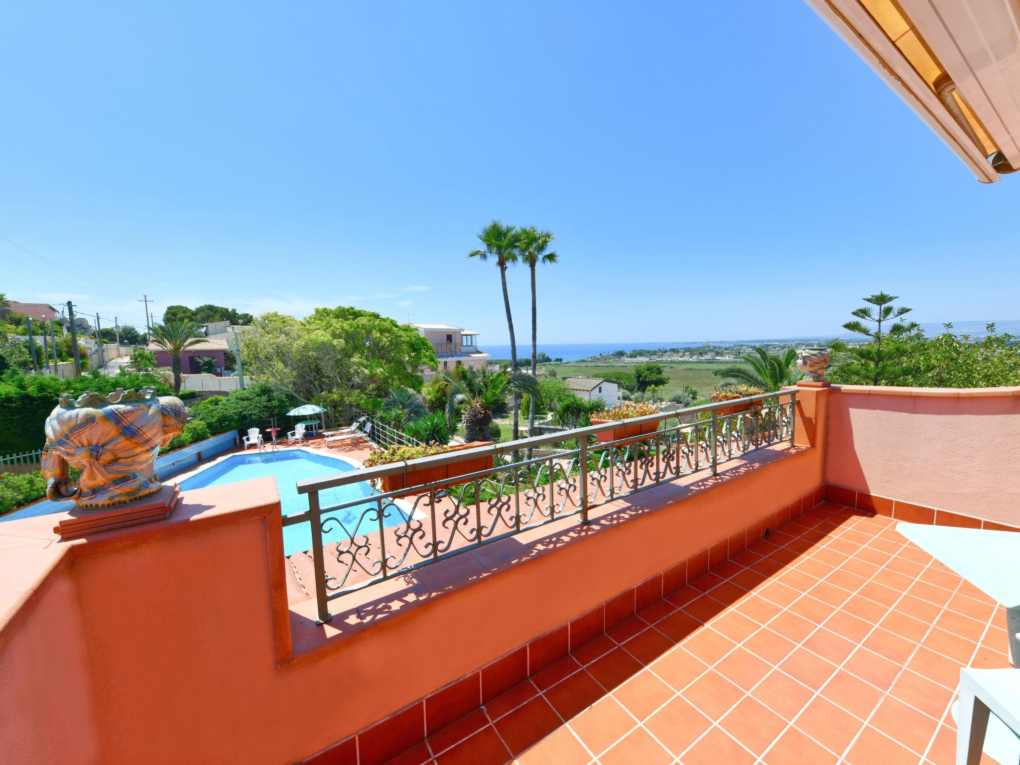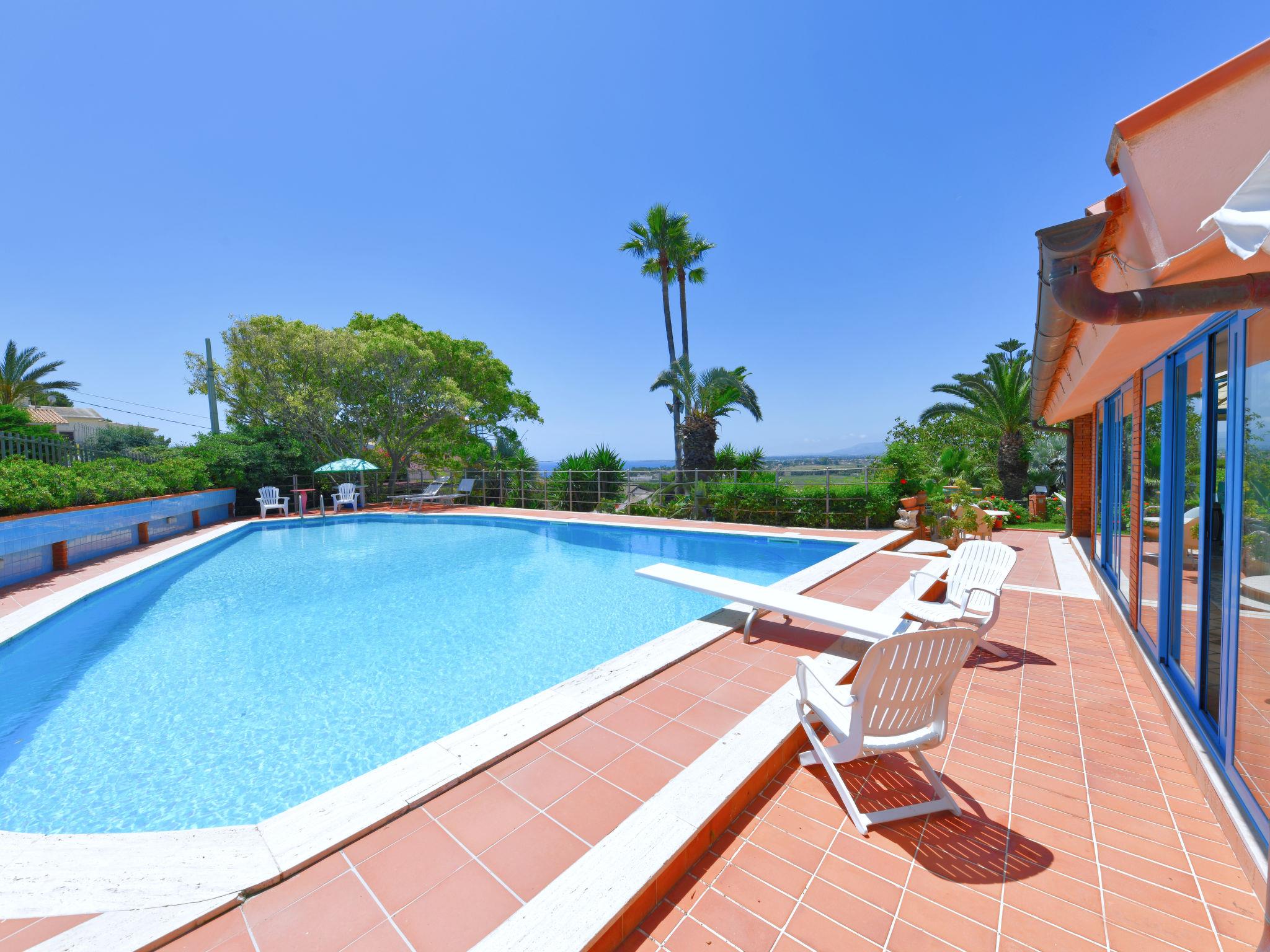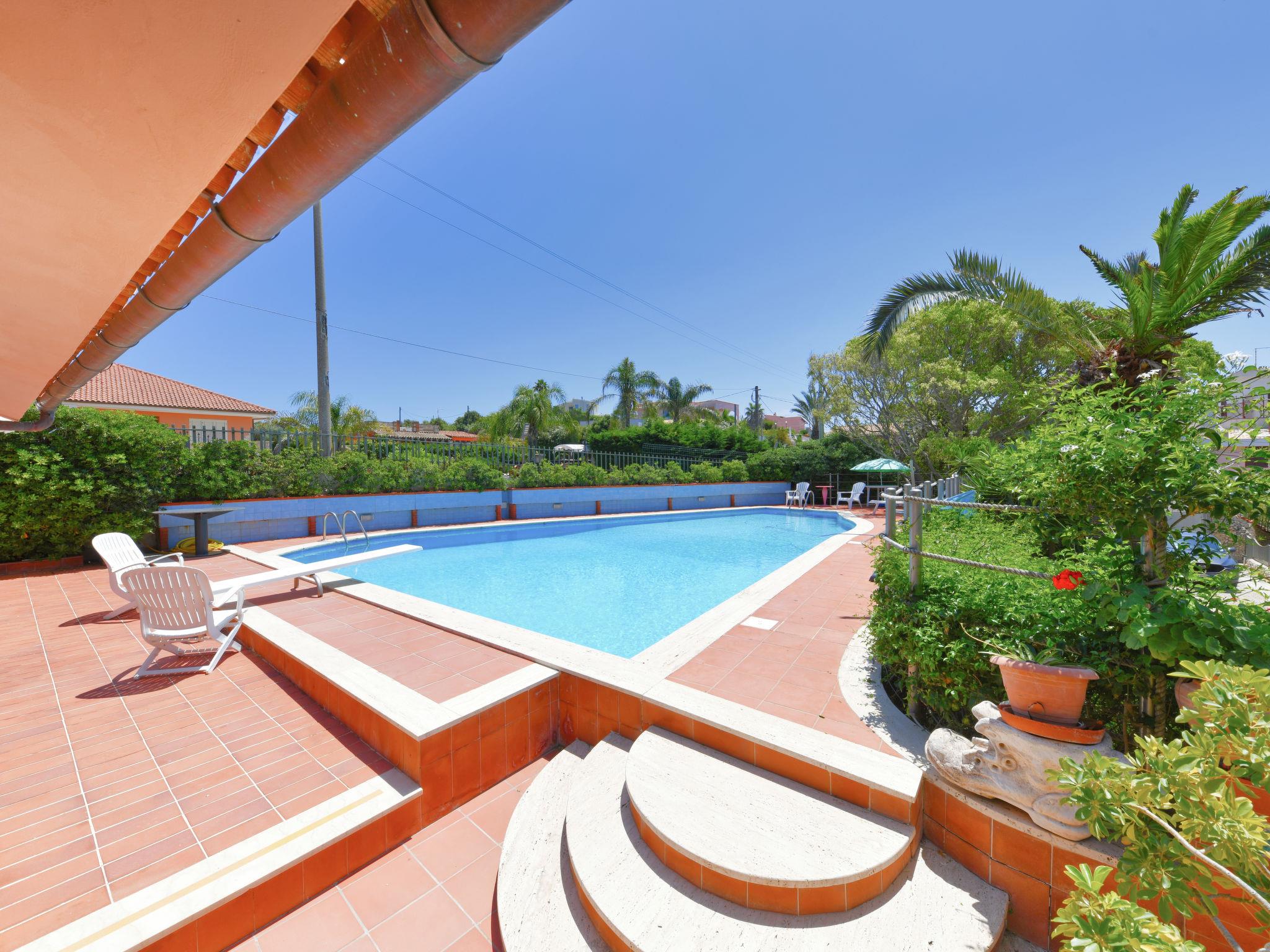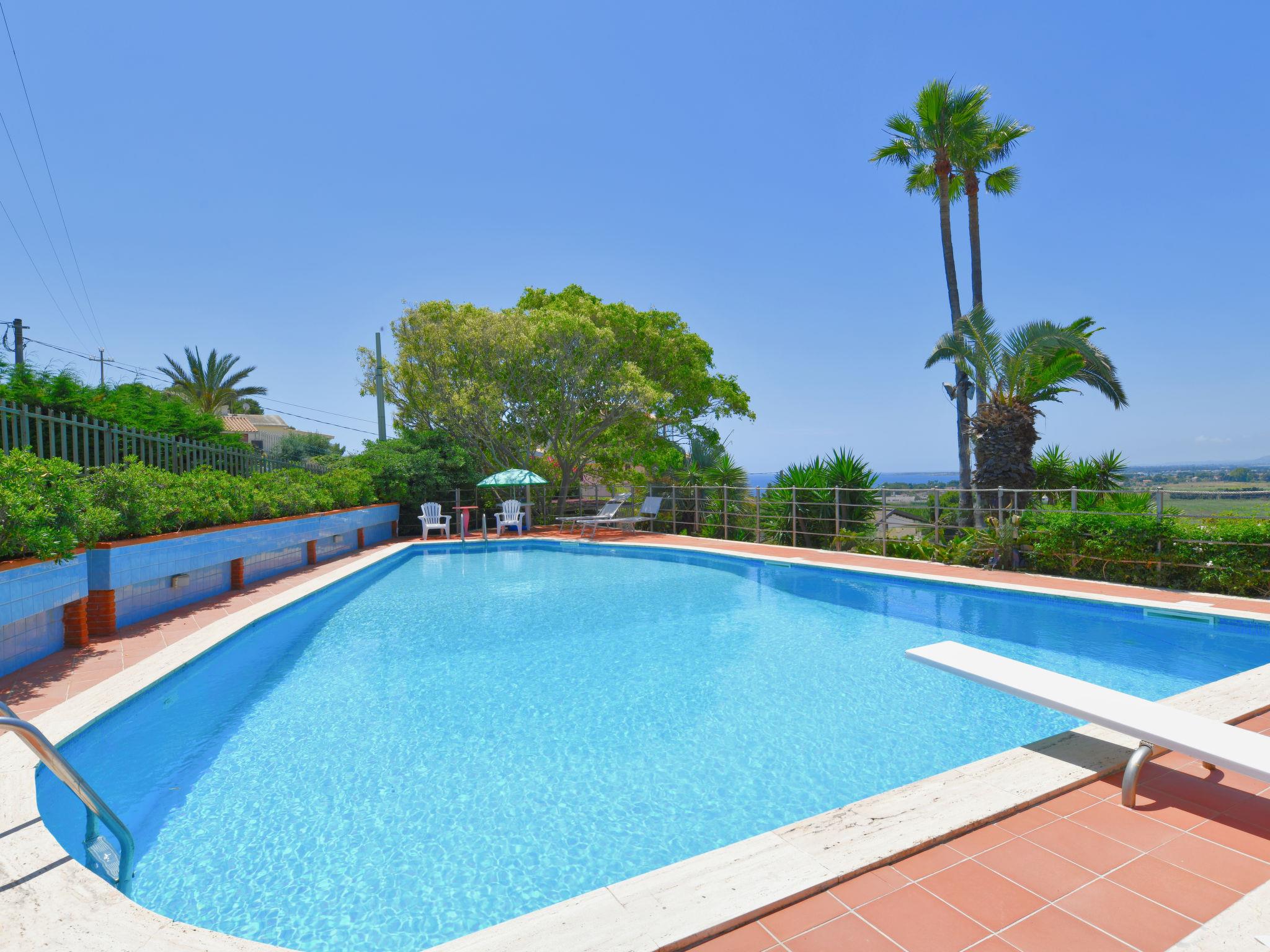 Large villa "Vella", surrounded by meadows. In the resort Terrauzza, 10 km from the centre of Siracusa, in a quiet, sunny position, 700 m from the sea, 700 m from the beach. Private: property 3'000 m2 (fenced), large, well-kept garden 2'100 m2 with lawn and trees, swimming pool (80 m2, depth 120 - 150 cm, seasonal availability: 01.Apr. - 31.Oct.). Outdoor shower, barbecue. In the house: fitness room. Parking. Bus stop 200 m, railway station "Siracusa" 9 km, sandy beach "Arenella" 5.5 km, rocky beach "Terrauzza" 700 m. Nearby attractions: Avola 23 km, Noto 32 km, Marzamemi 50 km, Ispica 53 km, Isola delle Correnti Punto Sud Sicilia 58 km, Modica 68 km. Well-known ski regions can easily be reached: Punto Partenze Sud Escursione Etna 105 m. Well-known lakes can easily be reached: Riserva Naturale Laghetti del Cassibile 34 km. Hiking paths: Riserva Naturale Faunistica di Vendicari 40 km. Please note: car recommended. The owner lives in the same residence.