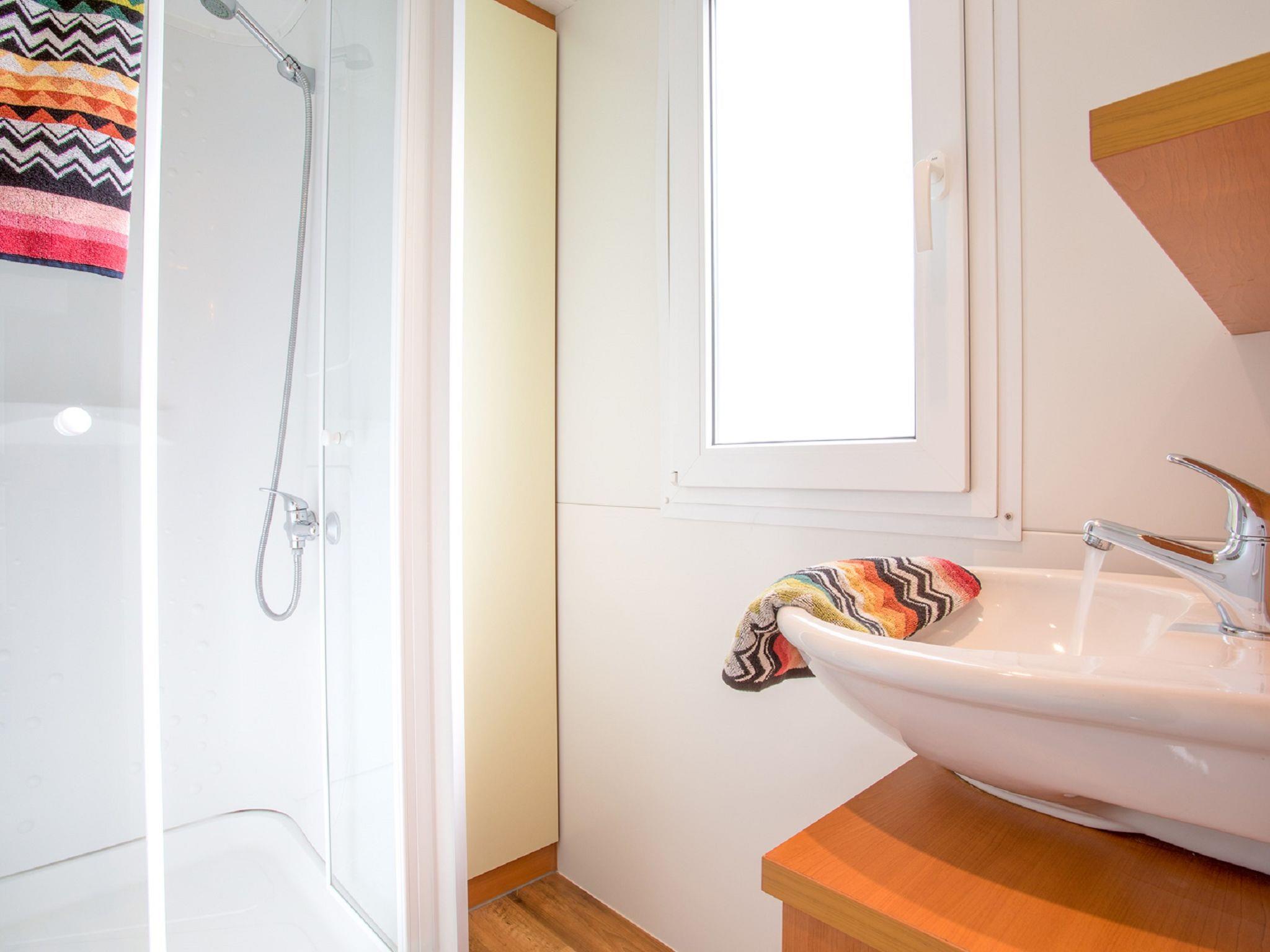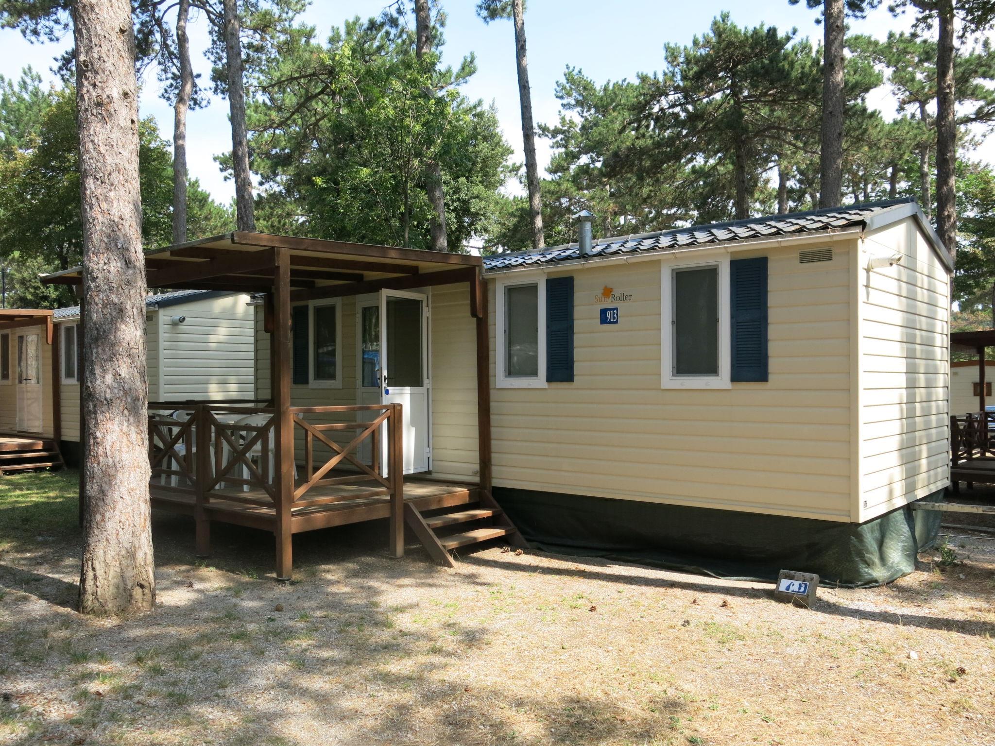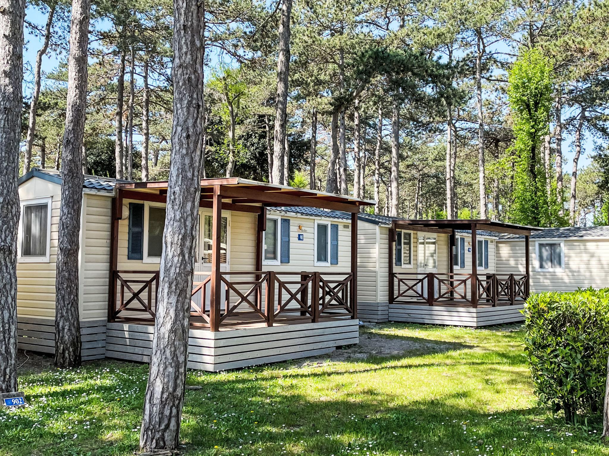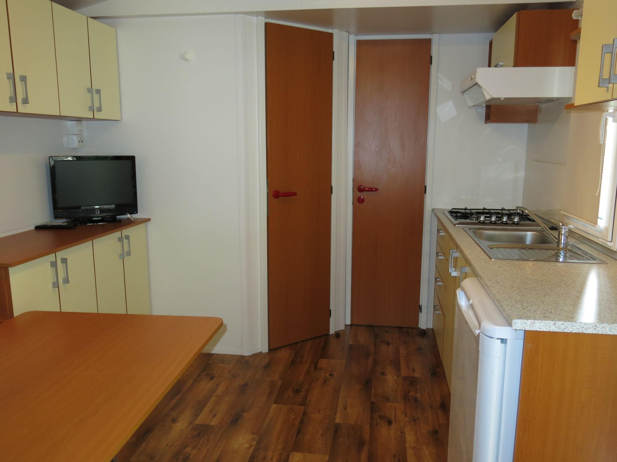 "Baia Blu Romantic", 3-room mobile home 24 m2. Modern furnishings: living/sleeping room with 1 sofabed (70 cm, length 160 cm), dining table and digital TV. 1 room with 1 french bed (140 cm). 1 room with 2 beds (70 cm), 1 x 1 bunk beds (70 cm, length 120 cm). Kitchenette (4 gas rings). Shower, sep. WC. Air-conditioning, forced-air heating (extra). Terrace roofed. Terrace furniture. Parking (1 car). Please note: non-smokers only. Bed layout is flexible. There are more sleeping options available than the maximum number of people allowed which may, however, not be exceeded. IT032001B169XD3QUG