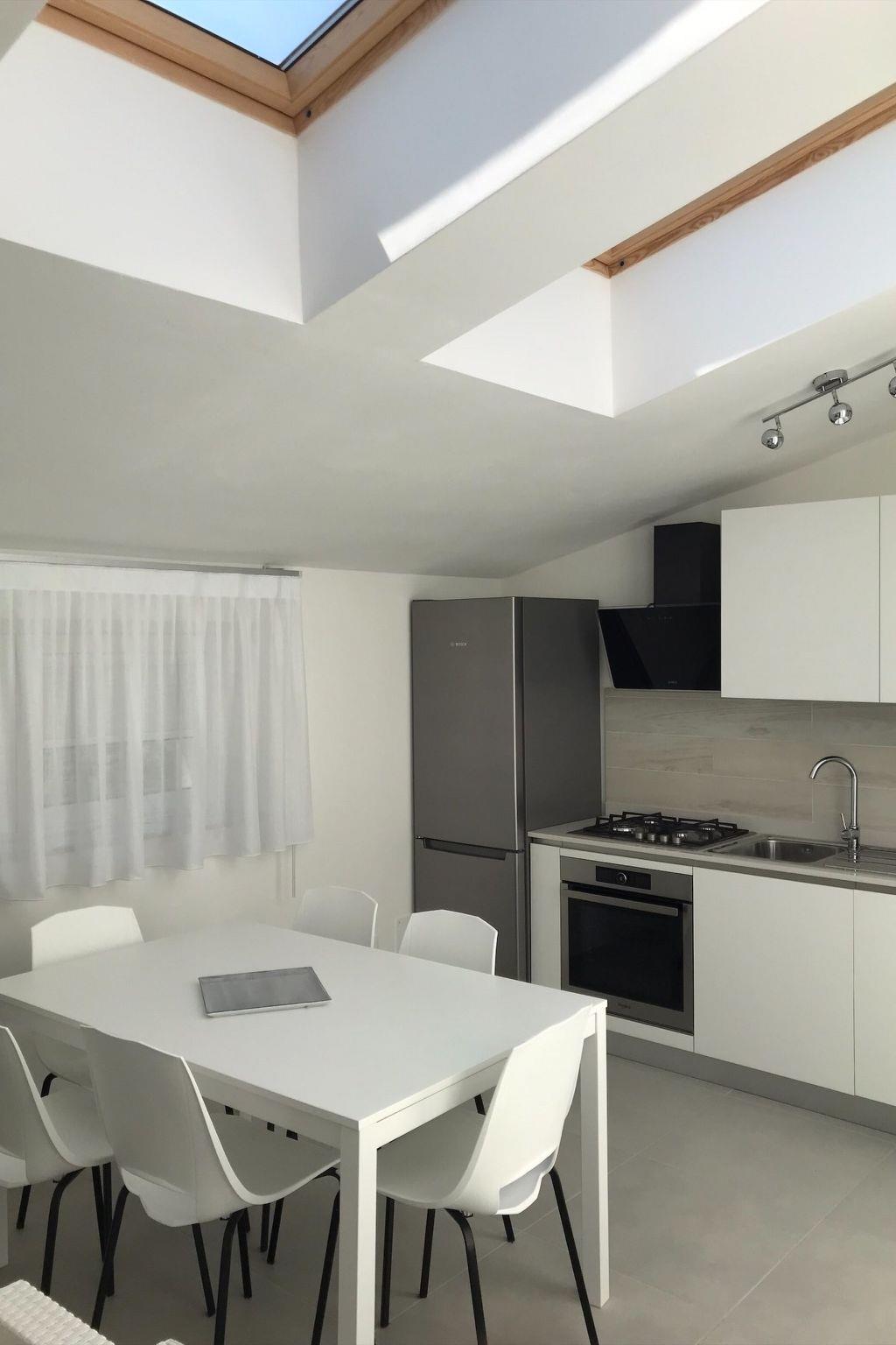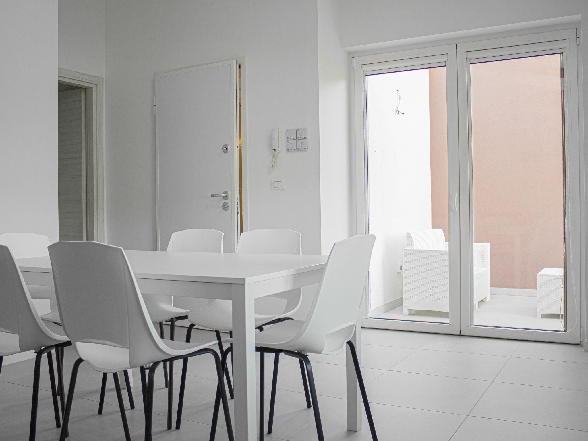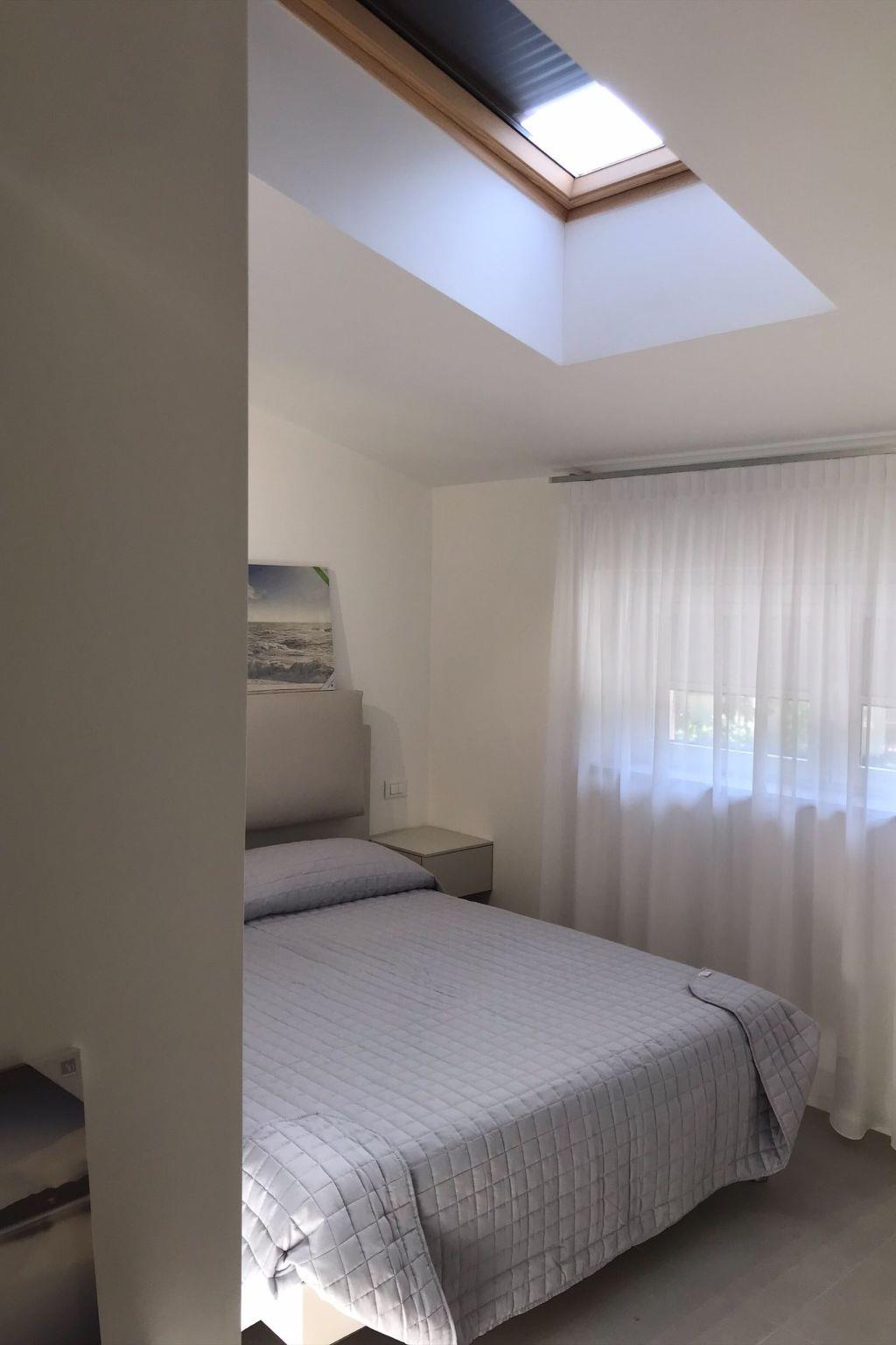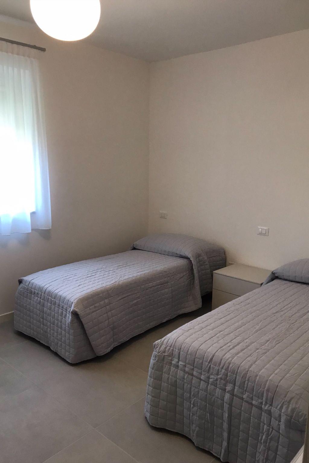 "Residence Mare Azzurro, App. Falesie", 3-room apartment 85 m2, on the top floor. Spacious and bright, modern furnishings: living/sleeping room with 1 double sofabed, dining table and satellite TV. 1 double bedroom with shower/WC. 1 room with 2 beds. Kitchenette (oven, dishwasher, 4 gas rings, microwave, freezer, electric coffee machine). Shower/bidet/WC. Air-conditioning, forced-air heating. Terrace partly roofed. Terrace furniture. Facilities: washing machine, baby cot for up to 2 year olds (extra). Internet (WiFi, extra). Parking (1 car) at the house. Please note: non-smokers only. This flat is located in the new small residence with a total of 6 flats, approx. 50 metres from Camping Village Mare Pineta. Lift in the residence. IT032001B4K8LW2DT5