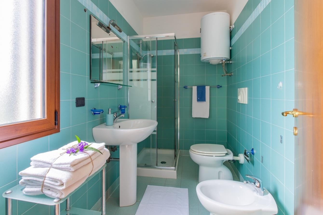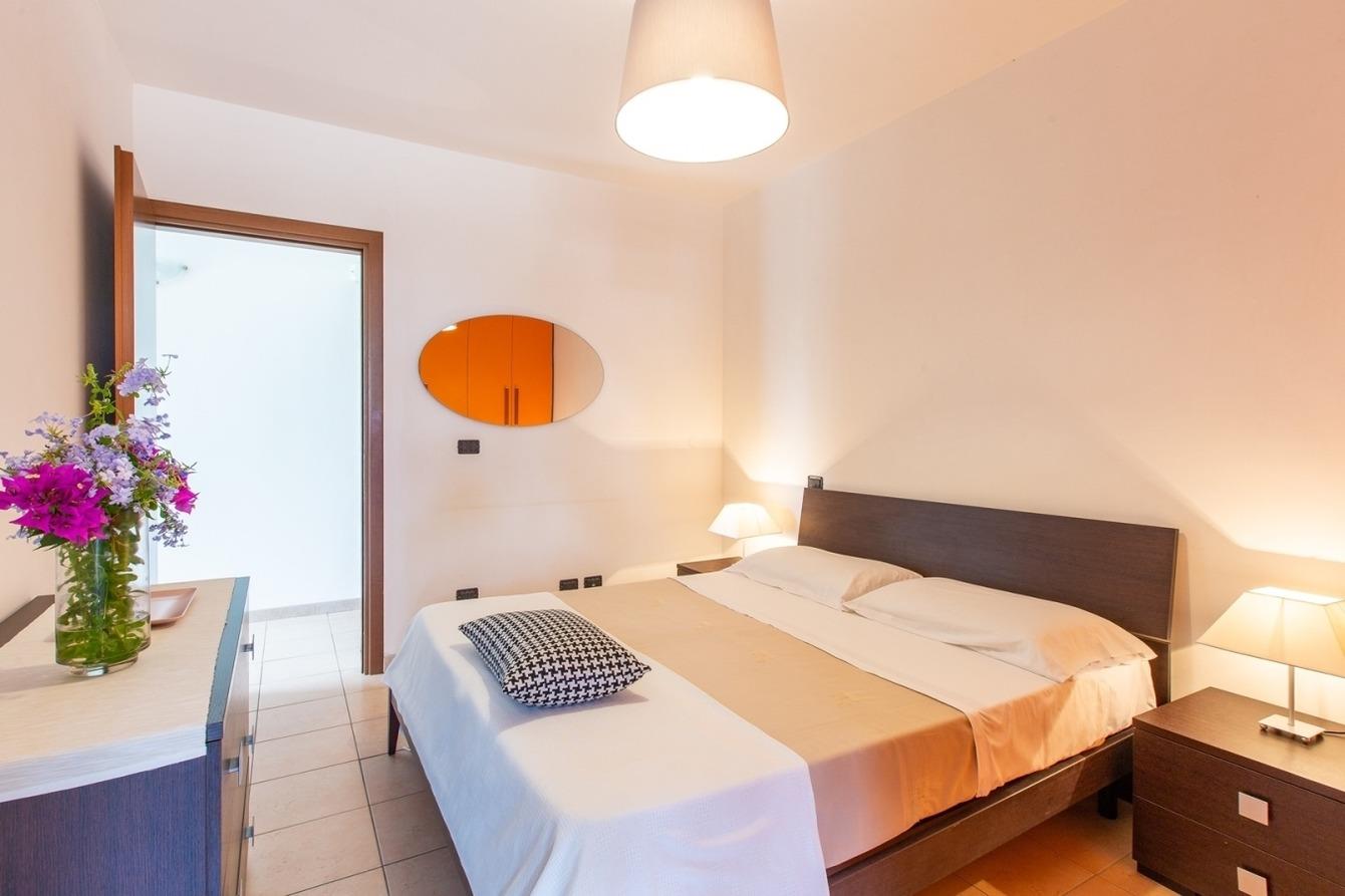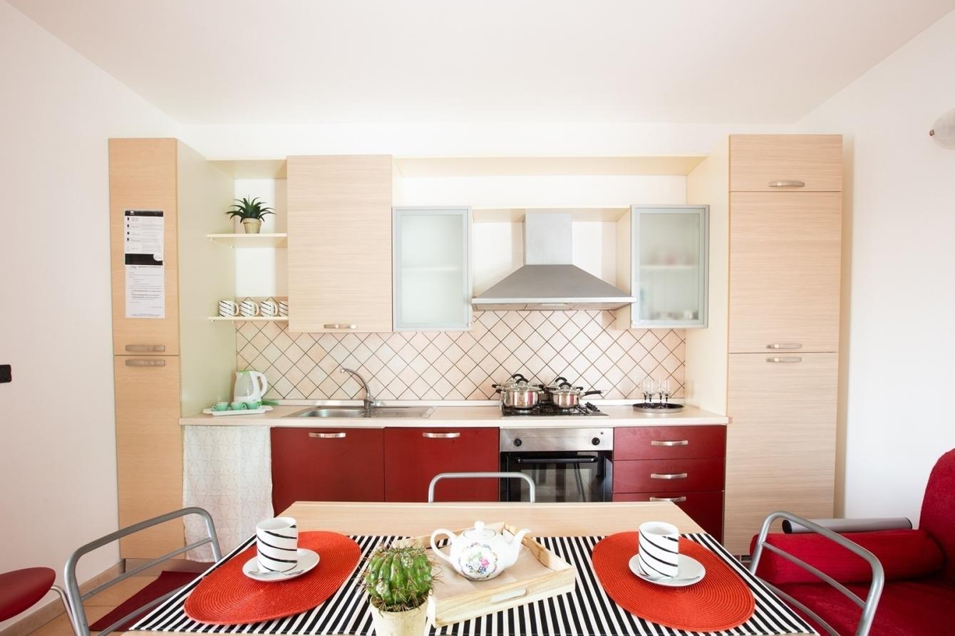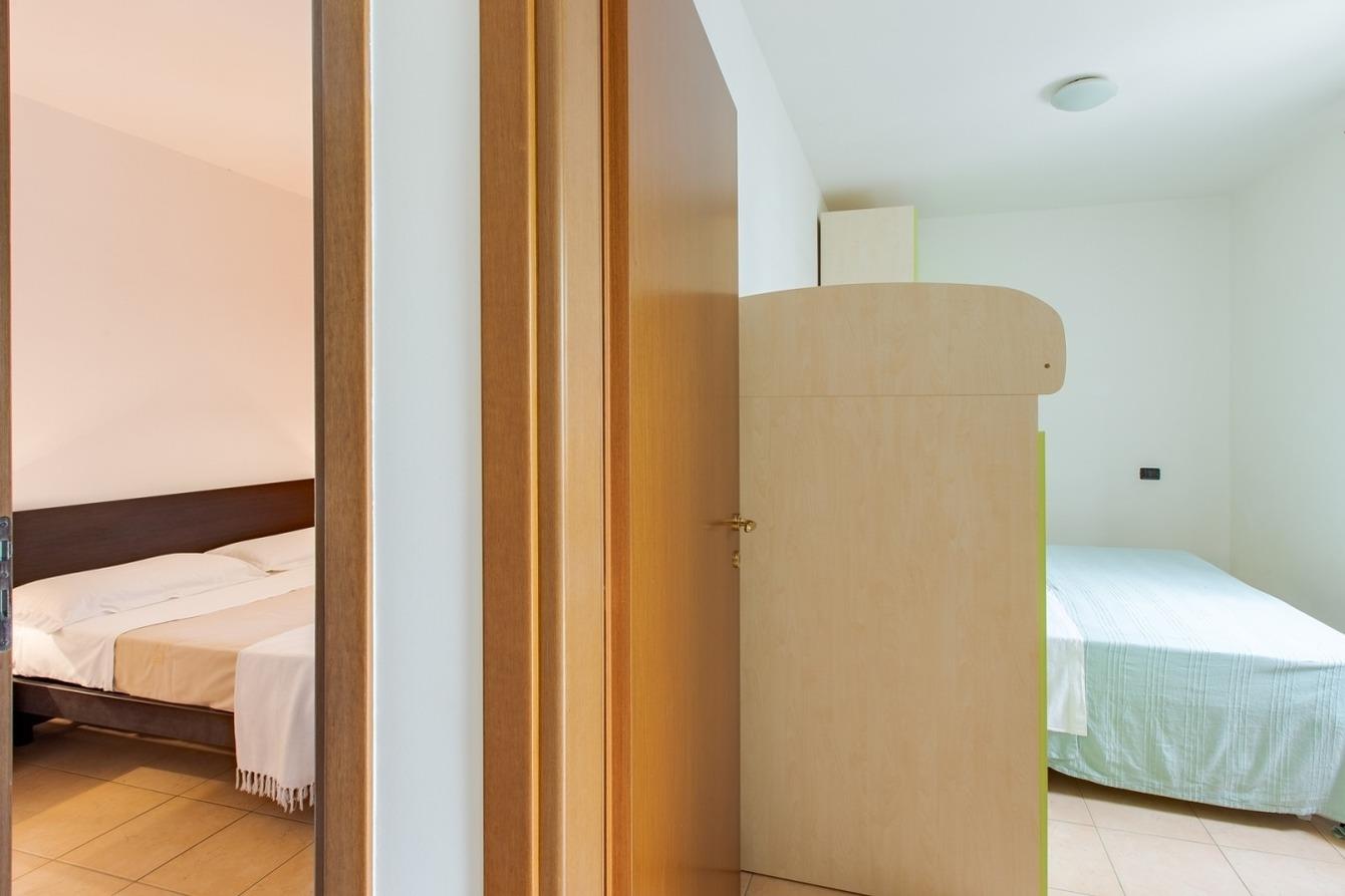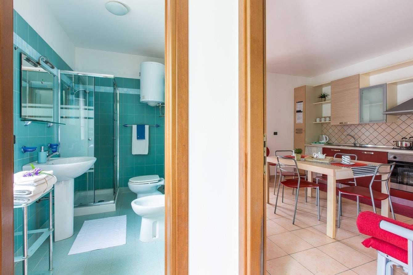 1 Wohnküche mit Schlafcouch und TV, Veranda zum Essen im Freien, 2 Schlafzimmer mit Doppelbett und n.1 Badezimmer mit Dusche. Die Klimaanlage befindet sich im Flur.