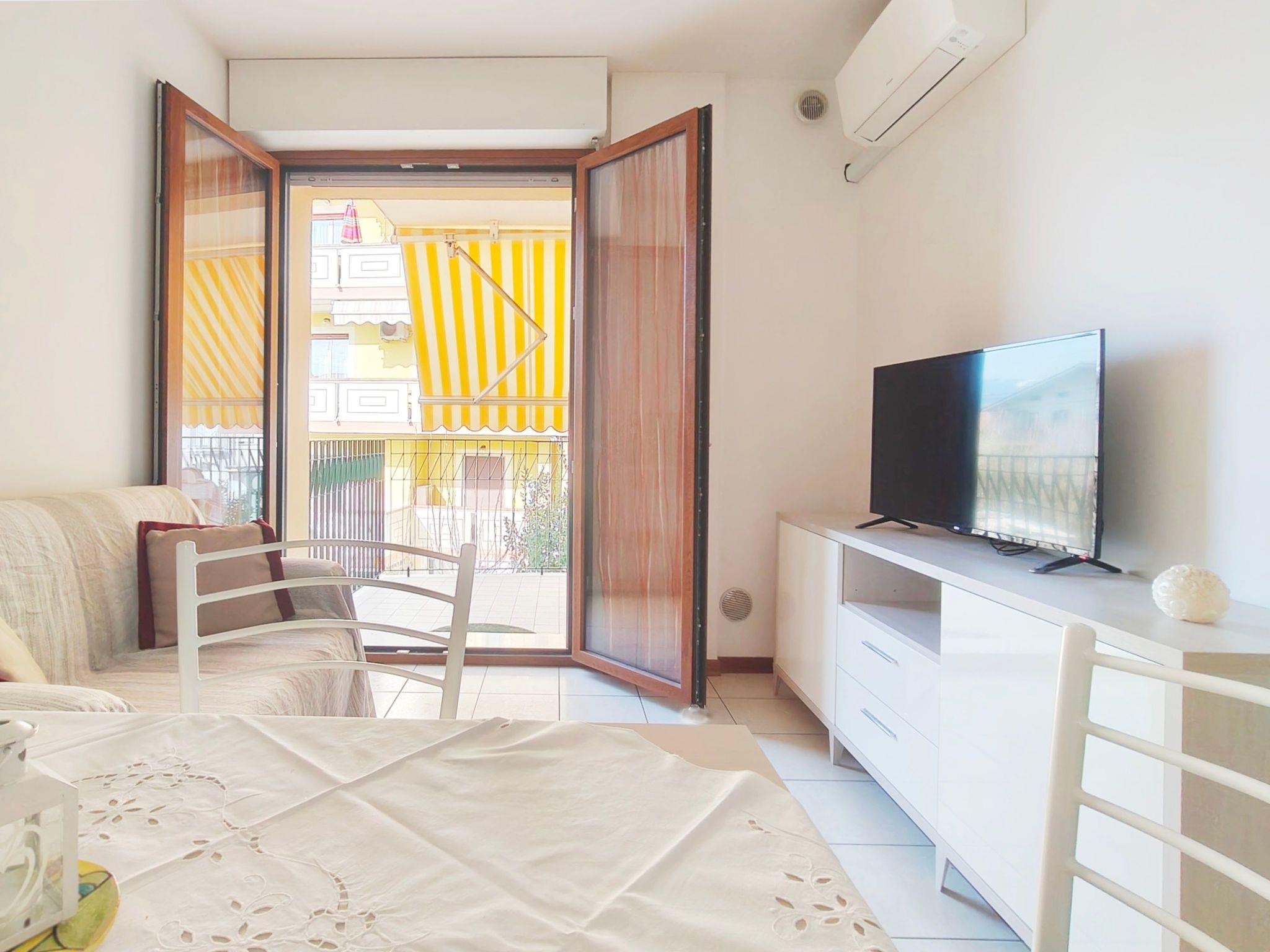 The flat is well furnished and has air conditioners positioned both in the living room and in the double bedroom; it consists of an entrance hall, living room with kitchenette complete with suitable equipment and a spacious terrace with side sea view, equipped with tables and chairs for outdoor use as well as a sunshade awning; from the east-facing double bedroom there is access to a balcony with front sea view. The small bedroom has bunk beds and the bathroom has a shower cubicle.