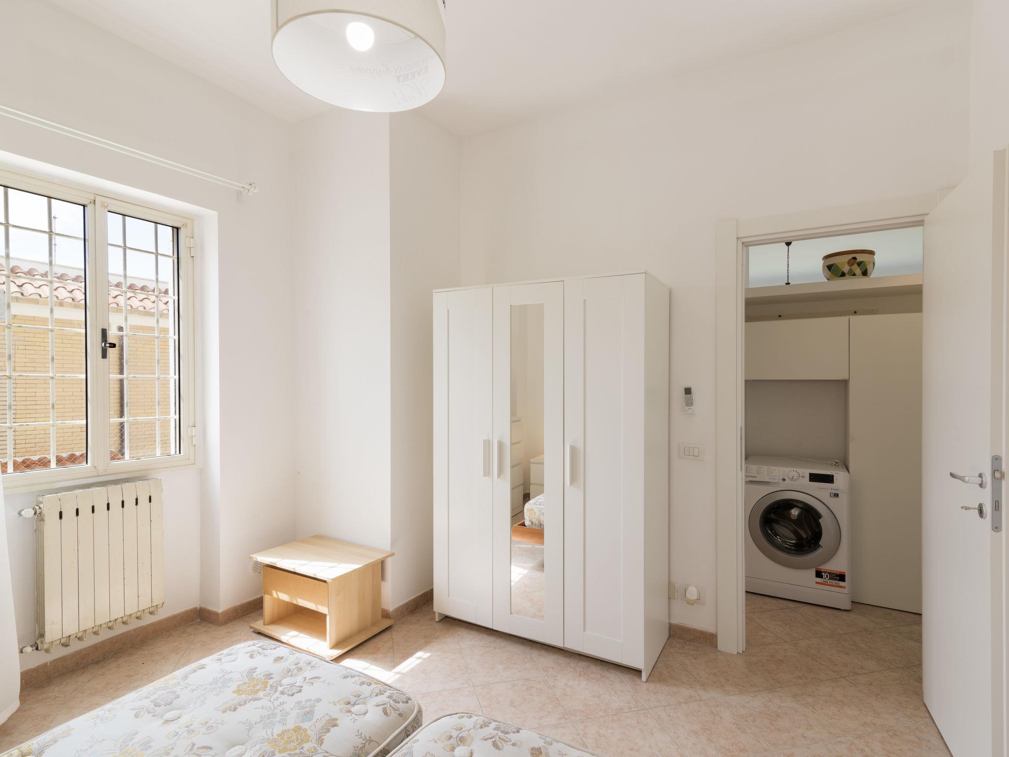 "Rome's Beach House 1", 2-room semi-detached house 45 m2, on the upper ground floor. Object suitable for 3 adults + 1 child. Bright, comfortable and cosy furnishings: living/dining room with 1 sofabed, satellite TV and air conditioning. Exit to the terrace. 1 double bedroom with 1 double bed. Kitchen-/living room (4 induction hot plates, kettle, microwave) with 1 sofabed and gas heating. Shower/WC. Very beautiful view of the sea. Facilities: washing machine. Suitable for families. IT058079C2VTFT2LRU