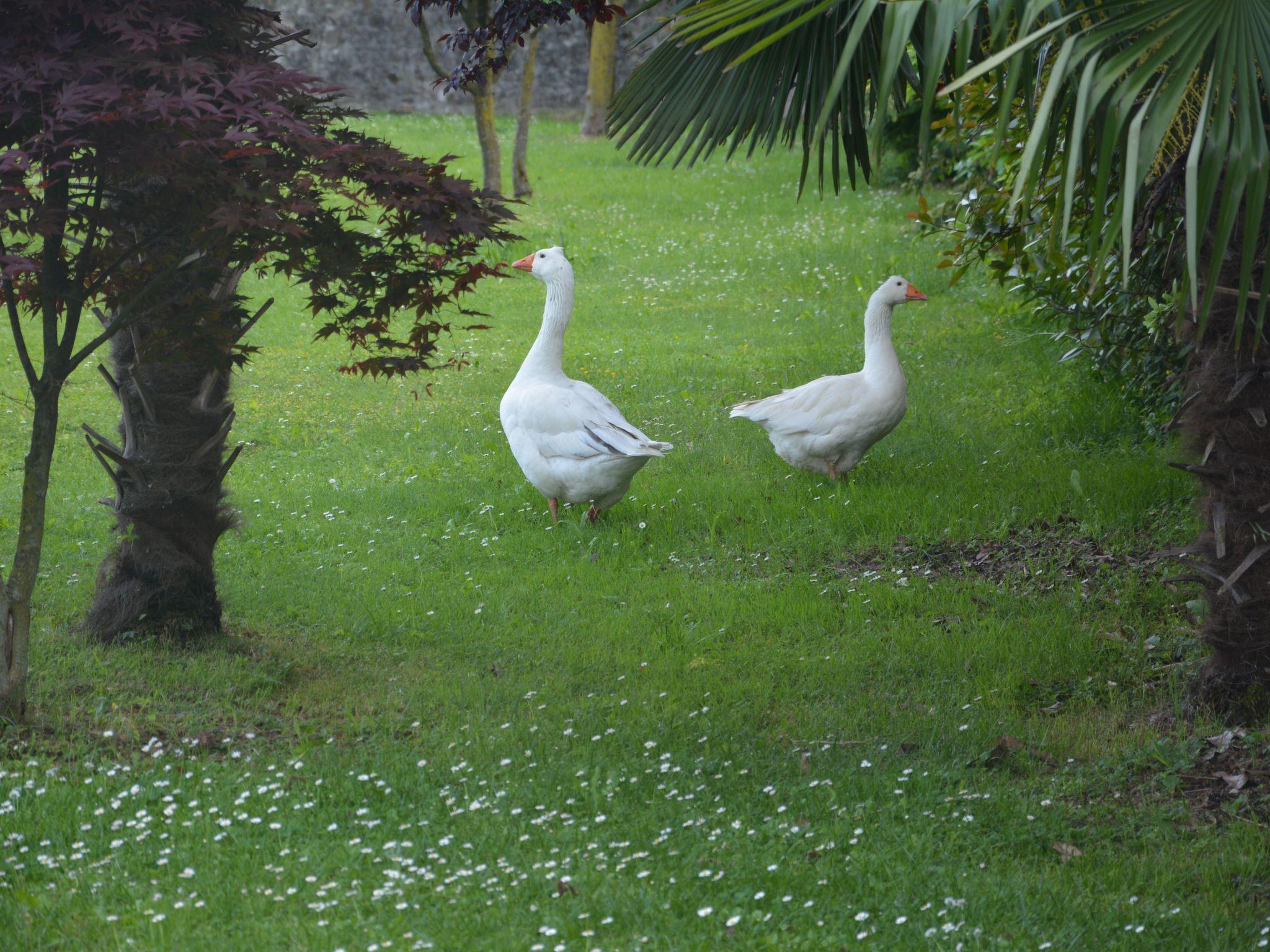 Outside, a fenced plot of over 2 hectares invites you to spend relaxing hours. The 3000 m² garden and meadow, surrounded by historic crenellated walls, offer the perfect setting for relaxation and leisure with a pool, sun loungers, parasols and a barbecue. A terrace with garden furniture and parasol is also a personal retreat. There are also parking facilities and the company of friendly dogs, horses, geese and cats not far from the garden.