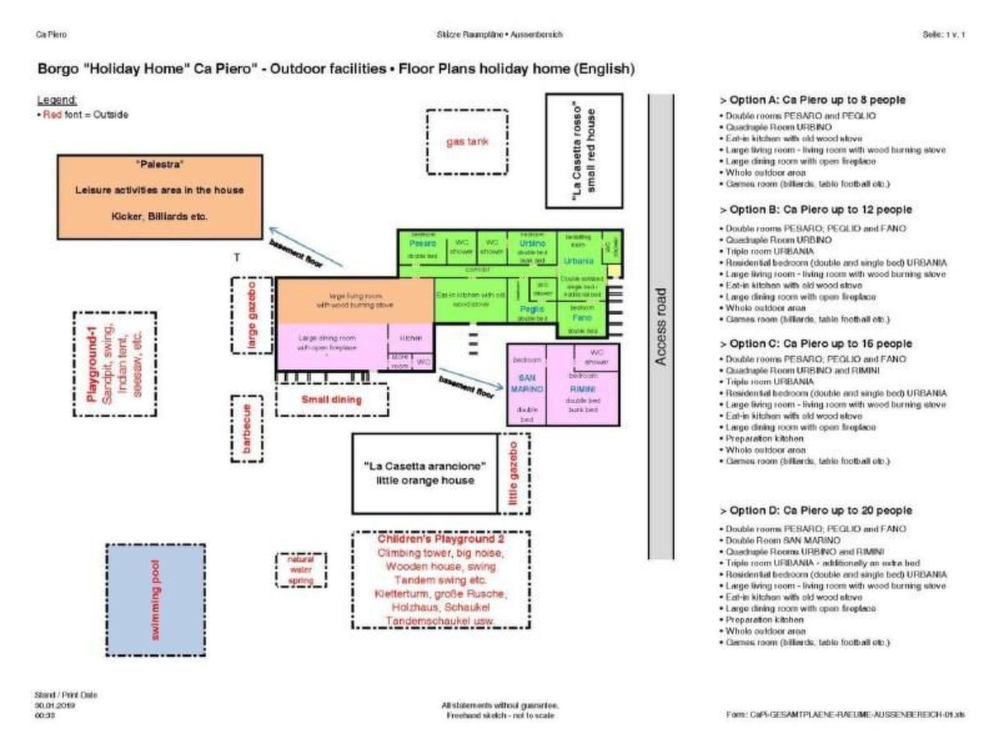 Im Inneren von Ca' Piero, a cosy and warm atmosphere that radiates the warmth of the south awaits you. The accommodation offers cosy double bedrooms, each with a bathroom, and a small living room with sofa bed, fireplace and pellet stove. Two fully equipped kitchens, a large dining room with an impressive open fireplace and a cosy living room of over 65 m² are available for communal meals. Here you will also find a stereo system, DVD player, TV system and Internet connection. Entertainment is provided by the library, games collections and a newly furnished games room with table football and pool table.