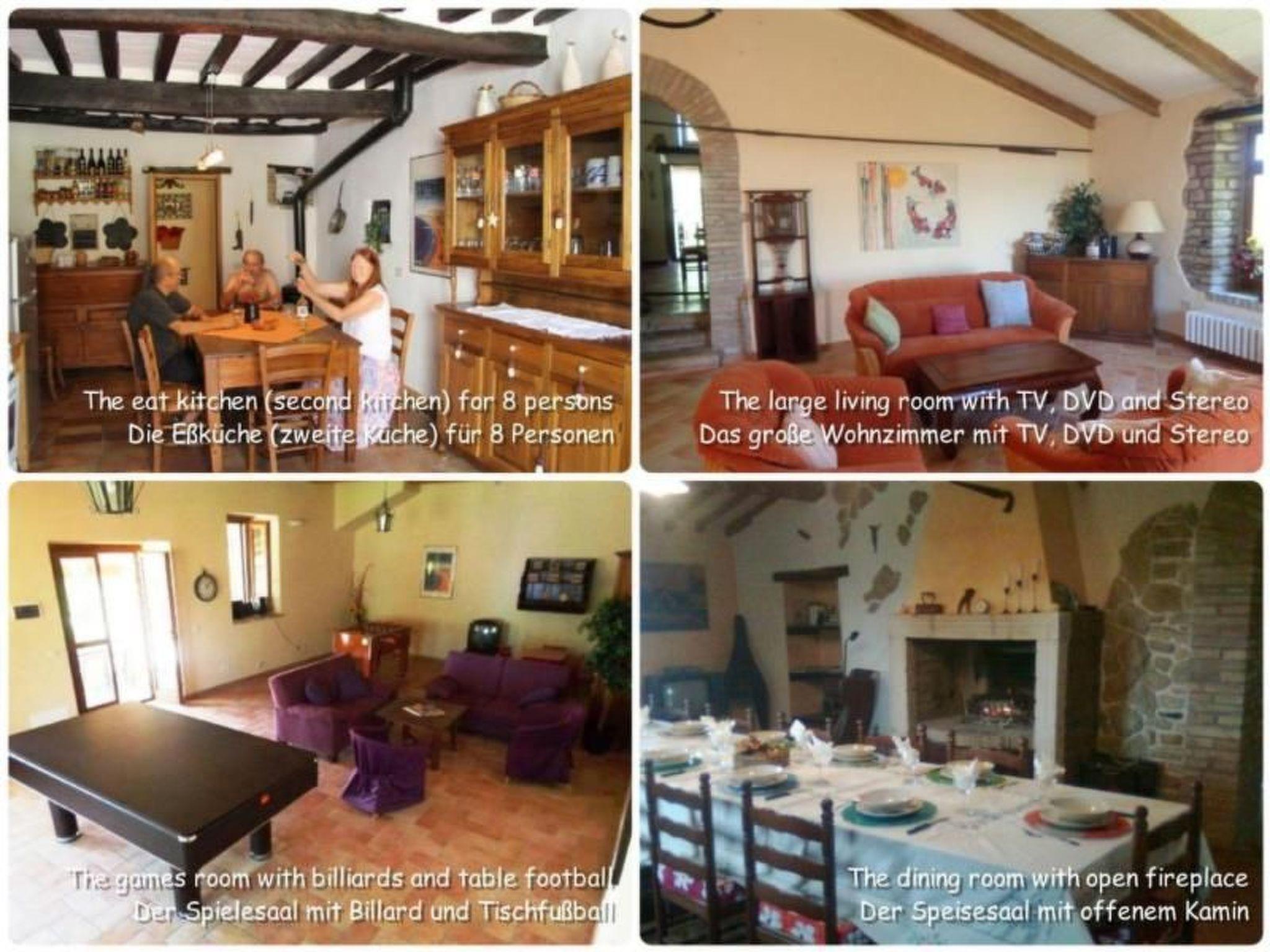 Im Inneren von Ca' Piero, where you will find a welcoming atmosphere that radiates the warmth of the south. The accommodation has cosily furnished double rooms, each with its own bathroom and shower. A small living room with sofa bed, fireplace and pellet stove provides additional comfort and invites you to linger. The two fully equipped kitchens with hob, oven and refrigerators as well as a spacious dining room with an open fireplace, which can seat up to 16 people, invite you to enjoy convivial cooking and dining experiences.