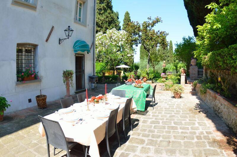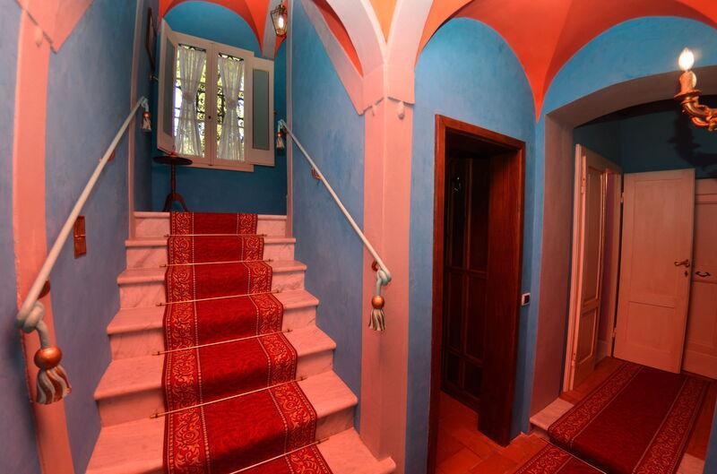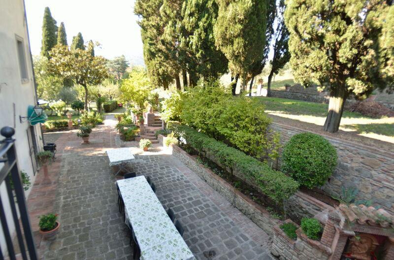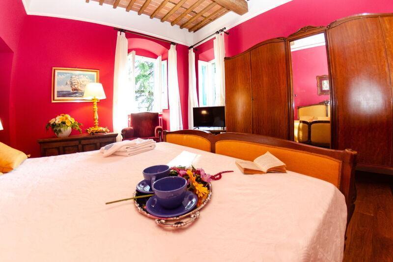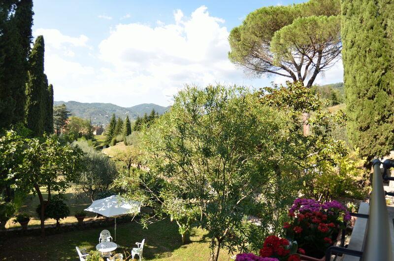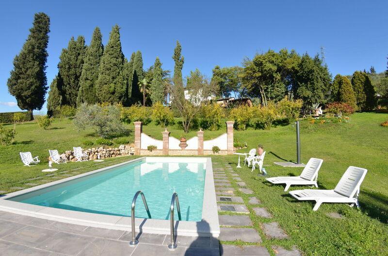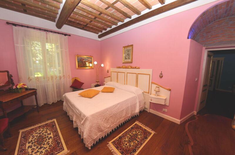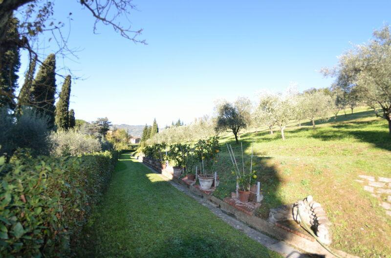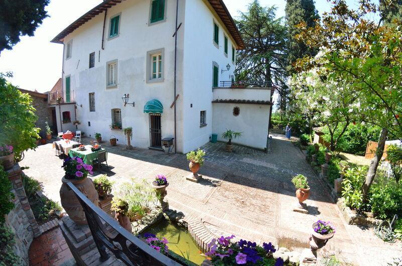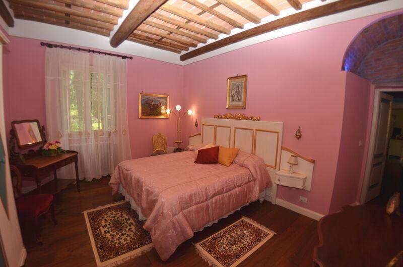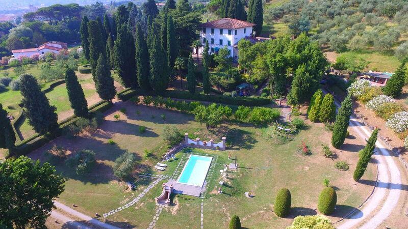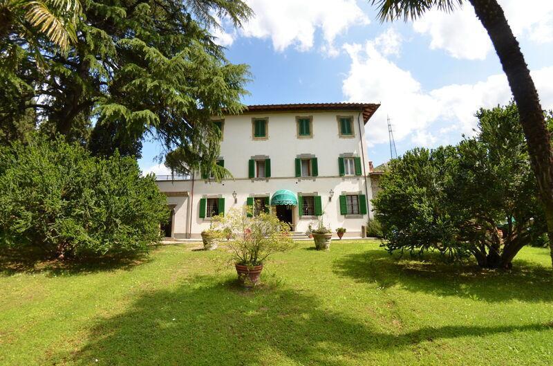 Magnificent villa dated 600, completely renovated with period furniture surrounded by a completely fenced huge garden/property of 50’000 sqm! Wonderful swimming pool at the exclusive use of the guests (8 x 4m, depth: 1.20m)Parking within the property.The owner lives in the dependence, attached to the villa, with independent entrance – he will obviously respect to the full guests’ privacy. The garden and the swimming pool are at the exclusive use of the guests. PETS ALLOWED ON REQUEST.There is a little chapel next to the villa, perfectly restored, ideal to organize a private wedding!Visit the surroundings!The villa is located at the border of the village of Uzzano, 900 m from a grocery and shops, 500m from an excellent restaurant. Guests may reach within an easy reach Montecatini Terme at only 7 km, Monsummano at 13km with its splendid therapeutic springs Grotta Giusti and golf course, at 30 km from Lucca, 60 km from Florence, 45 km from Pisa and the sea. You may have wonderful strolls in the surroundings – discover the little villages of the area: Buggianio, Uzzano Castello, Massa e Cozzile.Visit the surroundings!The villa is located at the border of the village of Uzzano, 900 m from a grocery and shops, 500m from an excellent restaurant. It is possible to recharge electric cars at the nearby supermarkets. Guests may reach within an easy reach Montecatini Terme at only 7 km, Monsummano at 13km with its splendid therapeutic springs Grotta Giusti and golf course, at 30 km from Lucca, 60 km from Florence, 45 km from Pisa and the sea. You may have wonderful strolls in the surroundings – discover the little villages of the area: Buggianio, Uzzano Castello, Massa e Cozzile. Parking within the property.The owner lives in the dependence, attached to the villa, with independent entrance – he will obviously respect to the full guests’ privacy. The garden and the swimming pool are at the exclusive use of the guests. There is a little chapel next to the villa, perfectly restored, ideal to organize a private wedding!Entrance on the ground floor: spacious entrance hall with table, wooden benches, dining room with dining table, fire-place, fully fitted kitchen with induction hob, electric oven, microwave, dishwasher, fridge/freezer, coffee-machine, fire-place, angle with 2 upholstered chairs, SAT-TV, exit onto a patio equipped with table, chairs, barbeque, sun-umbrella, fountain, 1 ante-bathroom with marble basin, 1 bathroom with shower, wc, bidet, basin, locker room.Marble staircase to the 1st floor: spacious, centrally located, living room with table, chairs, upholstered chairs, 2 pouf beds, parquet tiled floor, all 4 bedrooms are connected with this living room. 1 spacious double bedroom with cupboard, chest of drawers, SAT-TV, exit onto a big terrace (40 sqm) with swing and stunning views onto the hills, 1 bedroom with 1 double bed with cupboard, SAT-TV, terracotta tiled floors, fresco – it is said that Napoleon Bonaparte slept in this bedroom, 1 double bedroom with cupboard, SAT-TV and 1 double bedroom with exit onto a terrace (12 sqm), cupboard, SAT-TV – connecting door from this bedroom to the French sized bedroom, 1 big and beautiful bathroom with green marble, tub, separate shower, basin, wc, bidet. Stairs to the 2nd floor: 1 big bathroom with tub/shower, washing machine, wc, bidet and basin. All bathrooms dispose of a hair-dryeer.The villa is furnished with great care, cheerful painted walls (pink, light blue, green and red), beamed ceilings, terracotta tiled floors, period furniture, luxury tapestry, air-conditioning in all bedrooms, wifi included.It is not permitted to charge electric cars by using the electricity provided by the Villa.Pool opened from beginning of May until end of September, for the exact dates please contact us.