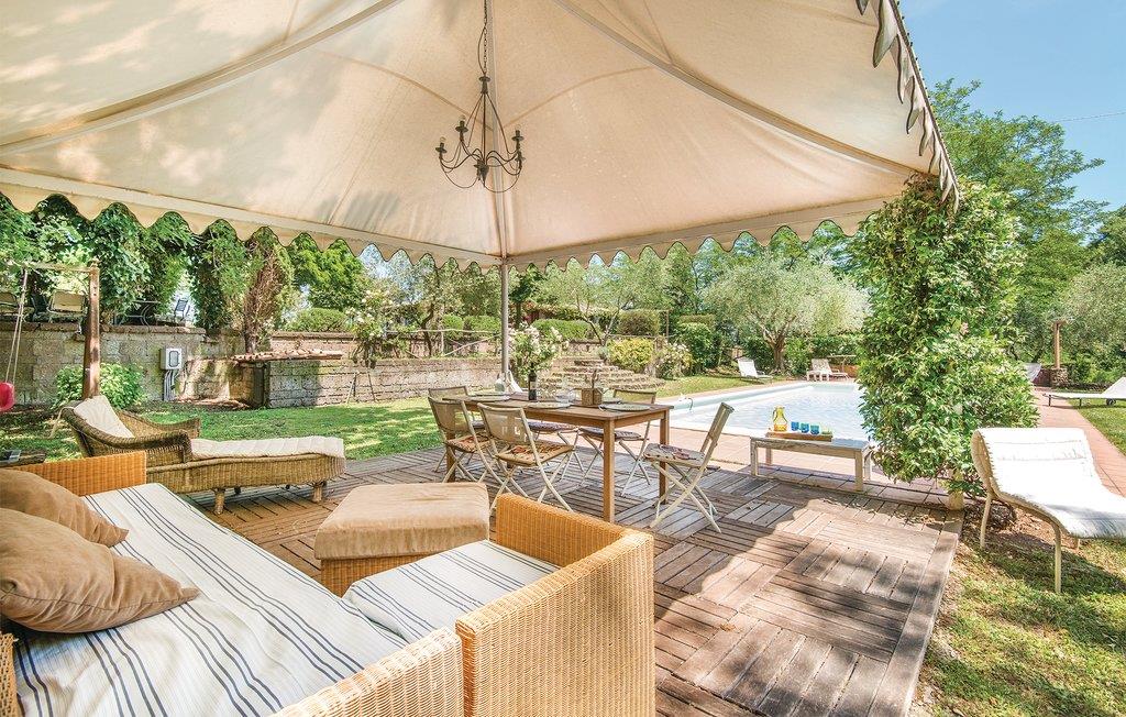 Dette karakteristiske og hyggelige landsted var engang en religiøs bolig for jesuitter, nu gennemrenoveret og oplagt til dejlig ferie. Feriehuset ligger omgivet af frodigt grønt, højt over en dal, hvor I kan nyde roen og Tusciaregionens skønne landskaber. En veranda med en regnbue af blomster er oplagt til alle dagens måltider, mens whirlpoolen foran villaen indbyder til afslappende selvforkælelse. Desuden er der en swimmingpool i en pavillon i haven, som er på 3000 m², med god plads til både leg og afslapning. Hunde er velkomne, læg dog mærke til at ejendommen ikke er indhegnet. Den sidste km tilkørsel er grusvej, der ikke er egnet til sportsvogne og busser. Vitorchiano 3 km, Viterbo 7 km med 'Terme dei Papiø 7 km, Tuscania 22 km og de etruskiske byer Tarquinia og Cerveteri 48 km. 22 km til Bolsenasøen, Vico og Bracciano.