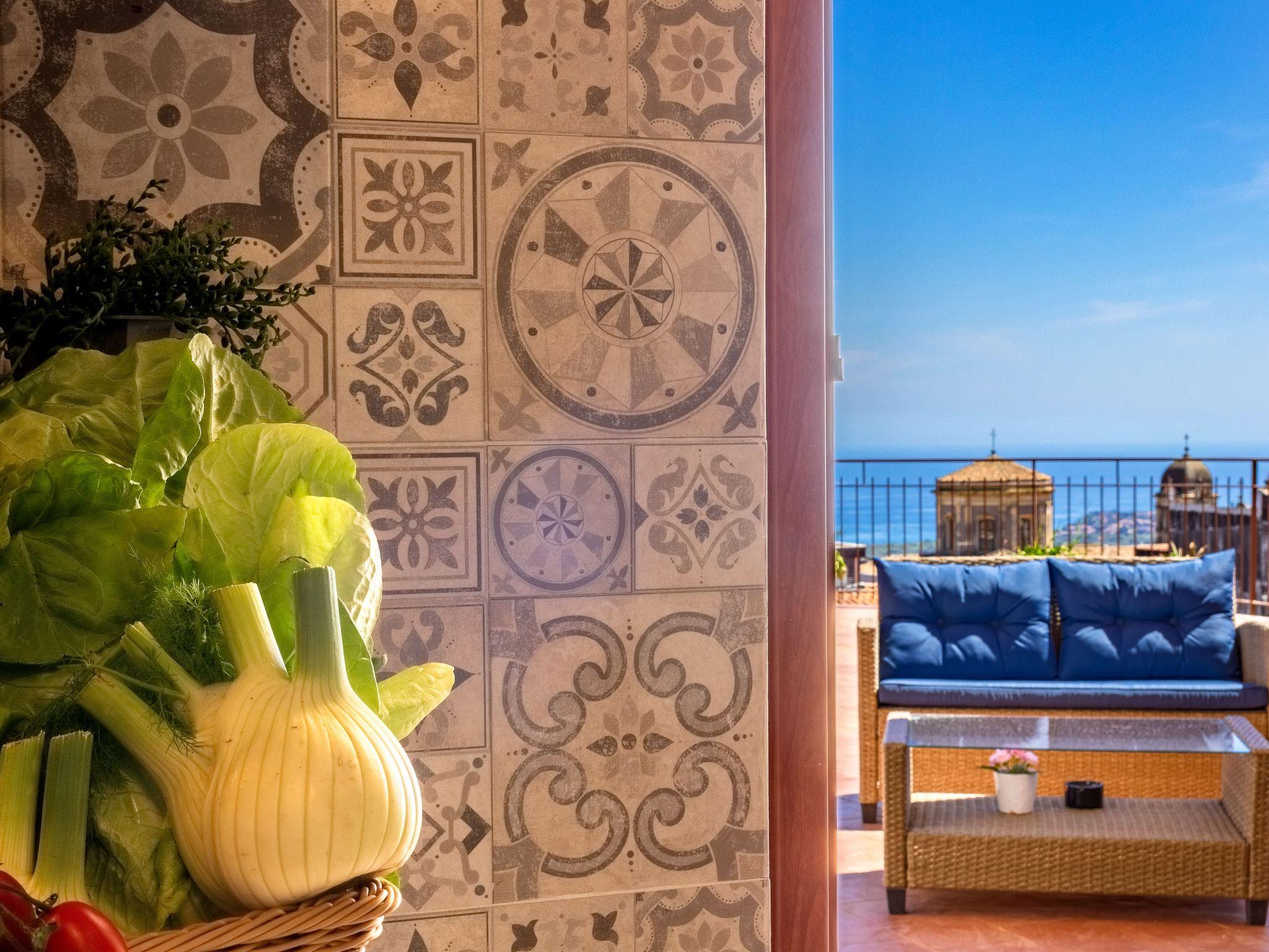 The exterior of the apartment boasts a spectacular roof terrace for exclusive use, where guests can relax and absorb the beauty of the surrounding landscape. This outdoor area, complemented by an additional terrace and balcony, provides the perfect backdrop for al fresco dining or simply enjoying moments of relaxation while admiring the panorama that embraces the sea and mountains. The view from the flat provides unique thrills, especially the view of the summit of Mount Etna from the side balcony.