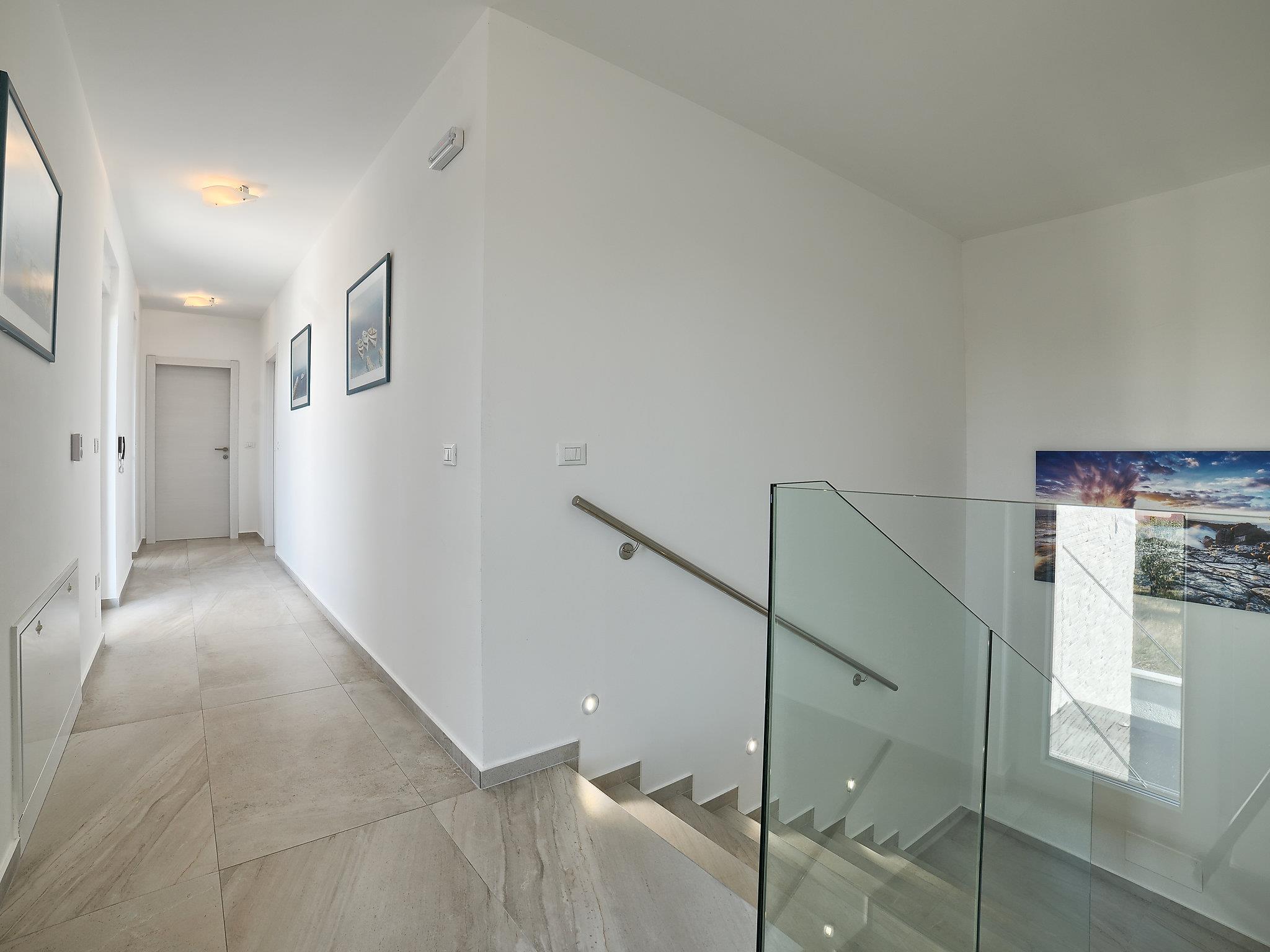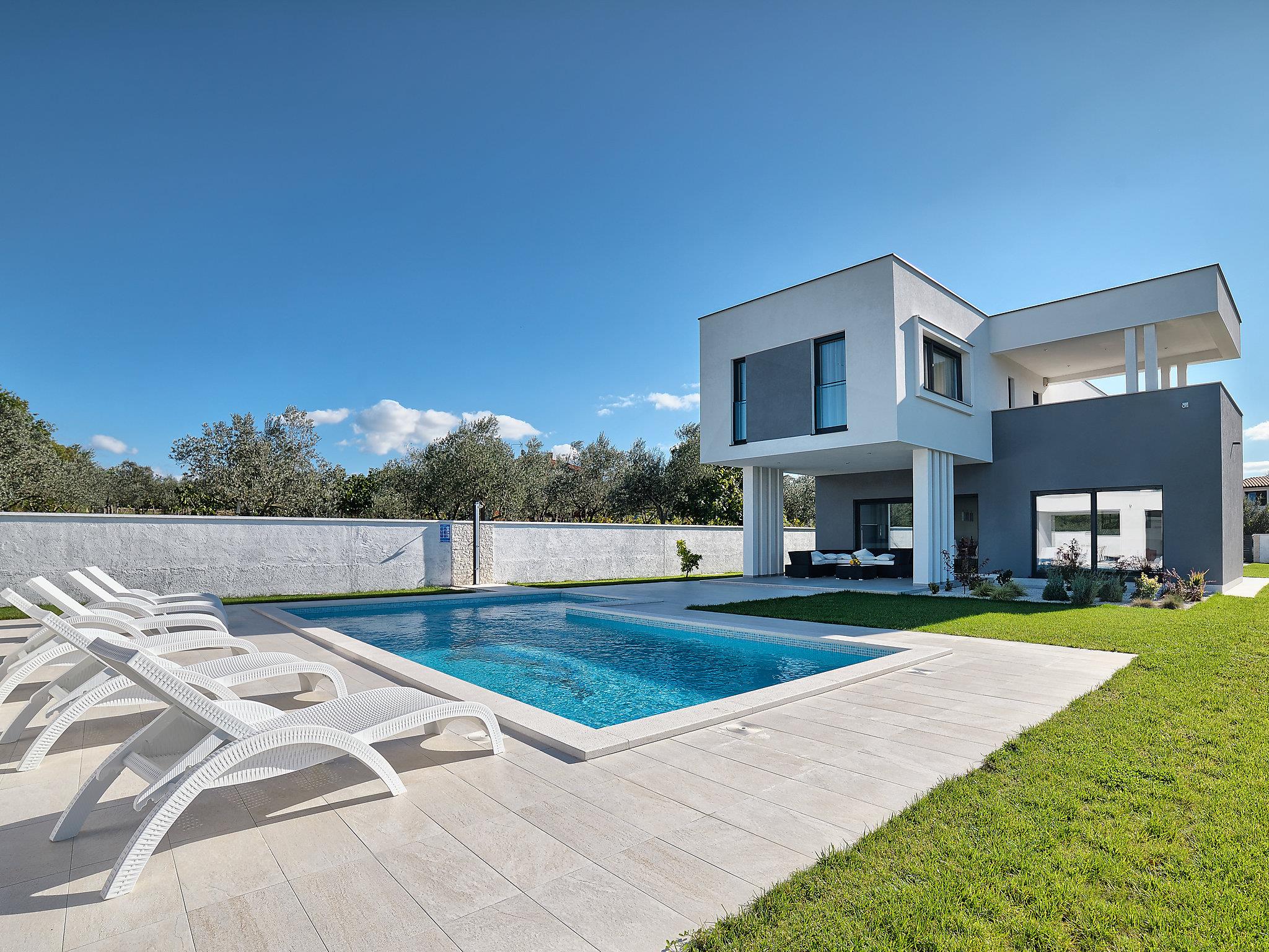 Štinjan 5 km from Pula: Modern, beautiful villa "Lungera", 2 storeys. 3 km from the centre of Fažana, in a sunny position, 1 km from the sea, 1 km from the beach. Private: property 1'250 m2 (fenced), garden with lawn and wildlife garden, swimming pool angular, heated (43 m2, depth 135 cm, seasonal availability: 09.Mar. - 21.Nov.) with internal staircase and salt-electrolysis pool-cleaning system. Outdoor shower, pool house with fridge and cooking stove, terrace, garden furniture, barbecue. In the house: internet access, washing machine. Parking at the house on the premises. Shop 200 m, restaurant 500 m, bus stop 220 m, pebble beach 1 km, rocky beach 1 km. Golf course (18 hole) 5 km, sailing school 2 km, tennis 1 km, riding stable 3 km, walking paths from the house 500 m, cycle lane 100 m. Please note: airfield 15 km from the property. Swimming pool heated (extra). By groups of young people double deposit is requested on arrival. No pets allowed.