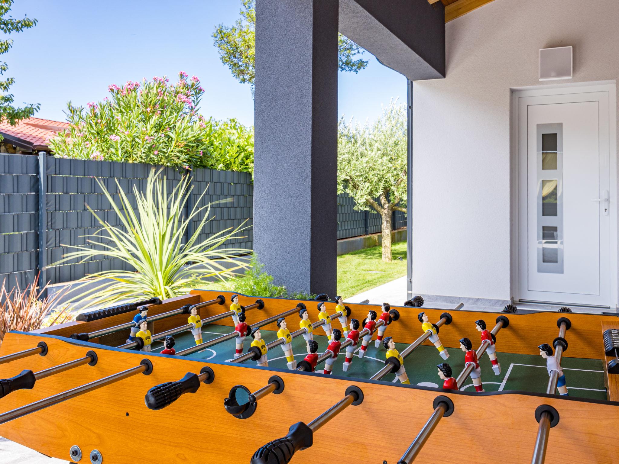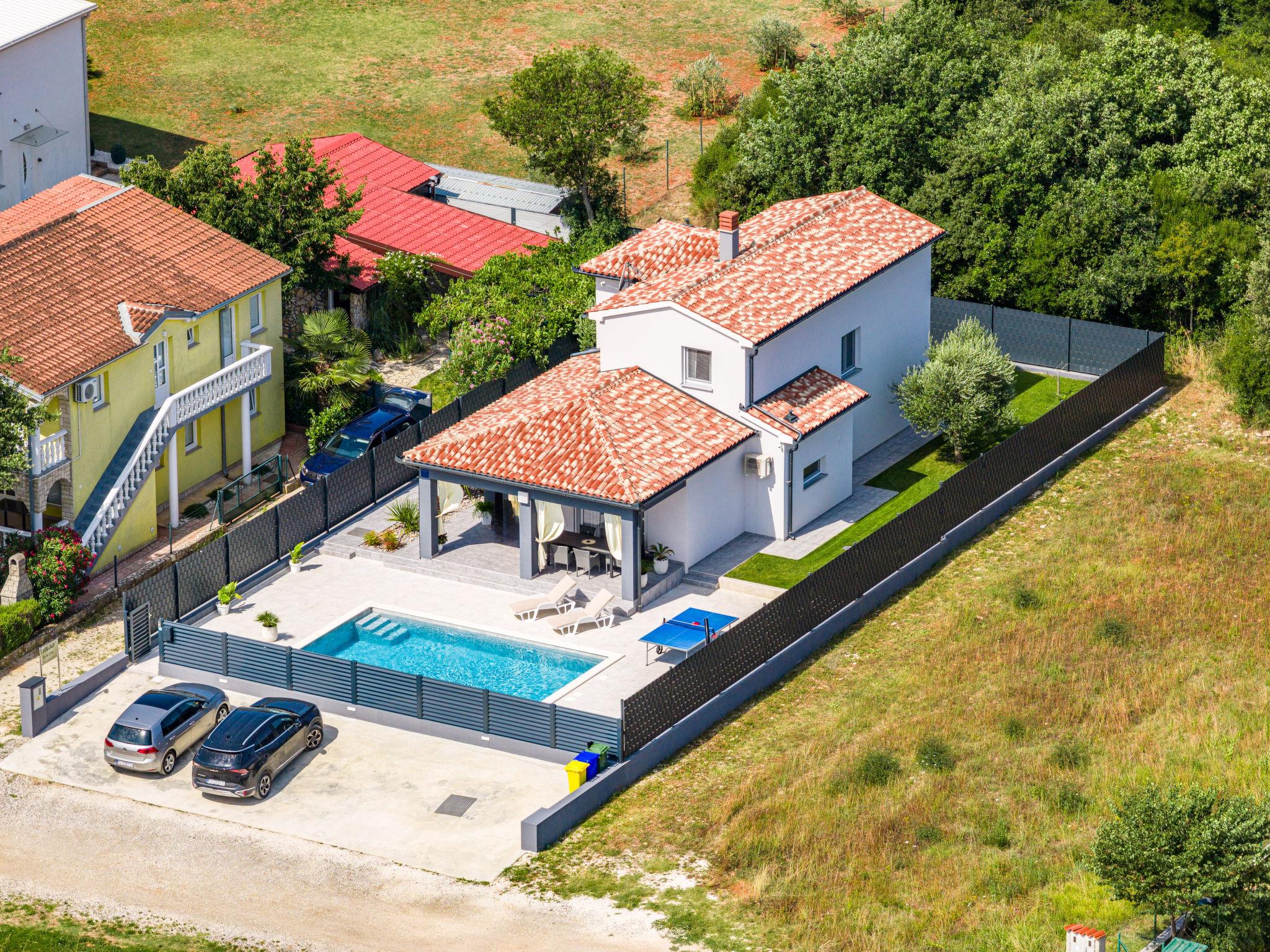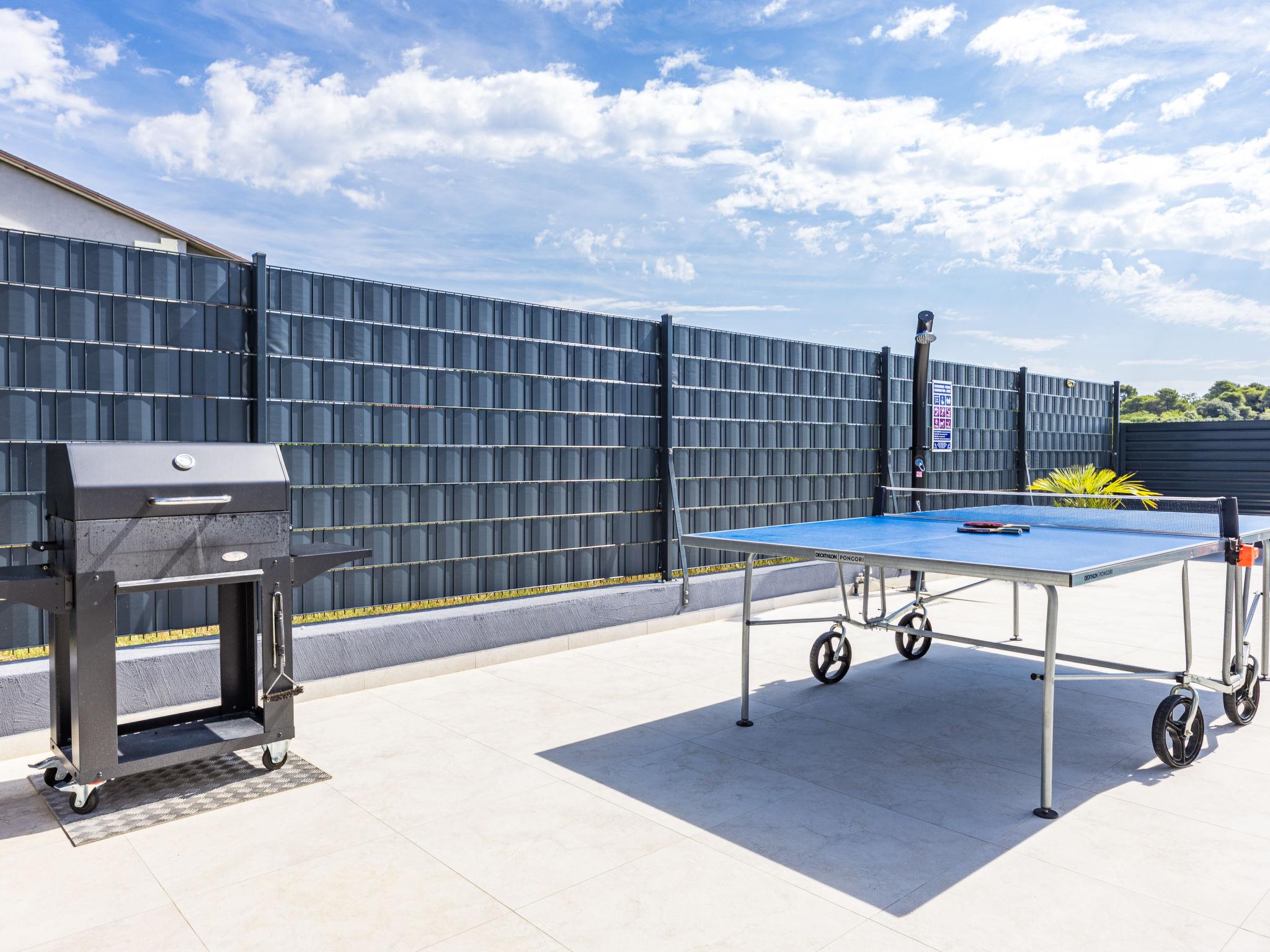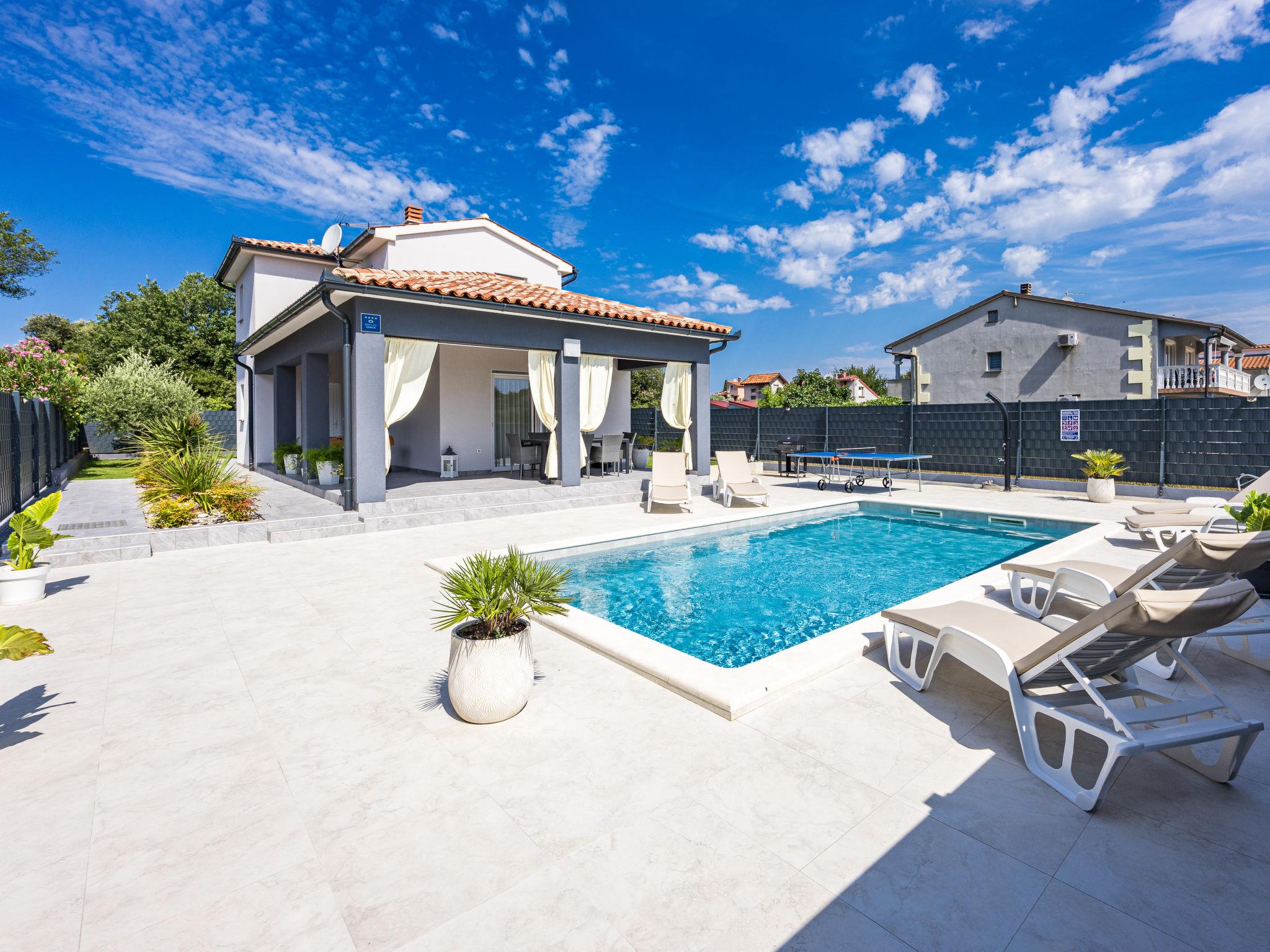 Štinjan 5 km from Pula: Modern, beautiful villa "S&V", 2 storeys, built in 2023. 3 km from the centre of Fažana, in a sunny position, 1.5 km from the sea, 1.5 km from the beach. Private: property 500 m2 (fenced), garden, swimming pool angular (32 m2, depth 140 cm, seasonal availability: 01.May. - 01.Oct.) with internal staircase and salt-electrolysis pool-cleaning system. Outdoor shower, table tennis. In the house: internet access, table football, washing machine, tumble dryer. Parking (for 3 cars) at the house on the premises. Shop 300 m, supermarket 2 km, restaurant, bus stop 700 m, pebble beach 1.5 km, rocky beach 1.5 km. Golf course (18 hole) 5 km, sailing school 5 km, tennis 500 m, riding stable 4 km, walking paths from the house 700 m, cycle lane 500 m. The owner does not accept any youth groups.