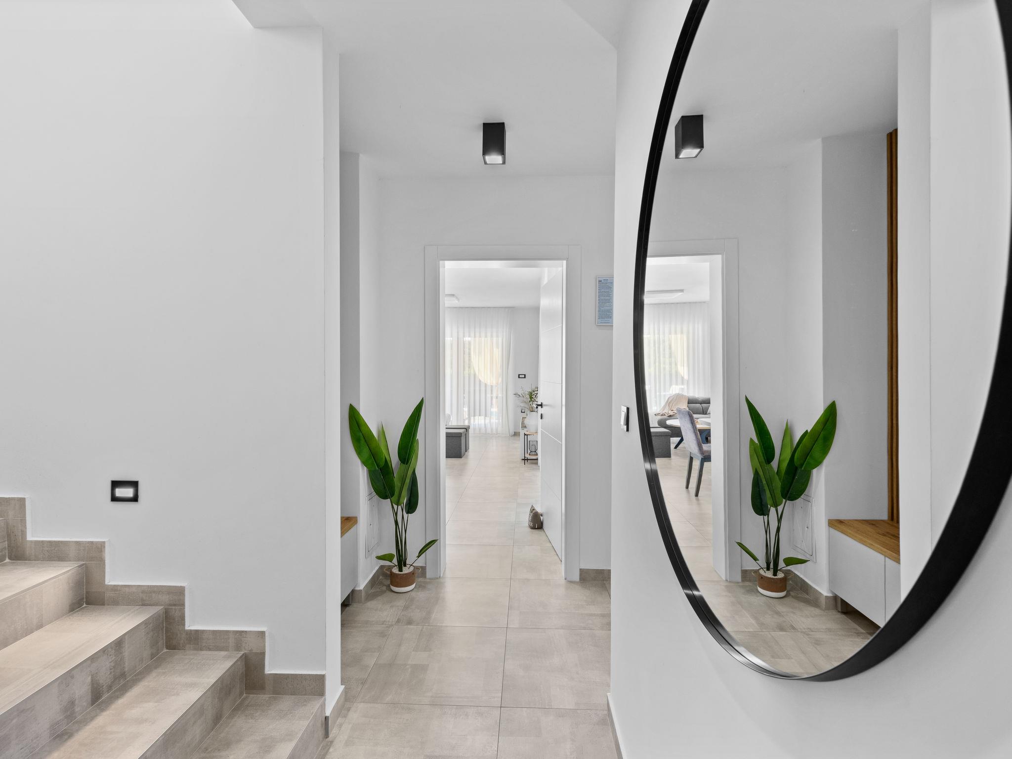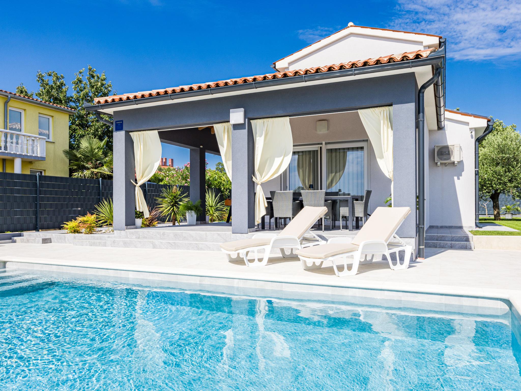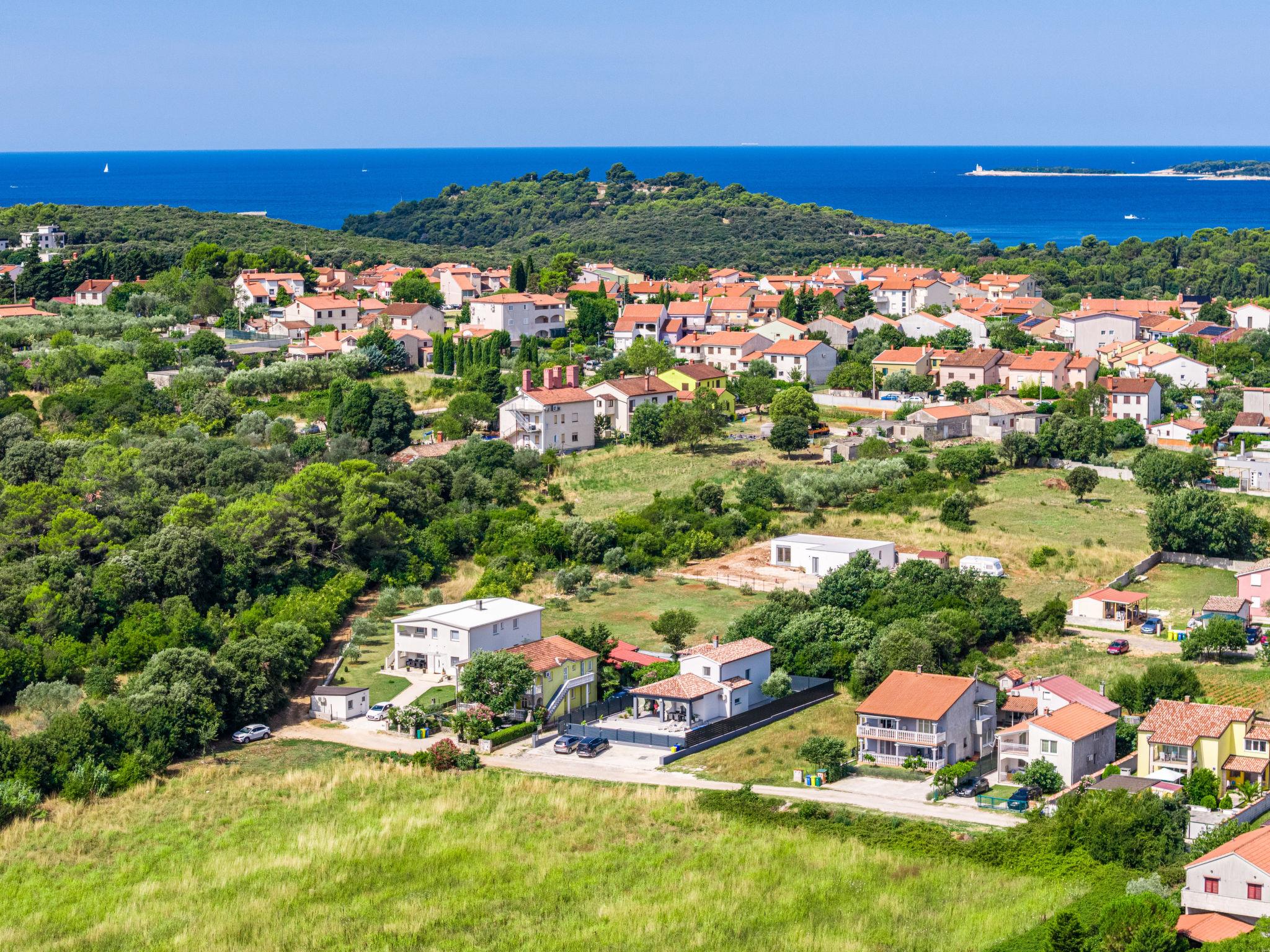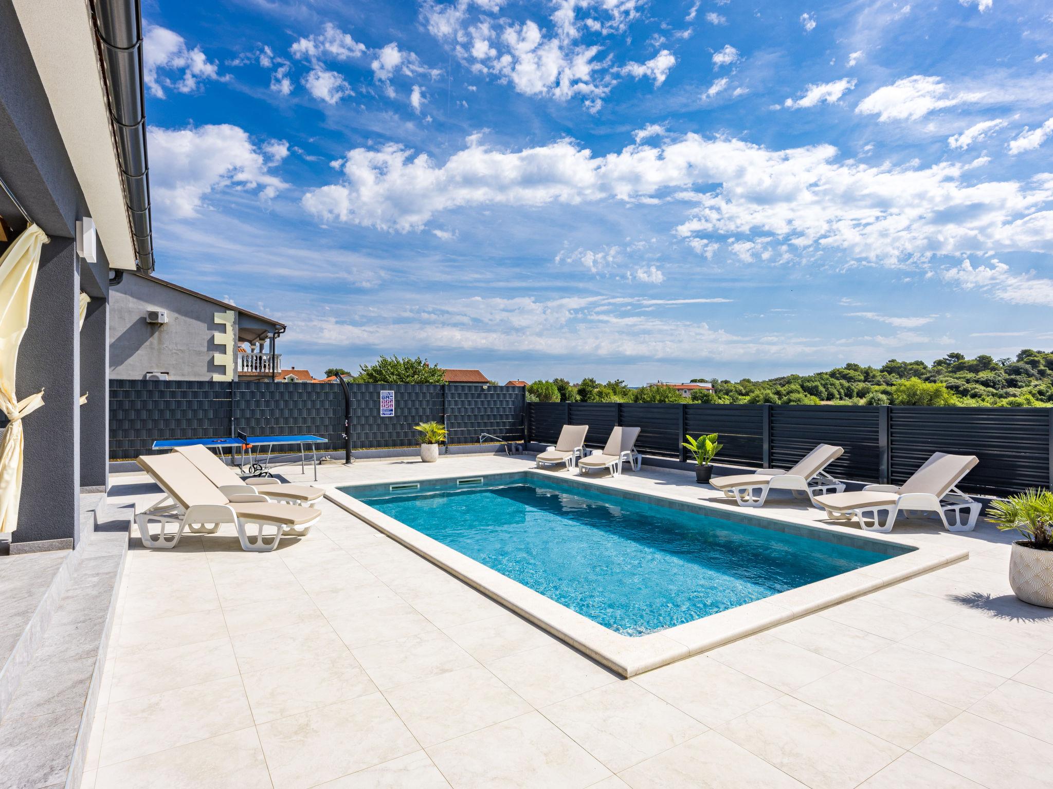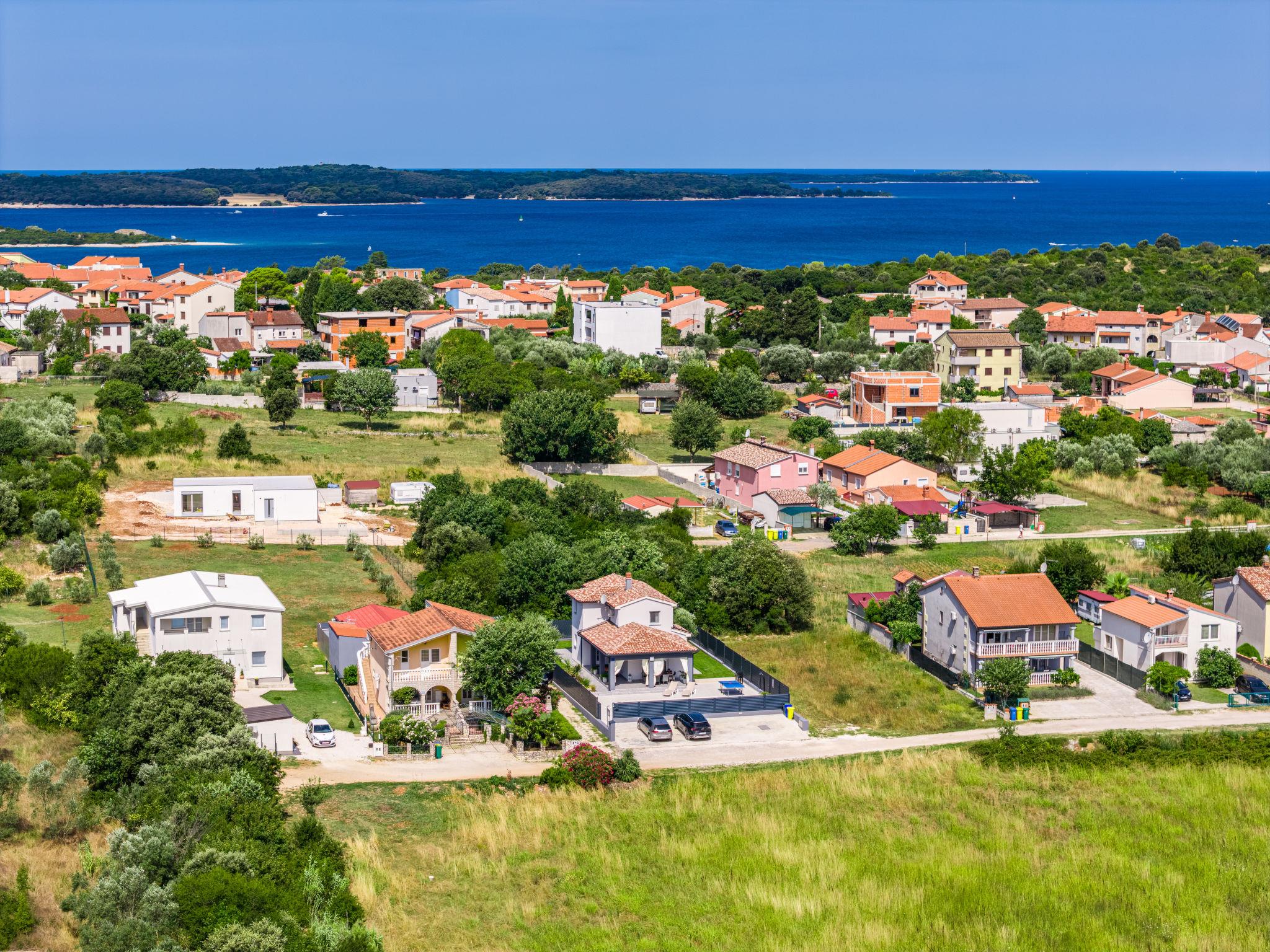 Štinjan 5 km from Pula: Modern, beautiful villa "S&V", 2 storeys, built in 2023. 3 km from the centre of Fažana, in a sunny position, 1.5 km from the sea, 1.5 km from the beach. Private: property 500 m2 (fenced), garden, swimming pool angular (32 m2, depth 140 cm, seasonal availability: 01.May. - 01.Oct.) with internal staircase and salt-electrolysis pool-cleaning system. Outdoor shower, table tennis. In the house: internet access, table football, washing machine, tumble dryer. Parking (for 3 cars) at the house on the premises. Shop 300 m, supermarket 2 km, restaurant, bus stop 700 m, pebble beach 1.5 km, rocky beach 1.5 km. Golf course (18 hole) 5 km, sailing school 5 km, tennis 500 m, riding stable 4 km, walking paths from the house 700 m, cycle lane 500 m. The owner does not accept any youth groups.