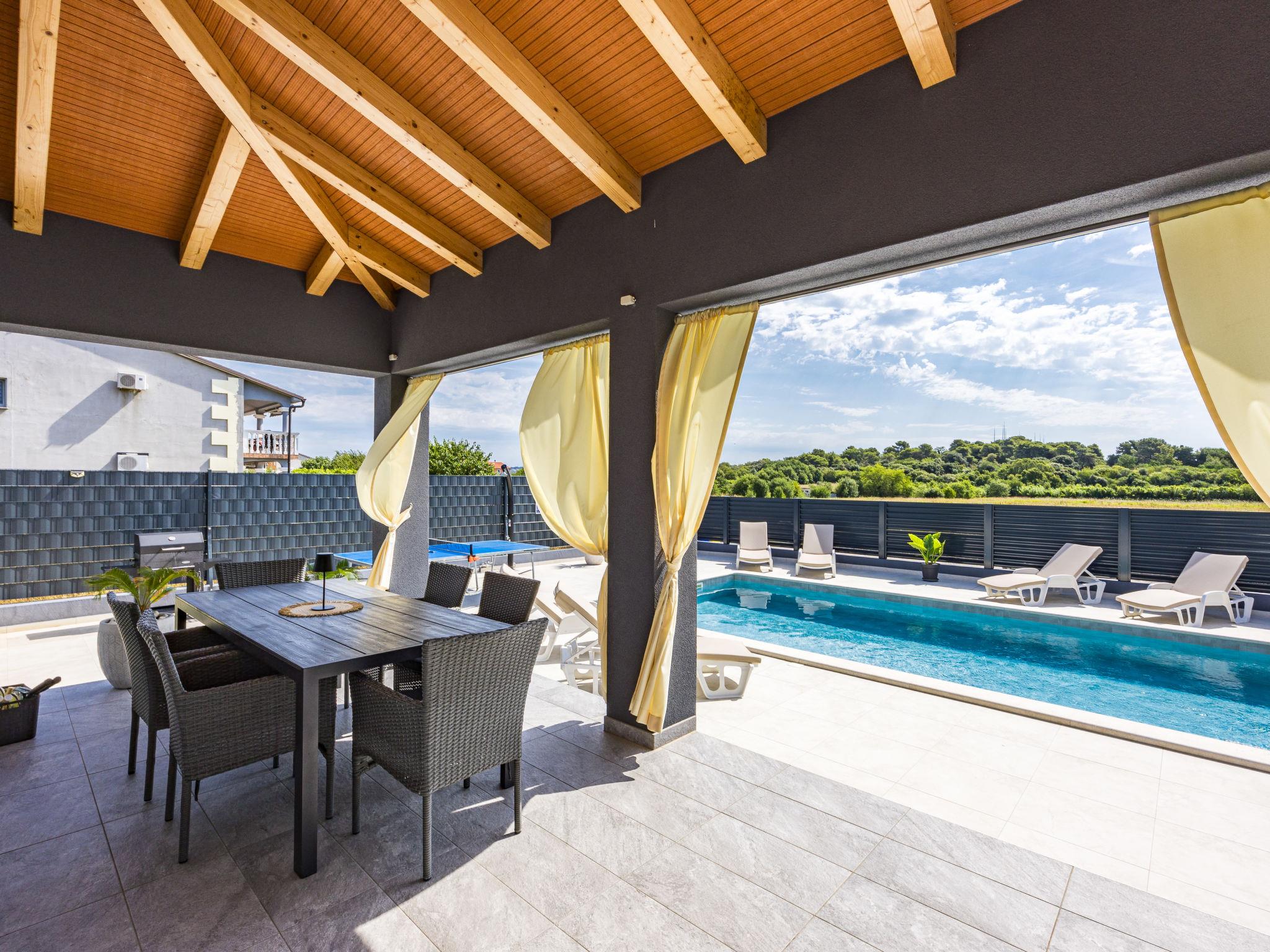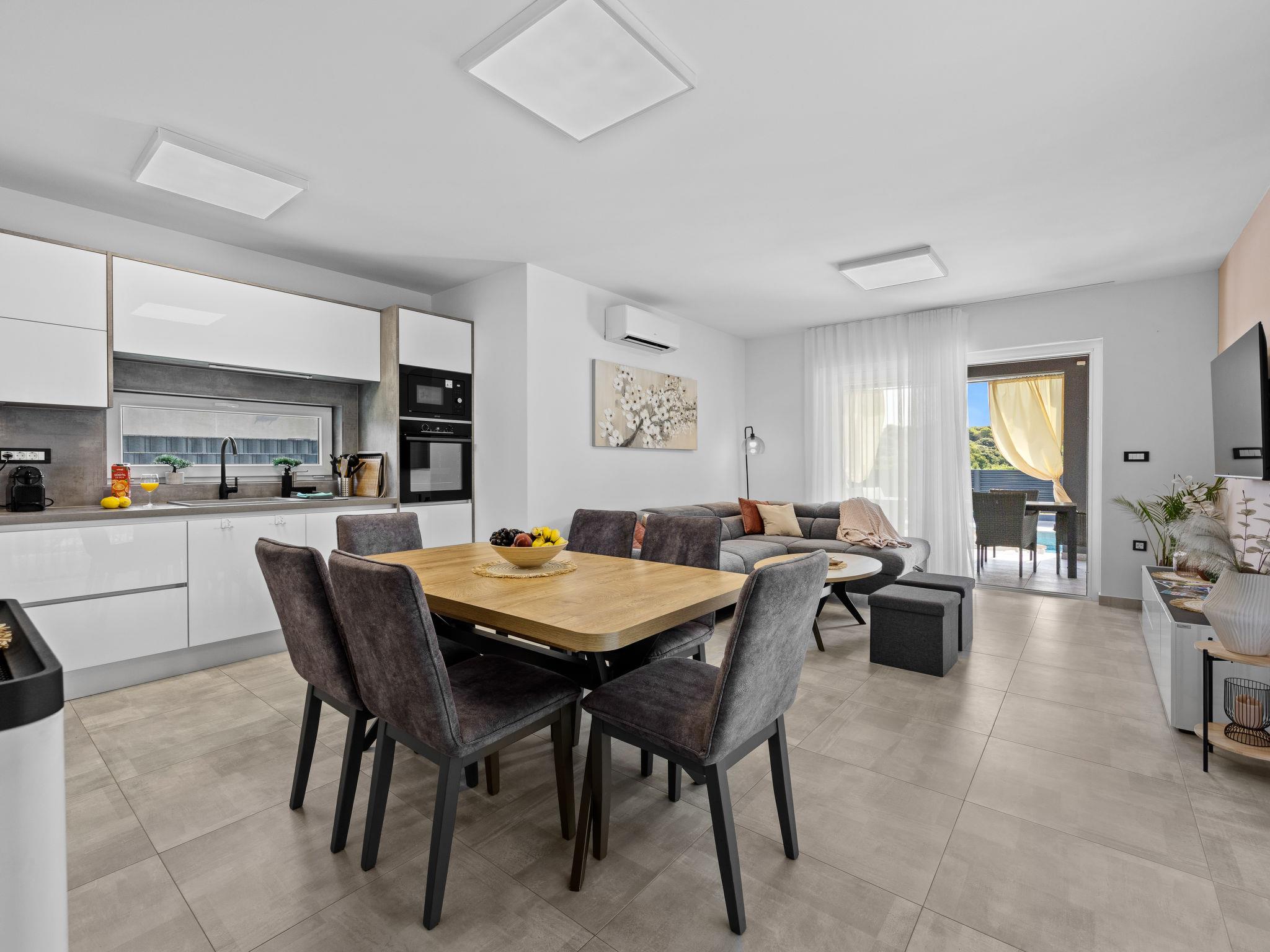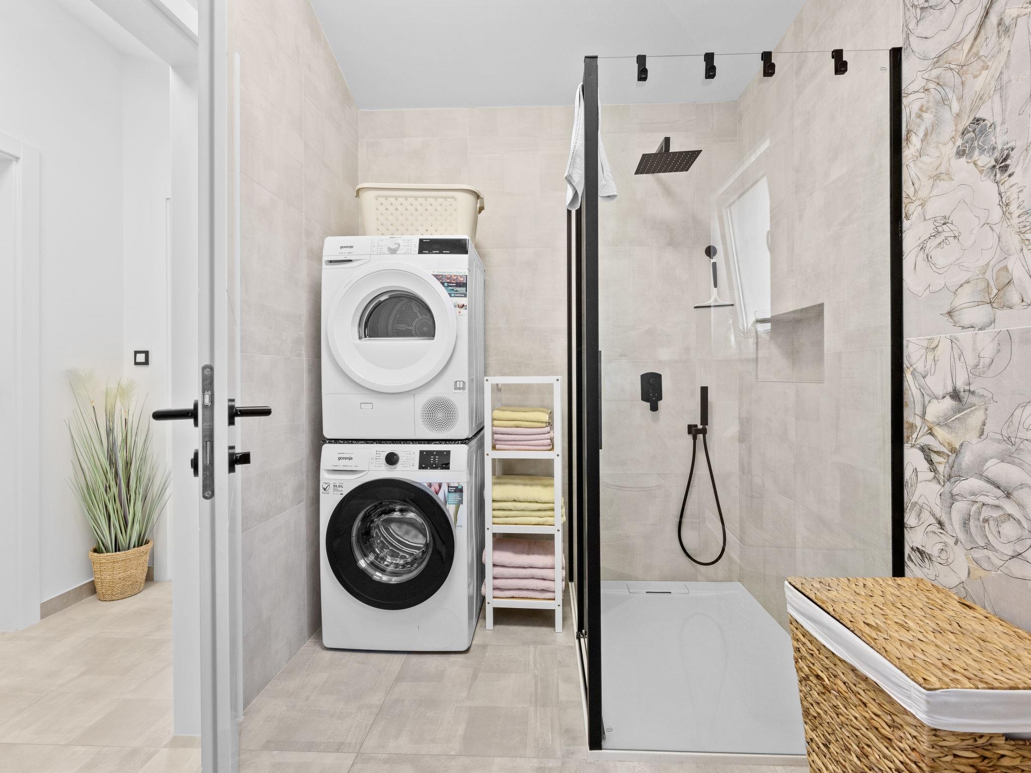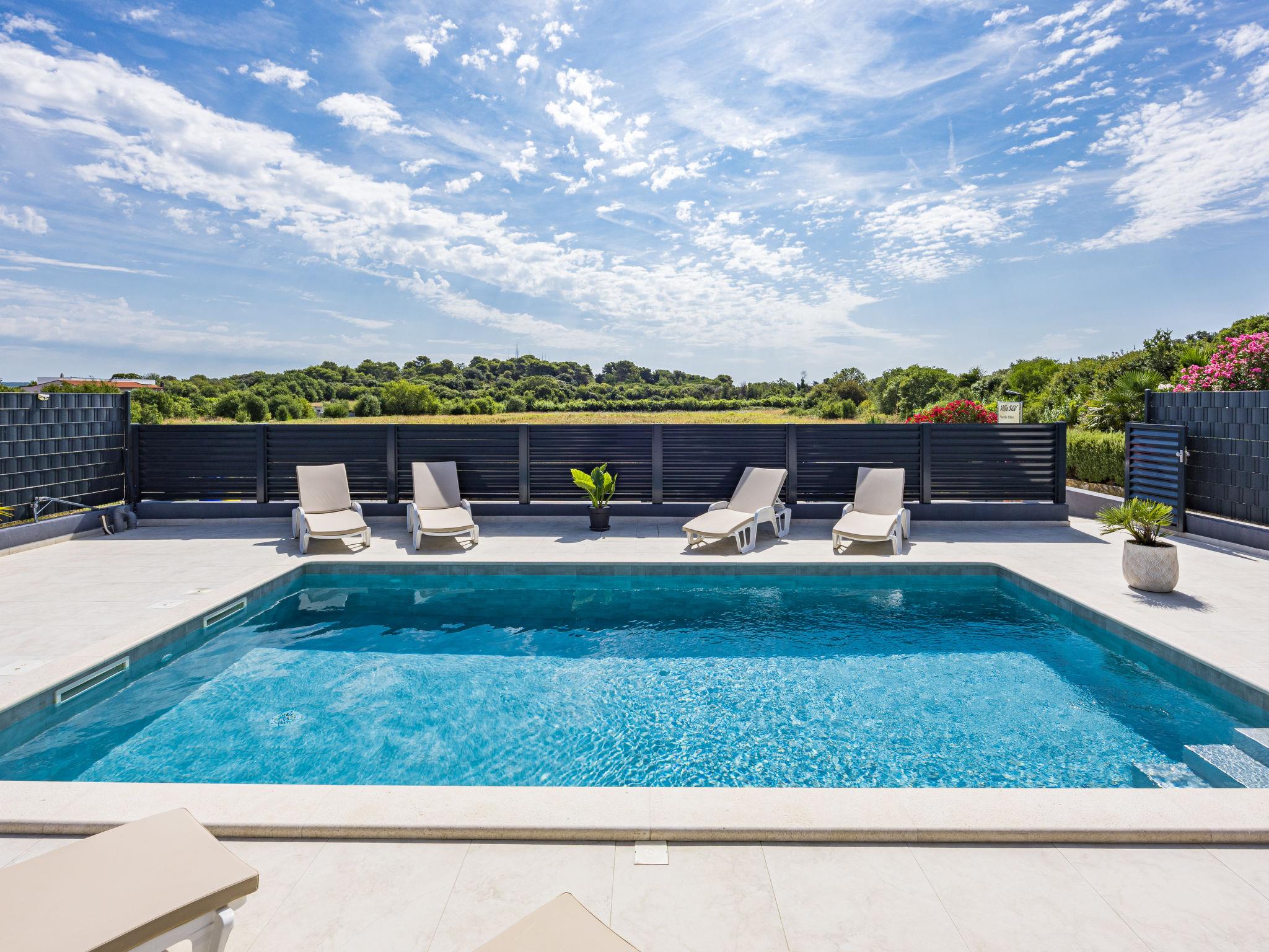 Štinjan 5 km from Pula: Modern, beautiful villa "S&V", 2 storeys, built in 2023. 3 km from the centre of Fažana, in a sunny position, 1.5 km from the sea, 1.5 km from the beach. Private: property 500 m2 (fenced), garden, swimming pool angular (32 m2, depth 140 cm, seasonal availability: 01.May. - 01.Oct.) with internal staircase and salt-electrolysis pool-cleaning system. Outdoor shower, table tennis. In the house: internet access, table football, washing machine, tumble dryer. Parking (for 3 cars) at the house on the premises. Shop 300 m, supermarket 2 km, restaurant, bus stop 700 m, pebble beach 1.5 km, rocky beach 1.5 km. Golf course (18 hole) 5 km, sailing school 5 km, tennis 500 m, riding stable 4 km, walking paths from the house 700 m, cycle lane 500 m. The owner does not accept any youth groups.
