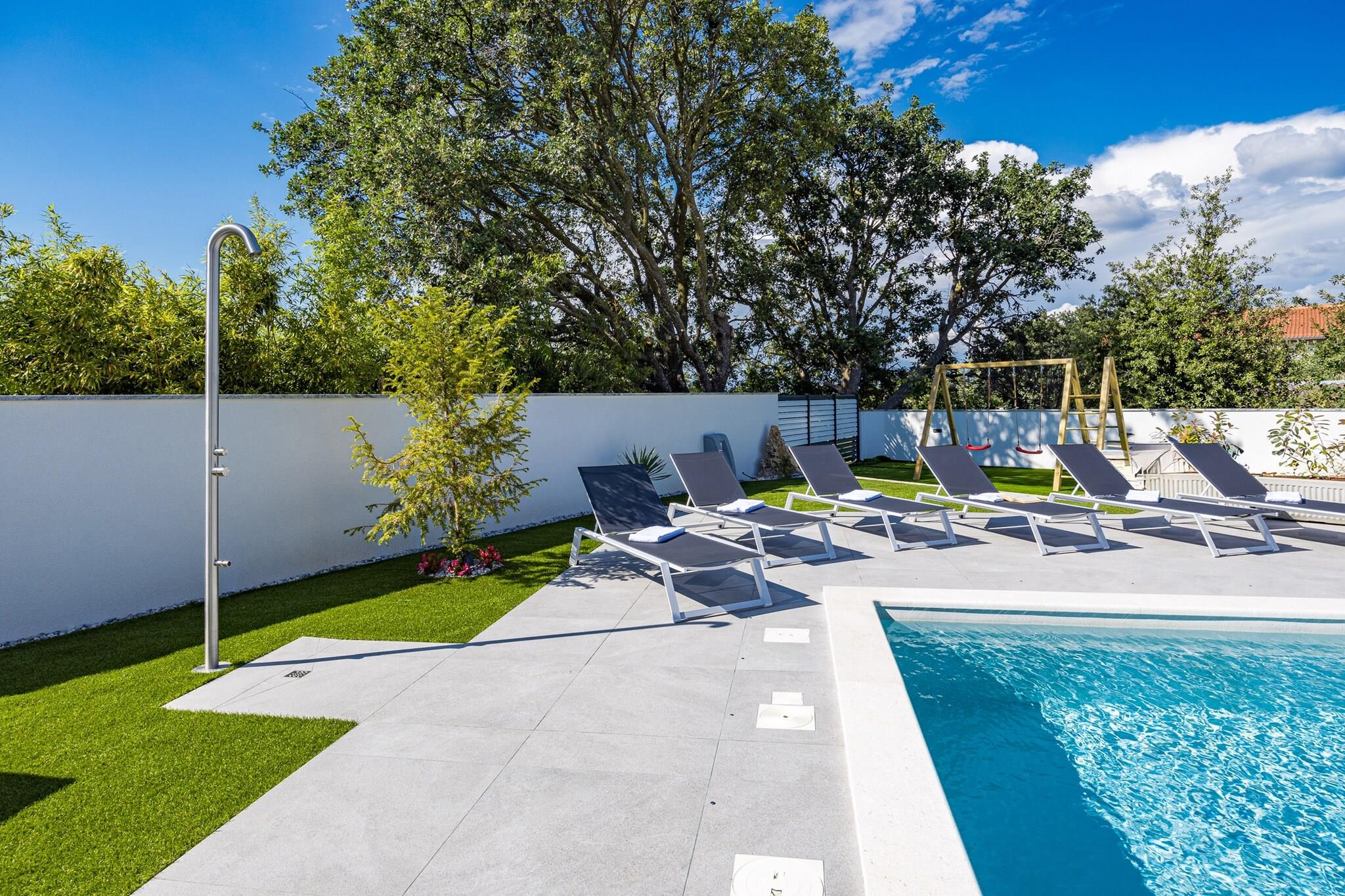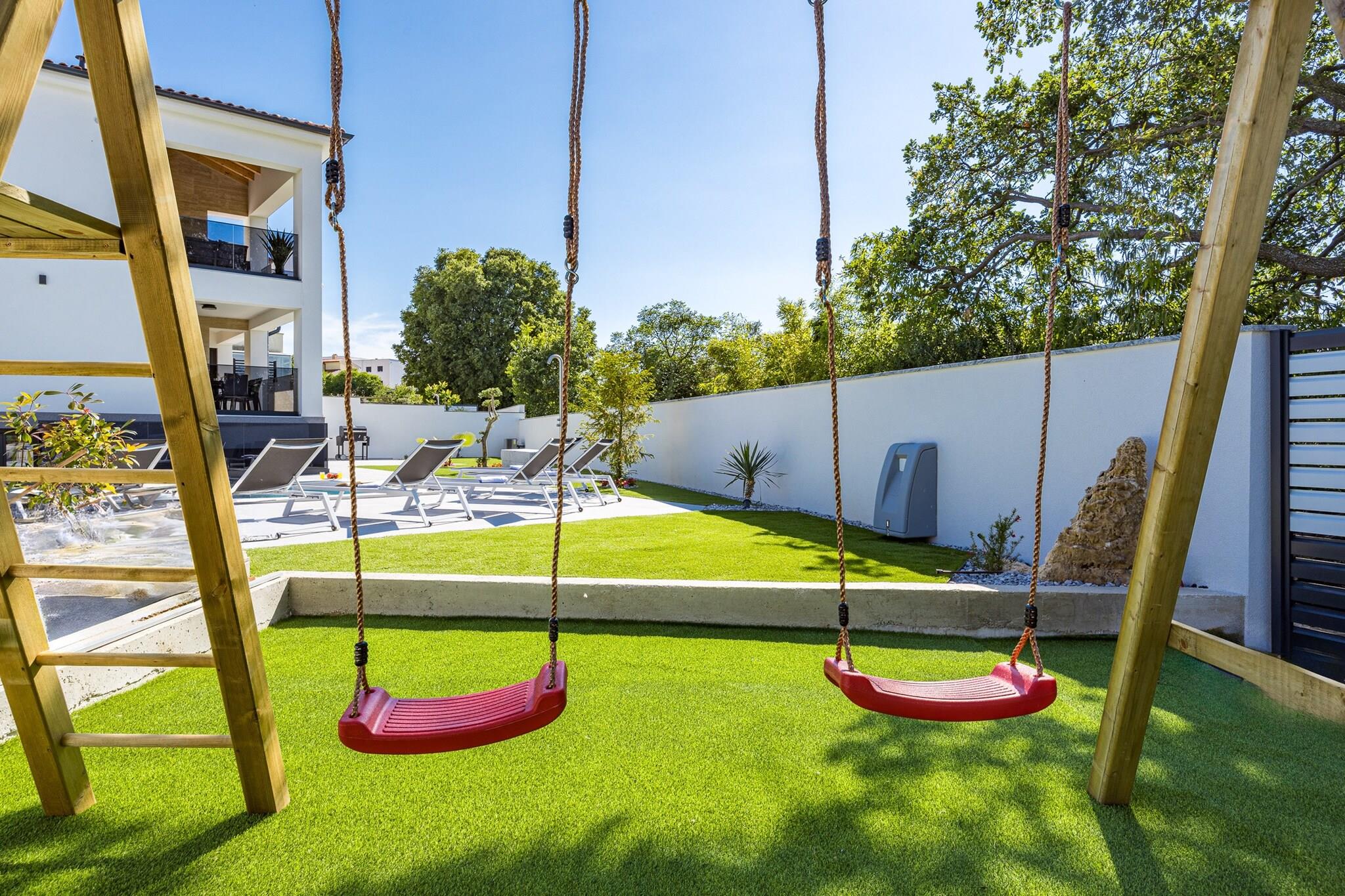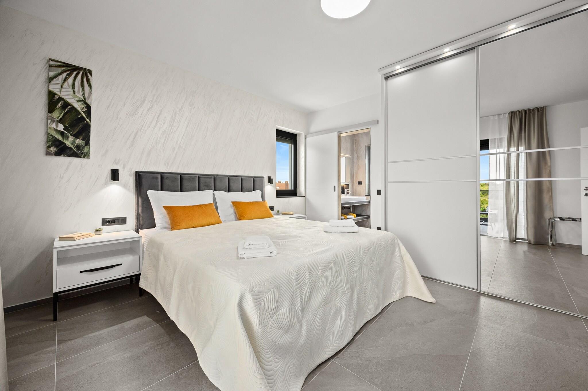 Dette nybyggede, luksuriøse feriehus er designet til at tilbyde et afslappende og behageligt ophold. Det har tre rummelige soveværelser, hver indrettet med en kingsize seng, og kan rumme op til seks gæster. Ejendommen er kæledyrsvenlig, så du kan tage dine lodne ledsagere med. Stuen er udstyret med en sofa og et fladskærms-tv, hvilket giver et hyggeligt sted at slappe af. Gæsterne kan nyde den smukke have, komplet med en privat swimmingpool med massagedyser, perfekt til afslapning. Ejendommen tilbyder også en legeplads med gynger og et klatrestativ, der sikrer underholdning for yngre besøgende. Yderligere faciliteter omfatter aircondition og internetadgang. Feriehuset ligger i Štinjan, en fredelig forstad til Pula, med nem adgang til nærliggende attraktioner. Inden for gåafstand finder du den dejlige Hidrobaza-strand, kendt for sin fantastiske udsigt over Brijuni-øerne og ideel til en stranddag med forskellige spisesteder og volleyballbaner. Strandpromenaden fører til Valbandon og Fažana, og besøgende kan nyde charmerende caféer og lokale butikker undervejs. Nærheden til Pula giver mulighed for at udforske antikke romerske steder såsom amfiteatret, Sergius' triumfbue og Augustus-templet. Villaen har et fuldt udstyret køkken, så gæsterne nemt kan tilberede måltider. Det inkluderer vigtige apparater såsom komfur, ovn og køleskab. En smuk spiseplads åbner op til terrassen, hvor du kan spise, mens du nyder den friske havbrise.