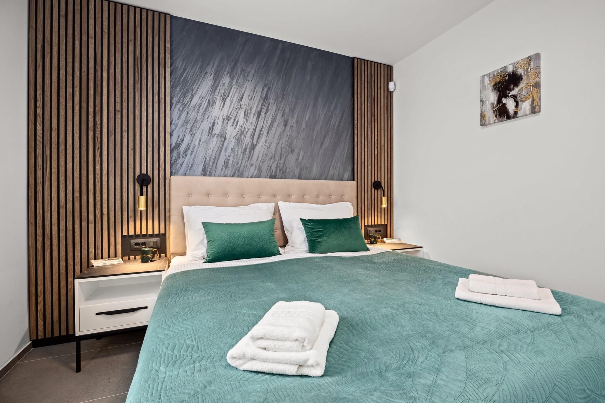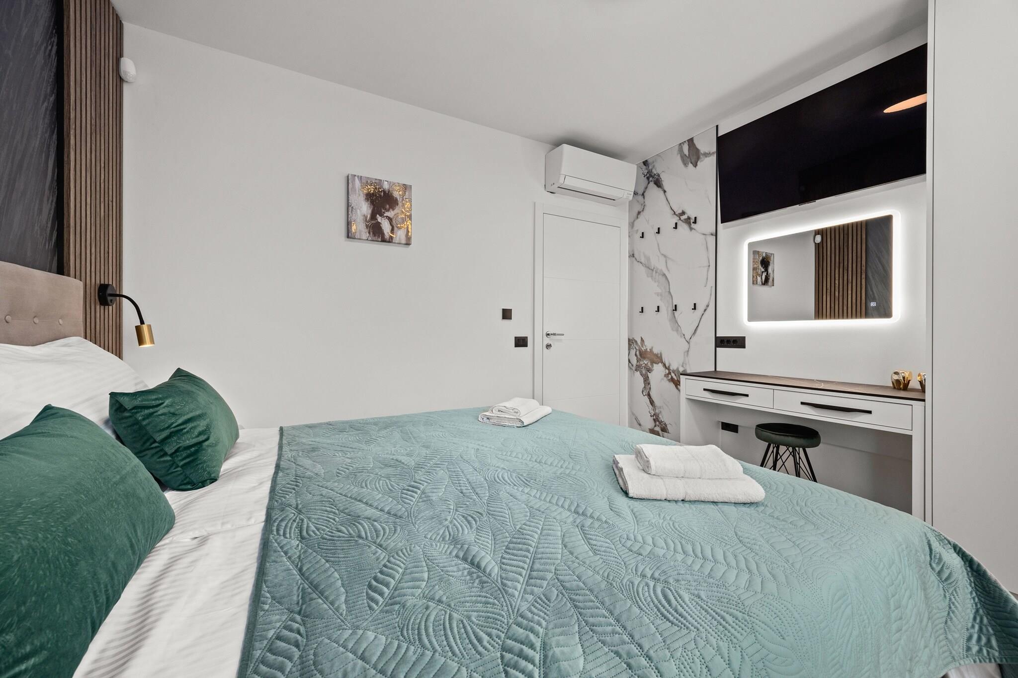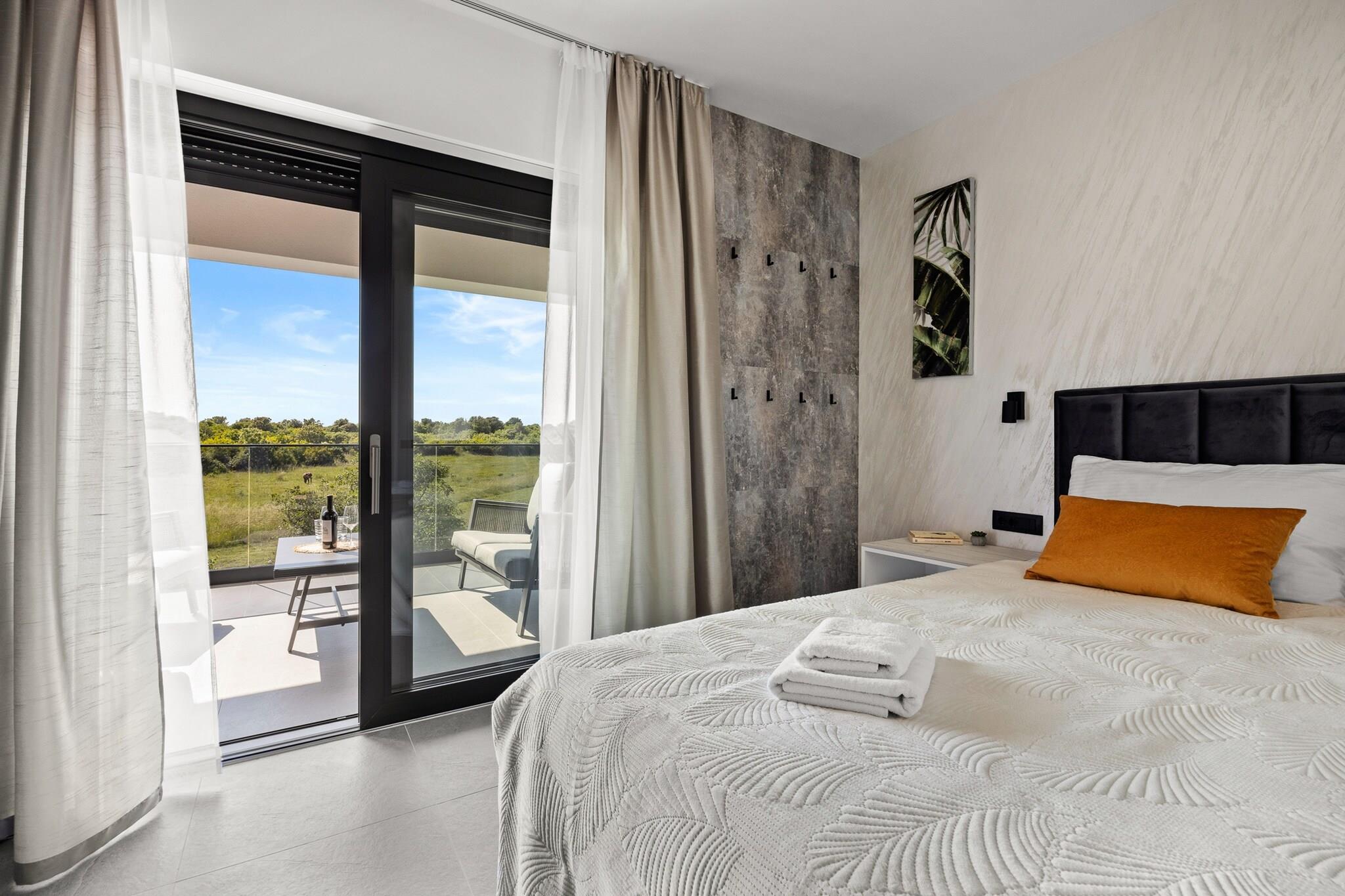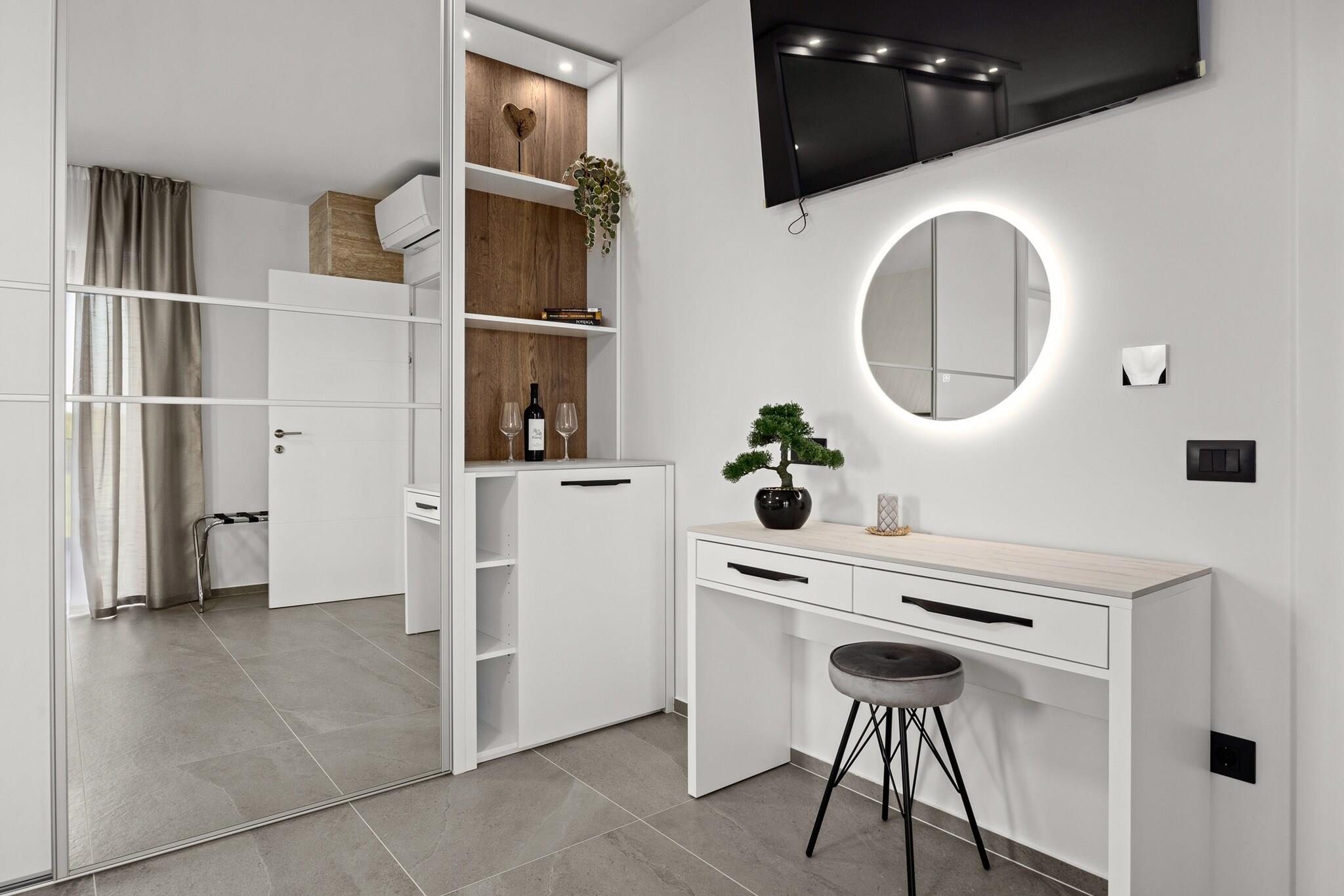 Dette nybyggede, luksuriøse feriehus er designet til at tilbyde et afslappende og behageligt ophold. Det har tre rummelige soveværelser, hver indrettet med en kingsize seng, og kan rumme op til seks gæster. Ejendommen er kæledyrsvenlig, så du kan tage dine lodne ledsagere med. Stuen er udstyret med en sofa og et fladskærms-tv, hvilket giver et hyggeligt sted at slappe af. Gæsterne kan nyde den smukke have, komplet med en privat swimmingpool med massagedyser, perfekt til afslapning. Ejendommen tilbyder også en legeplads med gynger og et klatrestativ, der sikrer underholdning for yngre besøgende. Yderligere faciliteter omfatter aircondition og internetadgang. Feriehuset ligger i Štinjan, en fredelig forstad til Pula, med nem adgang til nærliggende attraktioner. Inden for gåafstand finder du den dejlige Hidrobaza-strand, kendt for sin fantastiske udsigt over Brijuni-øerne og ideel til en stranddag med forskellige spisesteder og volleyballbaner. Strandpromenaden fører til Valbandon og Fažana, og besøgende kan nyde charmerende caféer og lokale butikker undervejs. Nærheden til Pula giver mulighed for at udforske antikke romerske steder såsom amfiteatret, Sergius' triumfbue og Augustus-templet. Villaen har et fuldt udstyret køkken, så gæsterne nemt kan tilberede måltider. Det inkluderer vigtige apparater såsom komfur, ovn og køleskab. En smuk spiseplads åbner op til terrassen, hvor du kan spise, mens du nyder den friske havbrise.