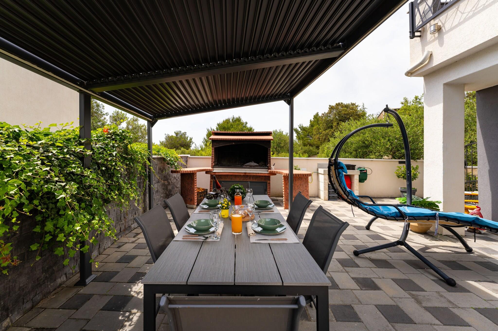 Denne moderne lejlighed med privat pool ligger i den rolige kystby Zaboric nær Sibenik, kun 350 meter fra den nærmeste stenstrand. Omgivet af en fredelig atmosfære er det det perfekte sted for par eller små familier, der søger afslapning væk fra sommerens folkemængder. Lejligheden ligger i stueetagen og har et komfortabelt soveværelse, et moderne badeværelse, et fuldt udstyret åbent køkken og en lys stue med spiseplads og direkte adgang til en privat terrasse. Udenfor kan gæsterne nyde den rummelige, indhegnede have med privat pool, liggestole og en stor overdækket terrasse, der er indrettet til udendørs spisning. Der er også grillfaciliteter og privat parkering til to biler samt hurtigt WiFi, der sikrer et behageligt ophold. En kort gåtur derfra finder du en købmand, en café og en lokal restaurant, der serverer traditionelle dalmatiske retter. Kun 11 km adskiller ejendommen fra den historiske by Šibenik, hvor du kan udforske charmerende stengader, strandpromenader og kulturarv. Naturelskere vil helt sikkert nyde et besøg i Krka Nationalpark, der ligger kun 20 kilometer fra ejendommen og er kendt for sine vandfald og maleriske vandrestier. Både Split og Zadar ligger inden for en times kørsel, hvilket gør lejligheden til et praktisk udgangspunkt for at udforske den dalmatiske kyst. Dette veludstyrede feriehus kombinerer komfort, privatliv og en fantastisk beliggenhed tæt på havet – perfekt til en afslappende ferie ved Middelhavet.